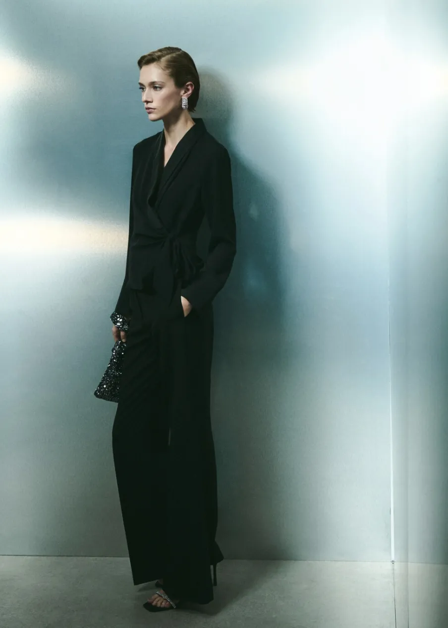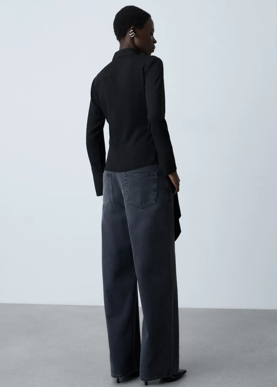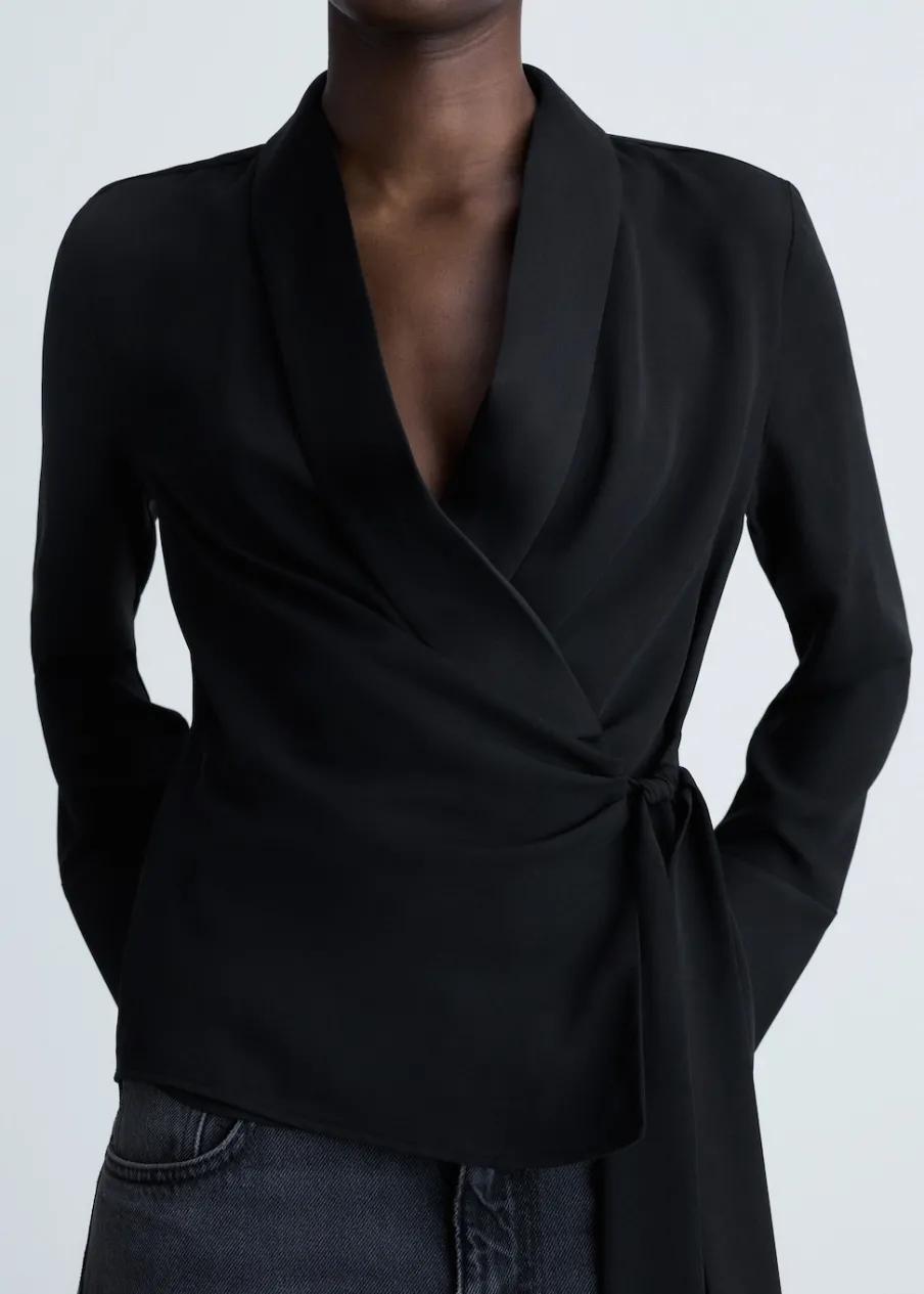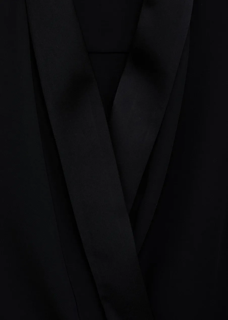 Satynowa tkanina. Model prosty. Model zakładany. Zakładany kołnierz. Dekolt w szpic z kołnierzykiem. Długi rękaw. Wiązanie z boku. Modelka ma 181 cm wzrostu i nosi rozmiar S/36.