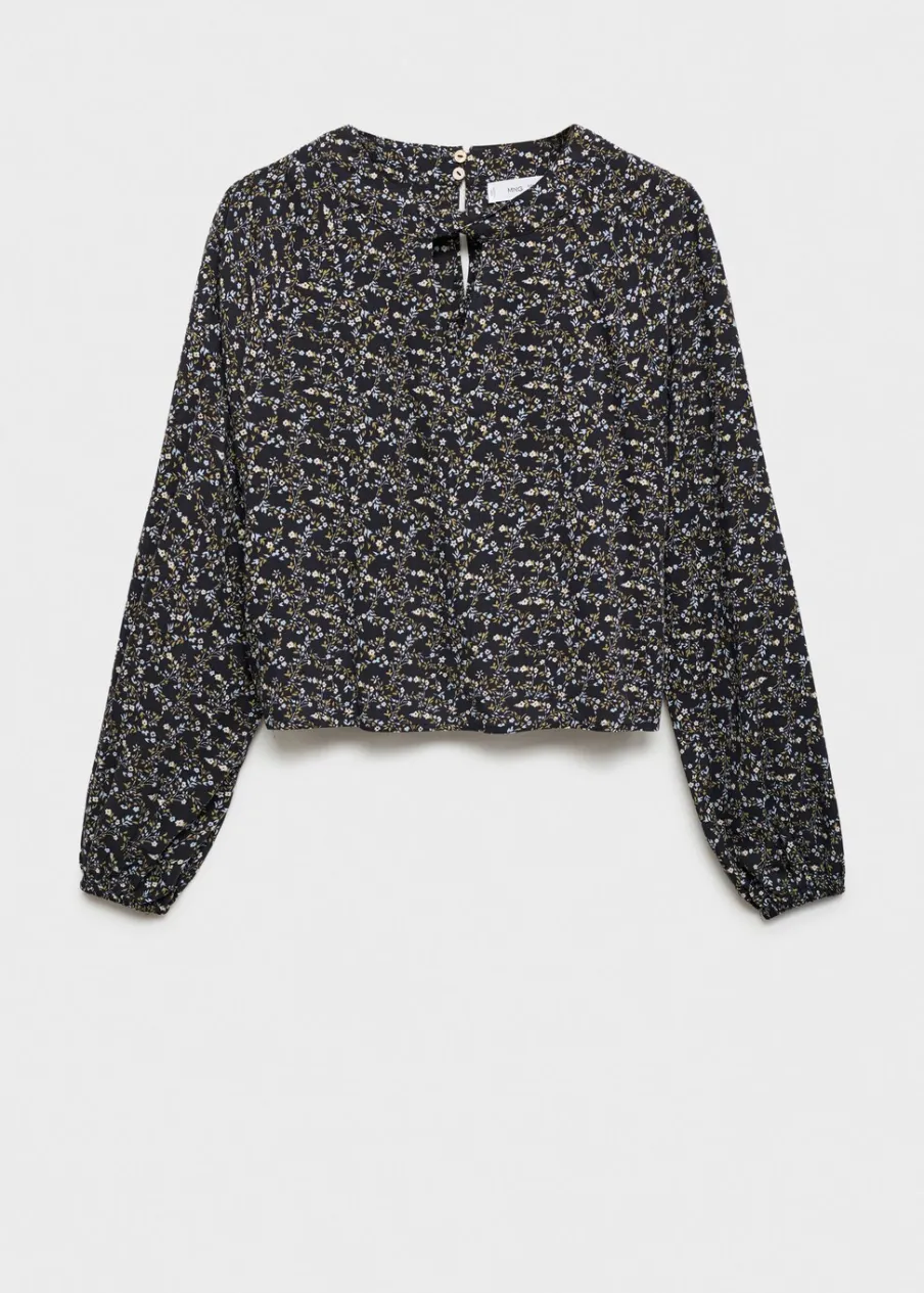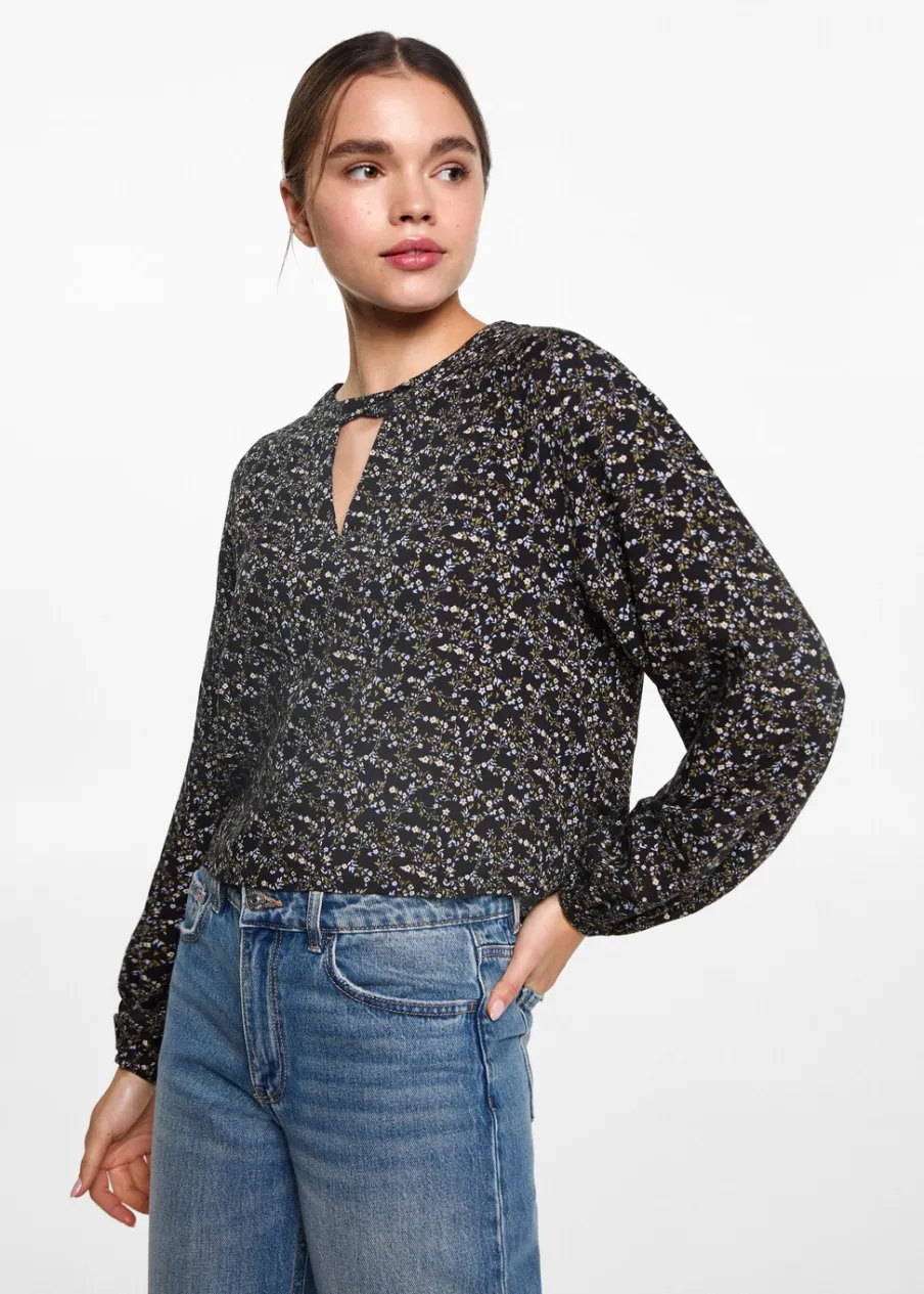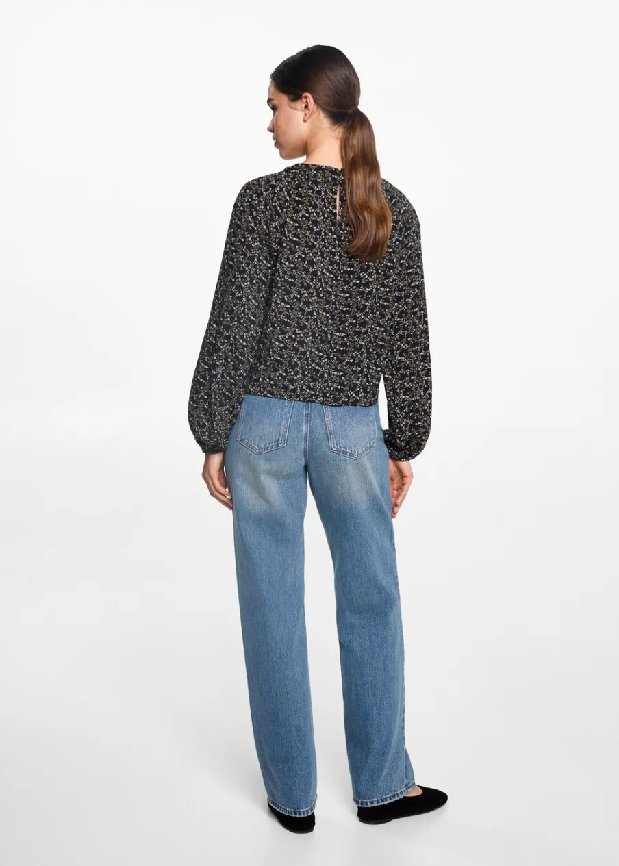 Model prosty. Kwiatowy wzór. Dekolt V. Długi bufiasty rękaw. Zapięcie na guzik z tyłu. Modelka ma 172 cm wzrostu i nosi rozmiar M.