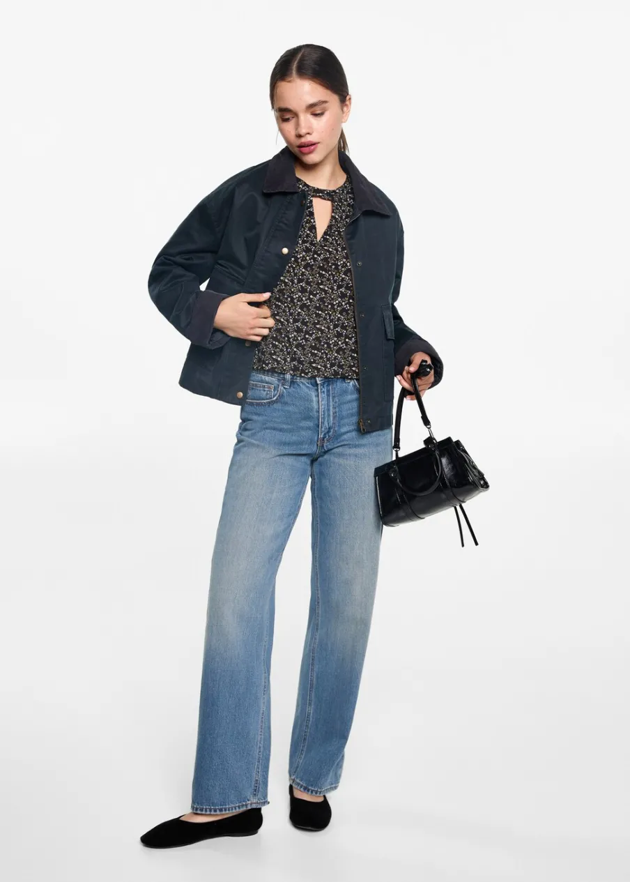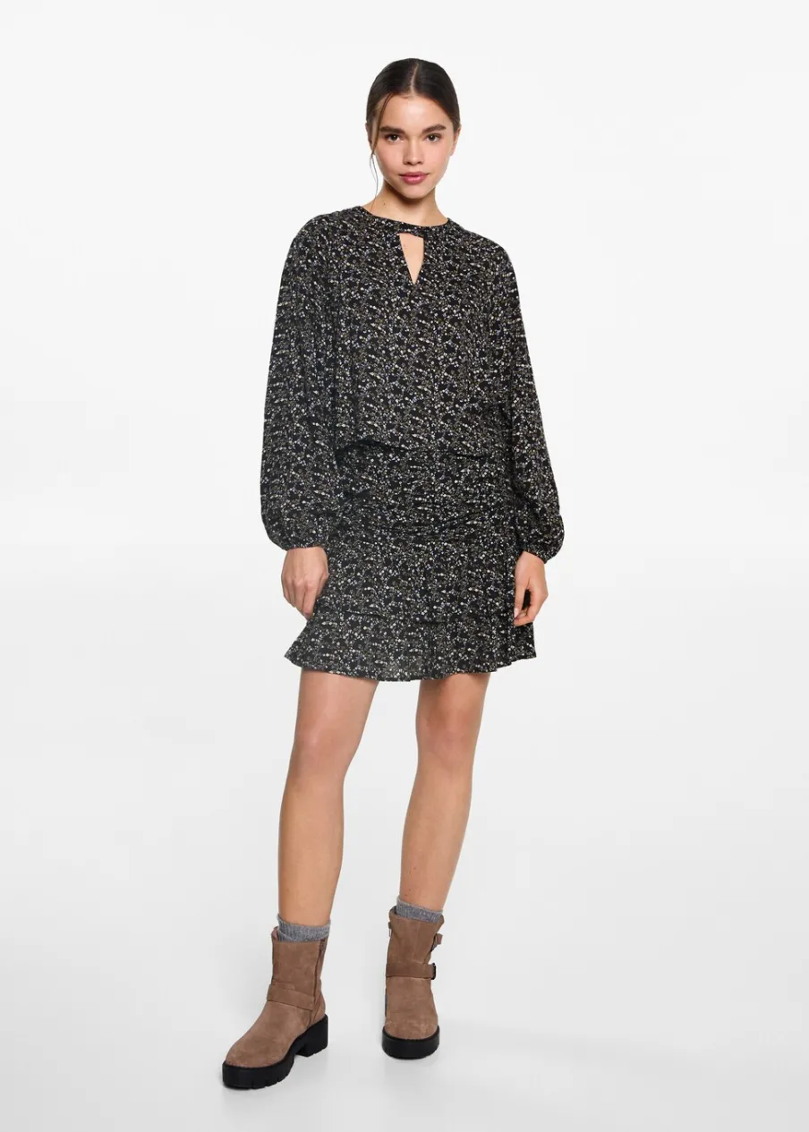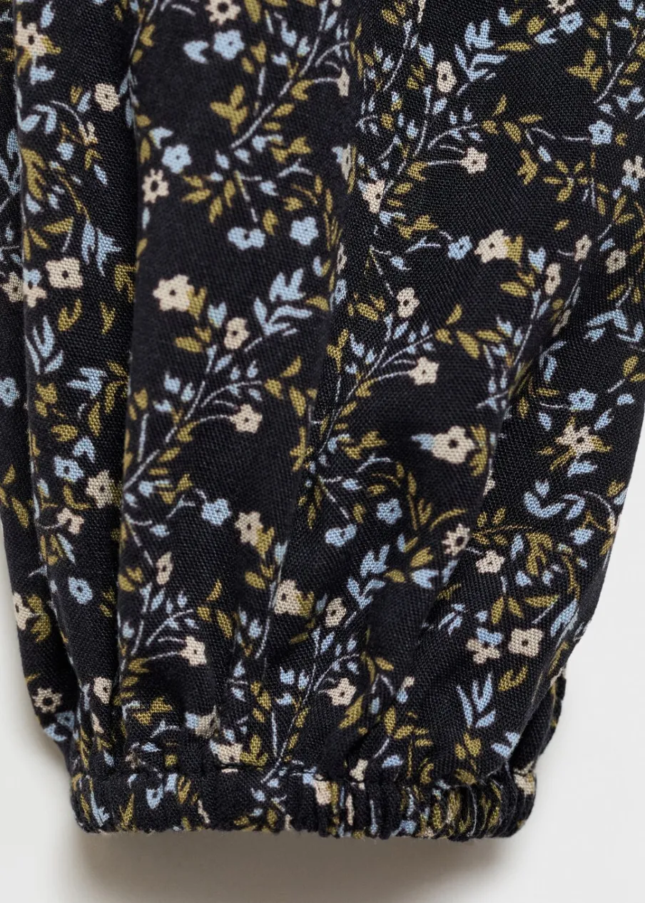 Model prosty. Kwiatowy wzór. Dekolt V. Długi bufiasty rękaw. Zapięcie na guzik z tyłu. Modelka ma 172 cm wzrostu i nosi rozmiar M.