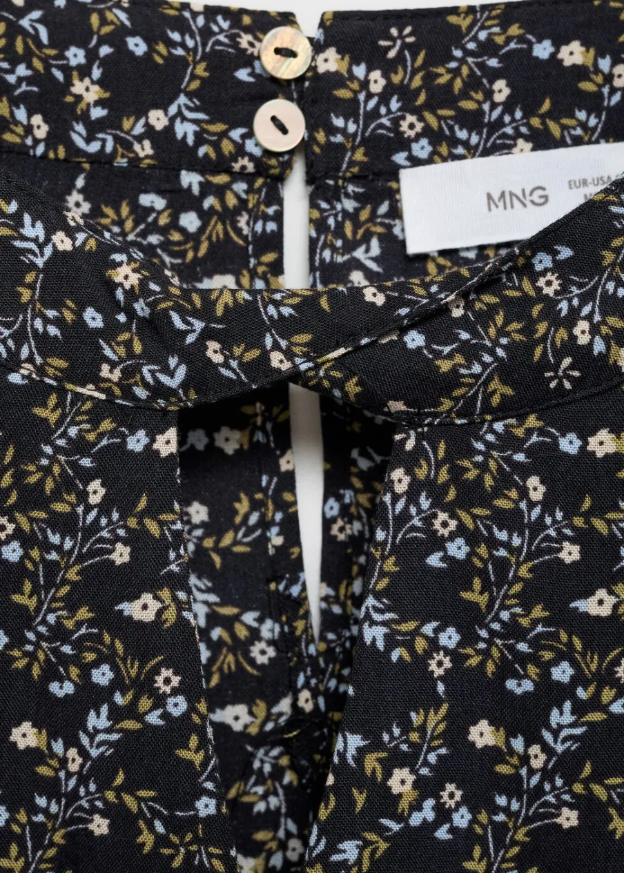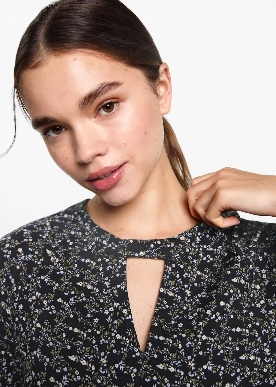 OpisModel prosty. Kwiatowy wzór. Dekolt V. Długi bufiasty rękaw. Zapięcie na guzik z tyłu. Modelka ma 172 cm wzrost…