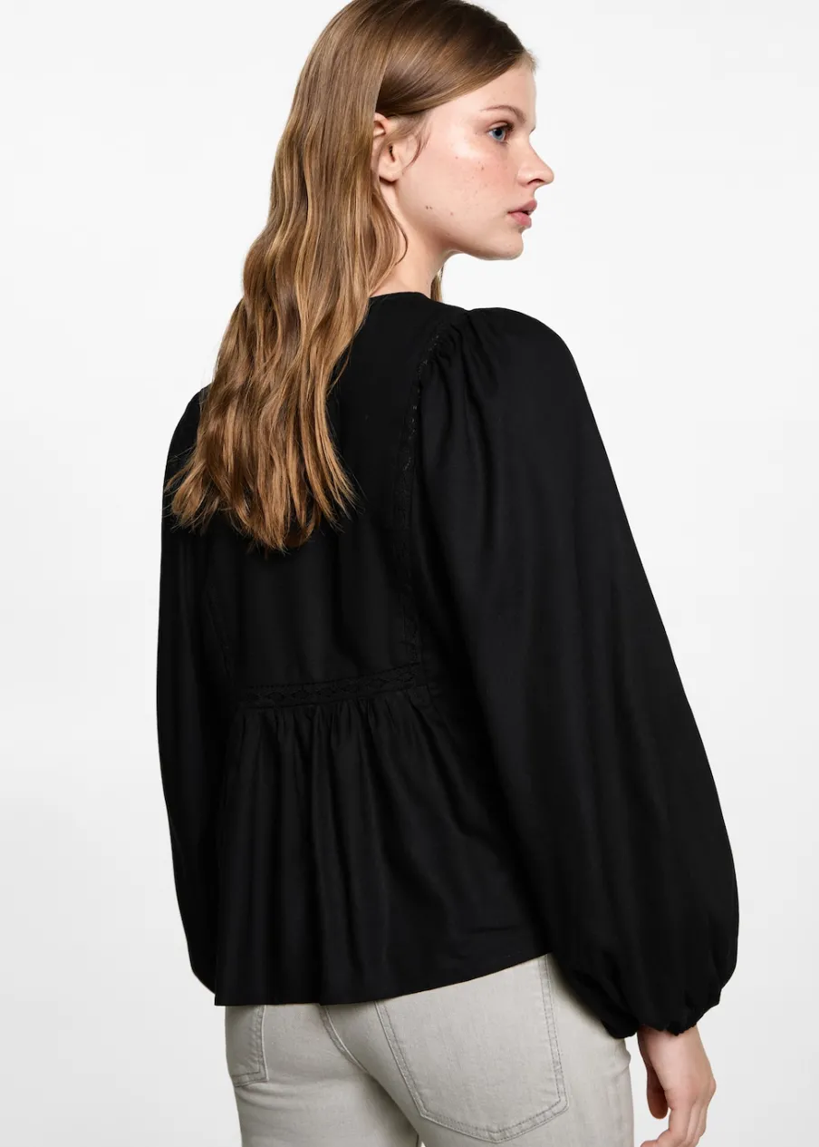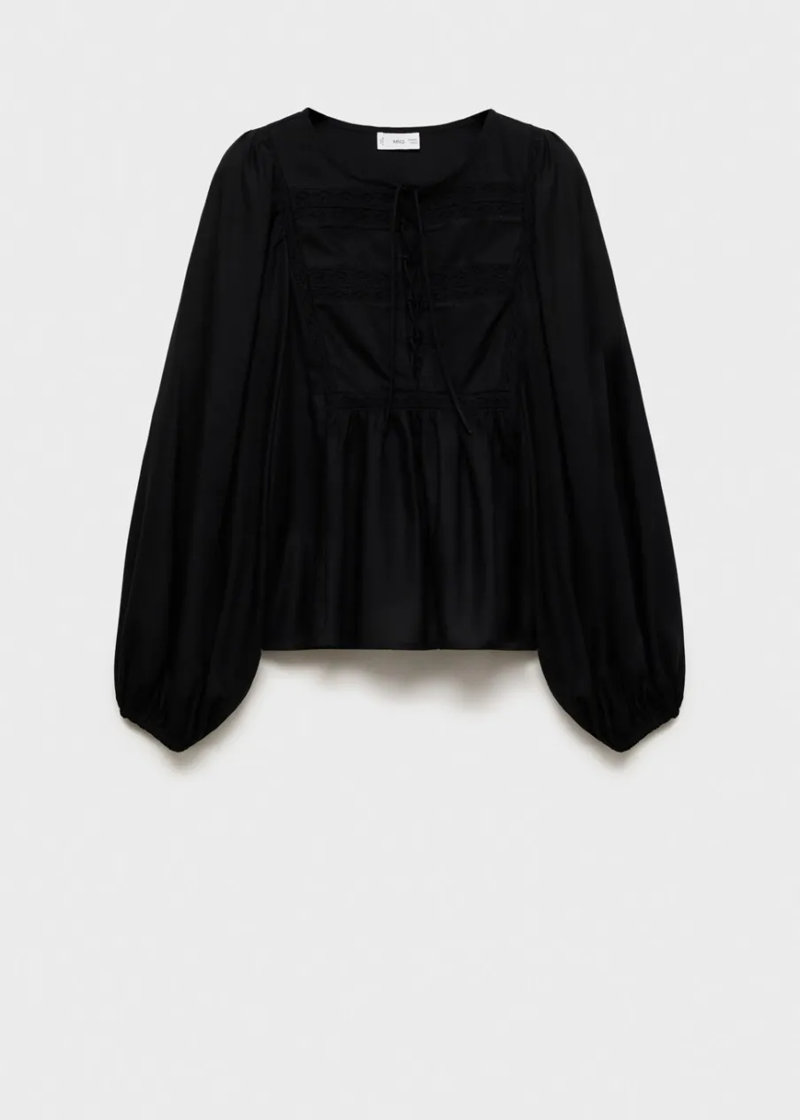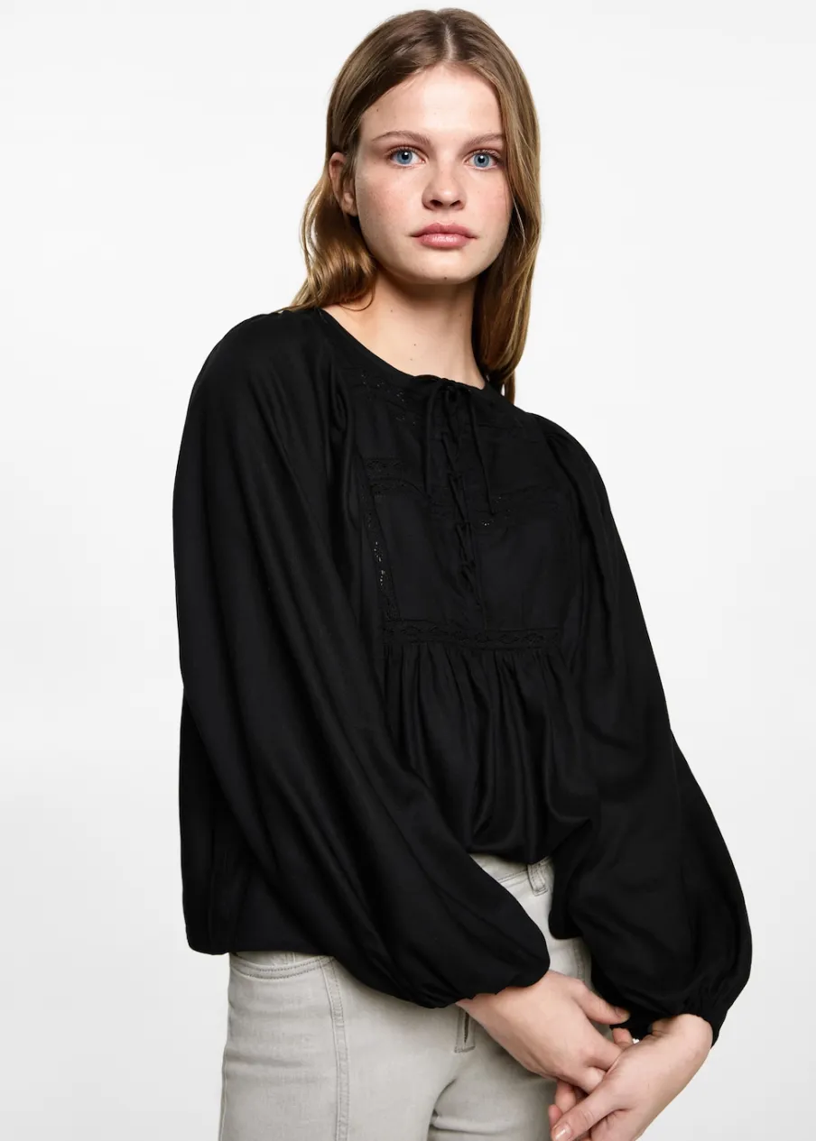 Okrągły dekolt. Koronkowe wstawki. Długi bufiasty rękaw. Wiązanie na szyi. Marszczone mankiety. Marszczona talia.