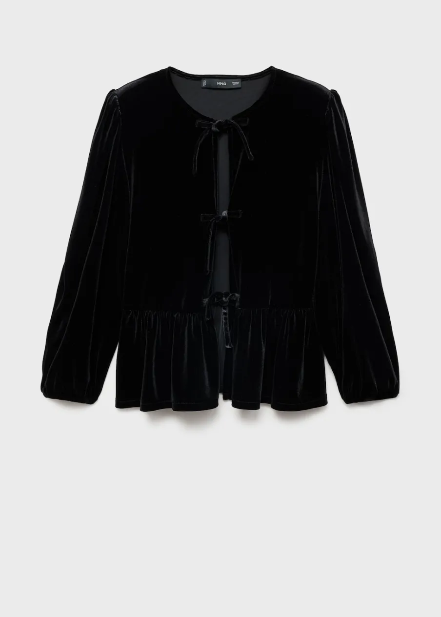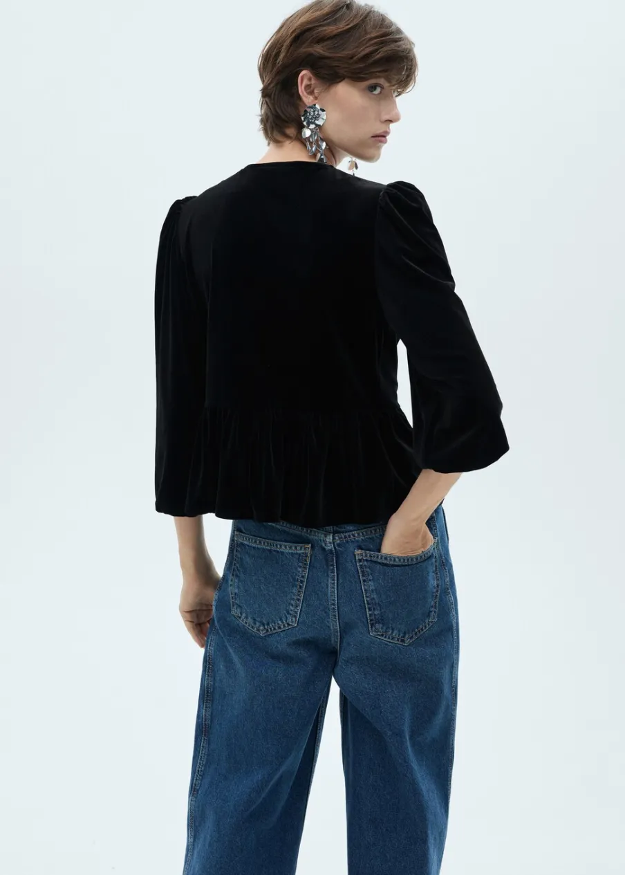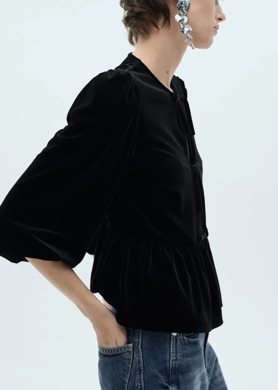 Aksamitna tkanina. Model prosty. Okrągły dekolt. Długi rękaw. Długi bufiasty rękaw. Wiązanie z przodu. Kolekcja wizytowa.