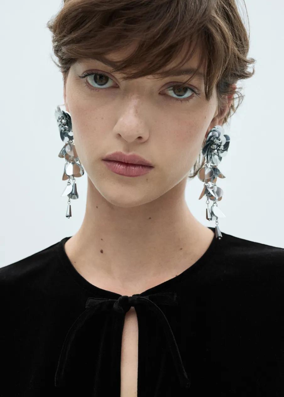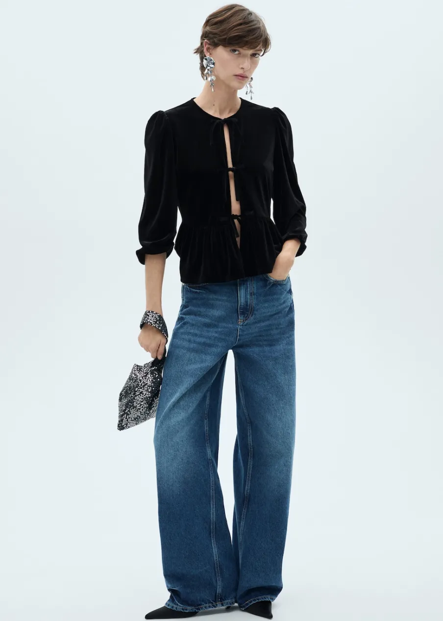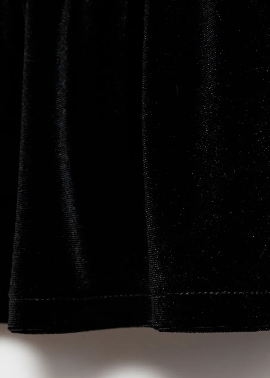 Aksamitna tkanina. Model prosty. Okrągły dekolt. Długi rękaw. Długi bufiasty rękaw. Wiązanie z przodu. Kolekcja wizytowa.
