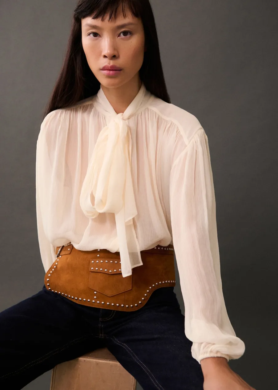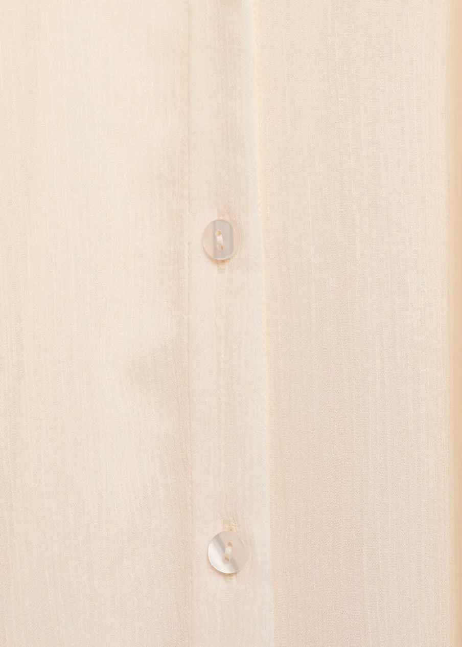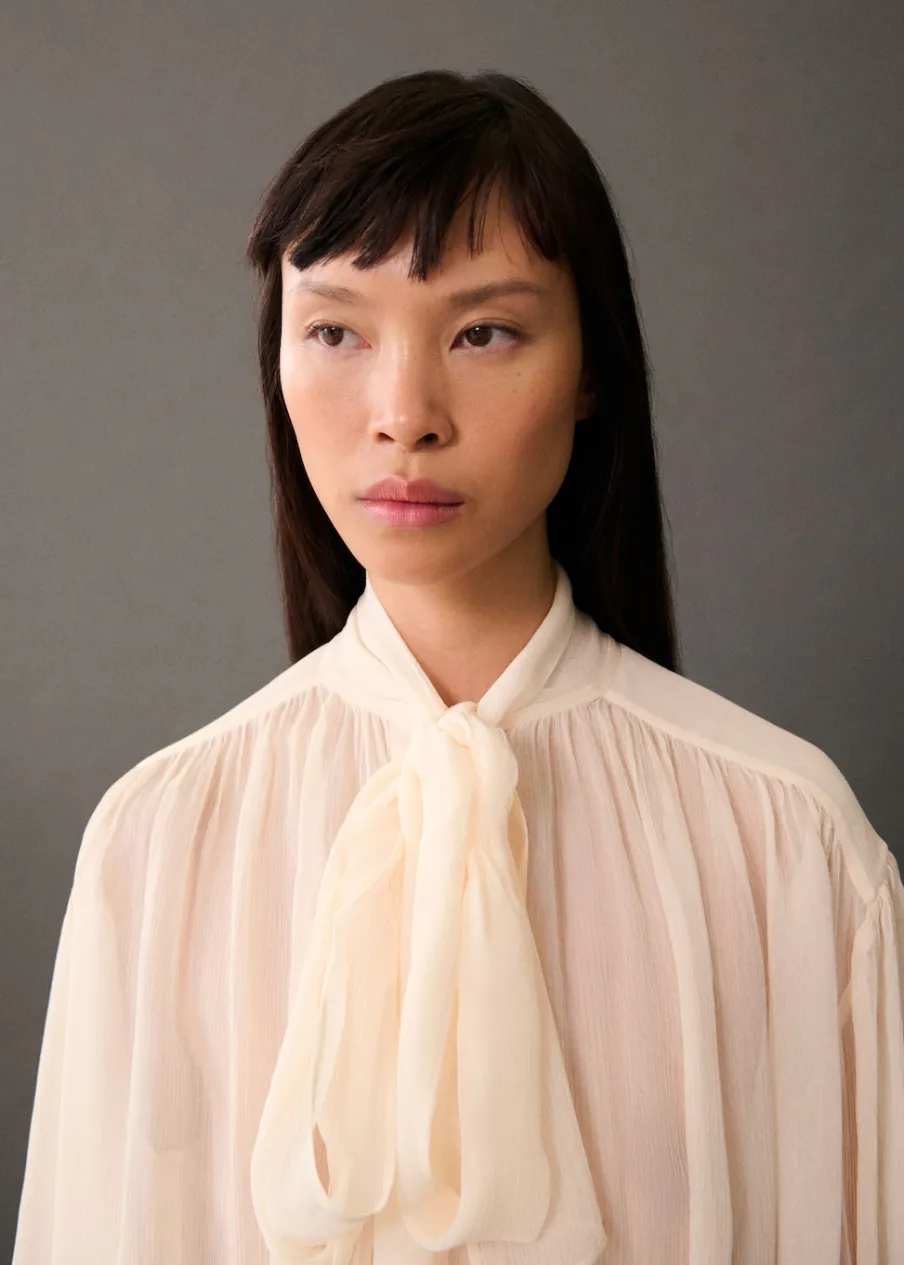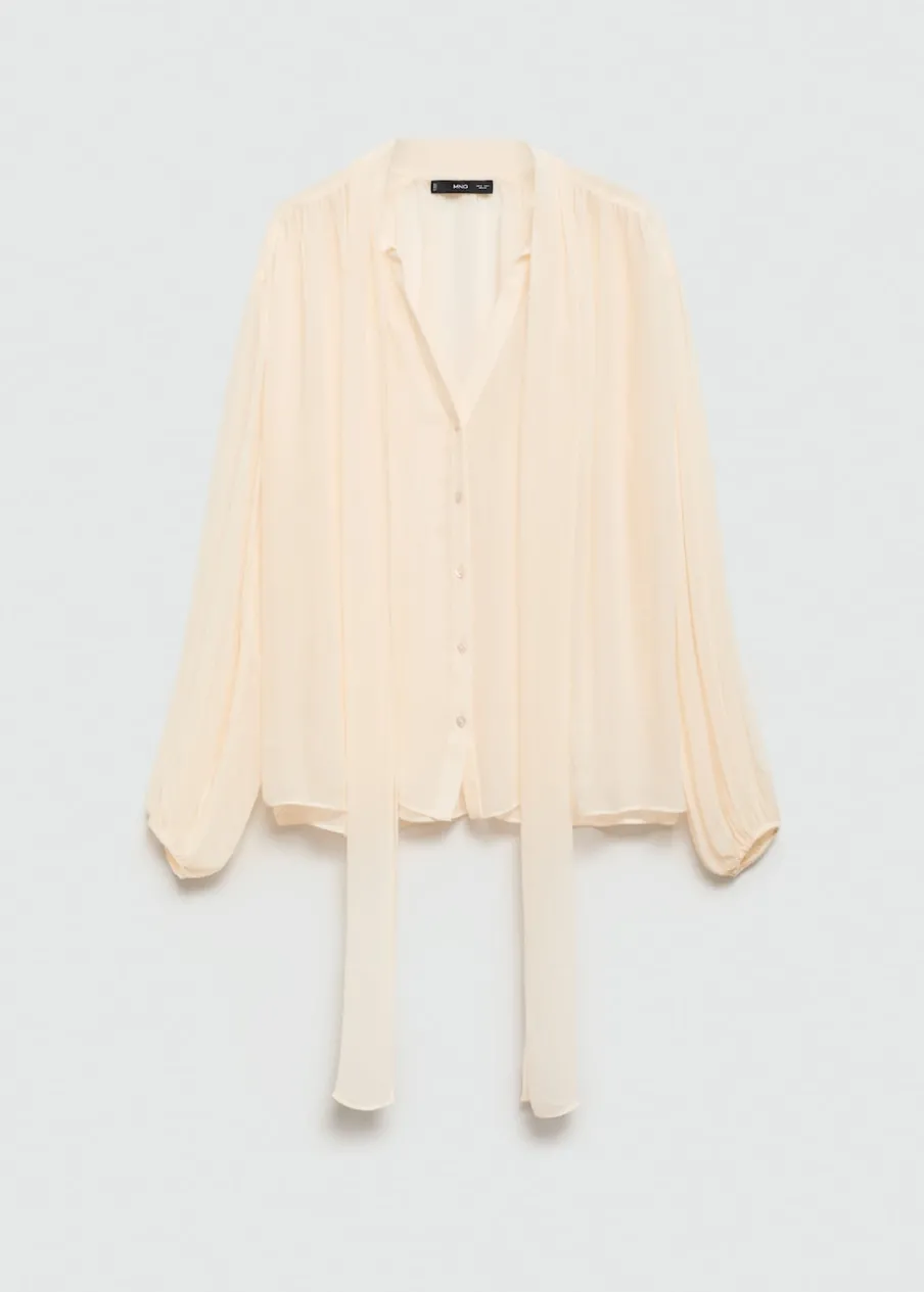 Lejąca tkanina. Półprzezroczysta tkanina. Szarfa pod szyją. Długi rękaw. Bufiasty rękaw. Modelka ma 177 cm wzrostu i nosi rozmiar S/36. Zapięcie na guziki z przodu.