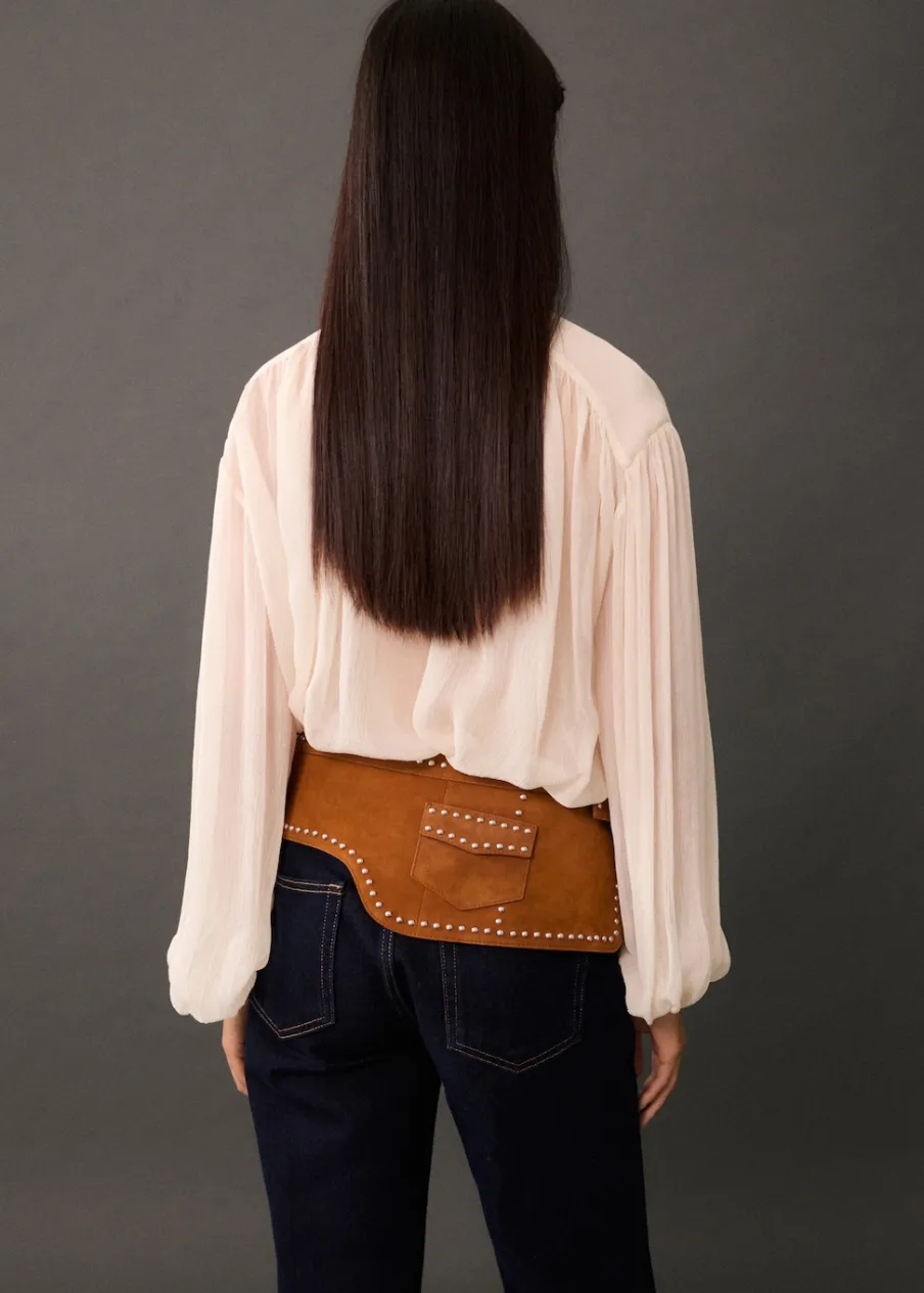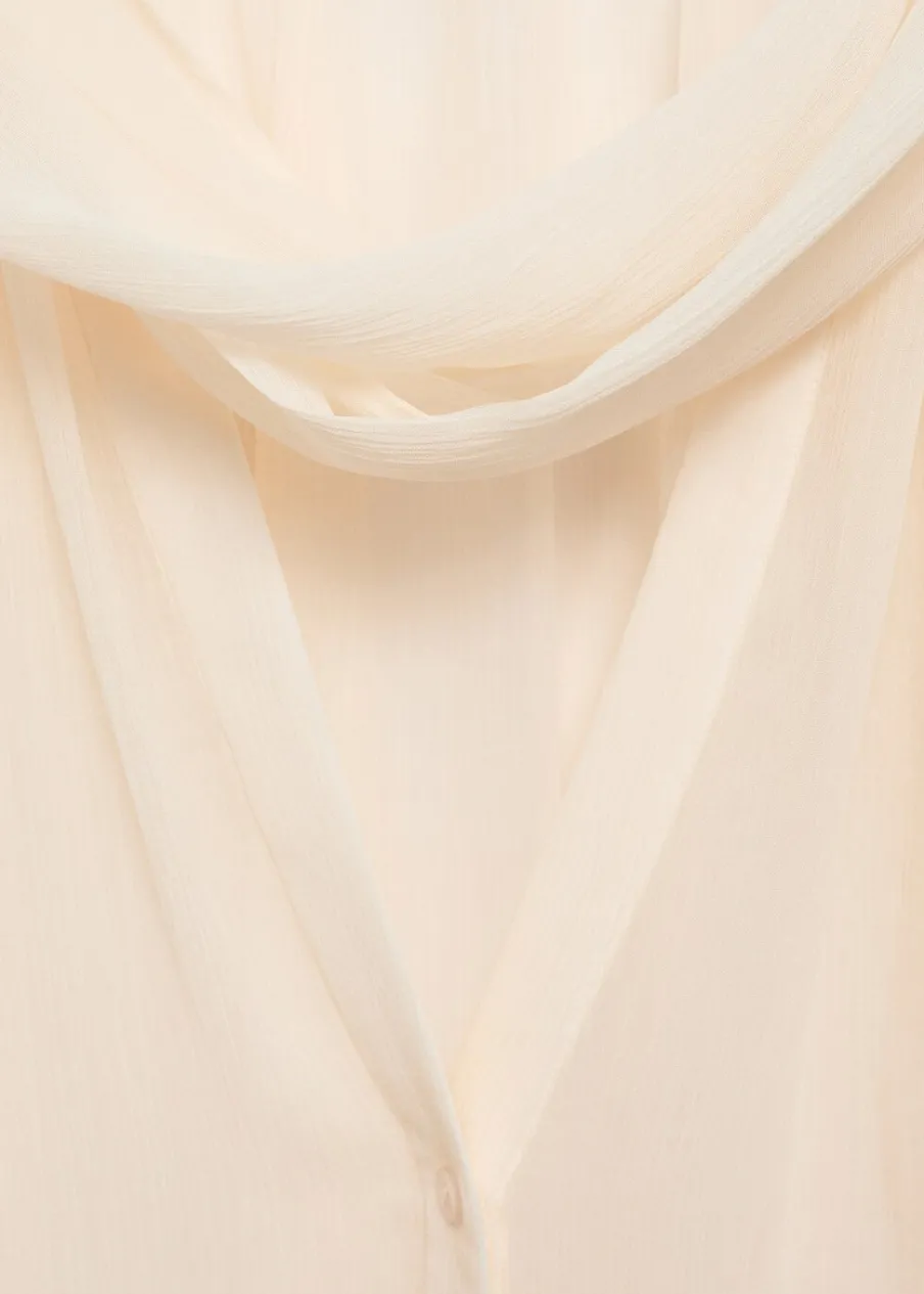 OpisLejąca tkanina. Półprzezroczysta tkanina. Szarfa pod szyją. Długi rękaw. Bufiasty rękaw. Modelka ma 177 cm wz…