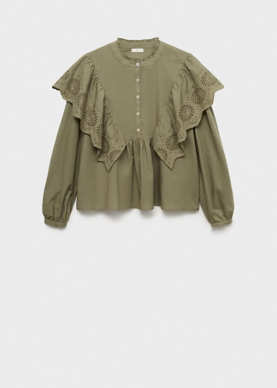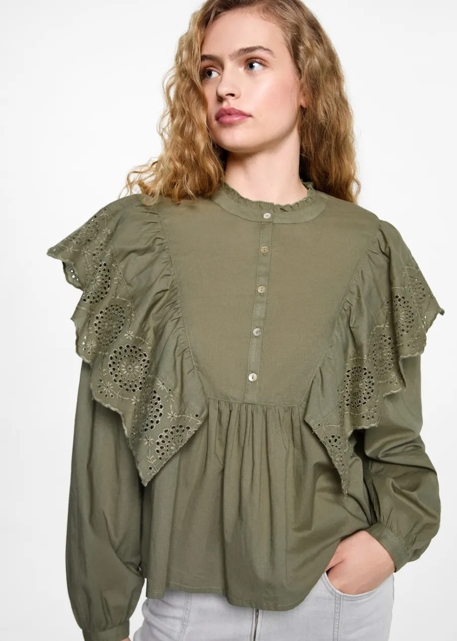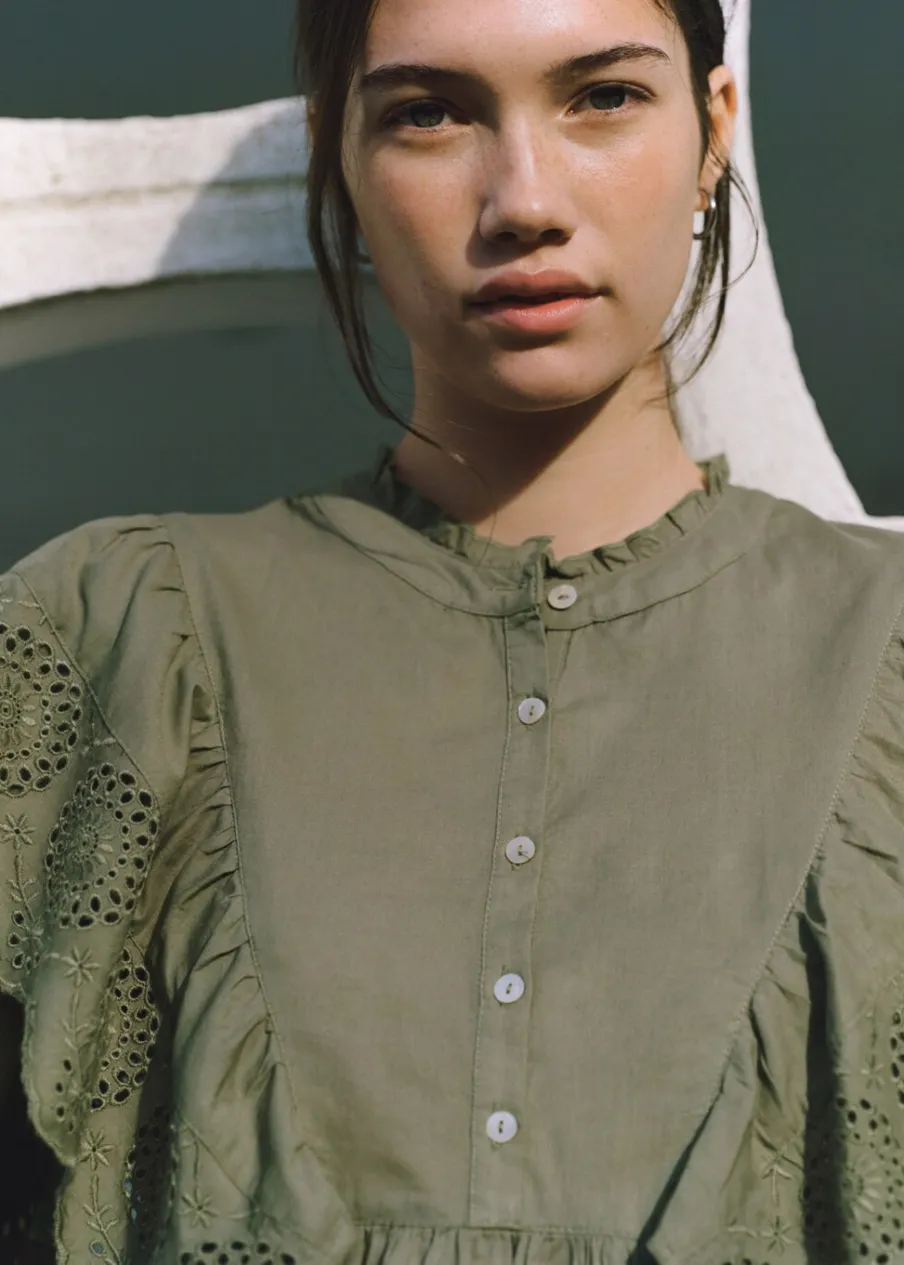 Tkanina z 100% bawełny. Tkanina z angielskim haftem. Okrągły dekolt z falbanką. Haftowana falbanka. Długi rękaw. Marszczona talia. Marszczone mankiety. Zapięcie na guziki z przodu.