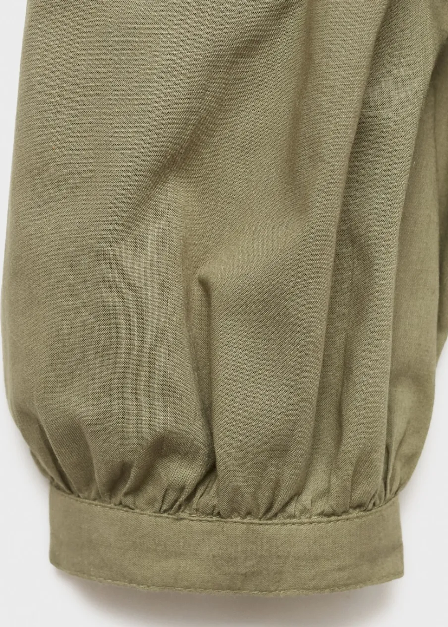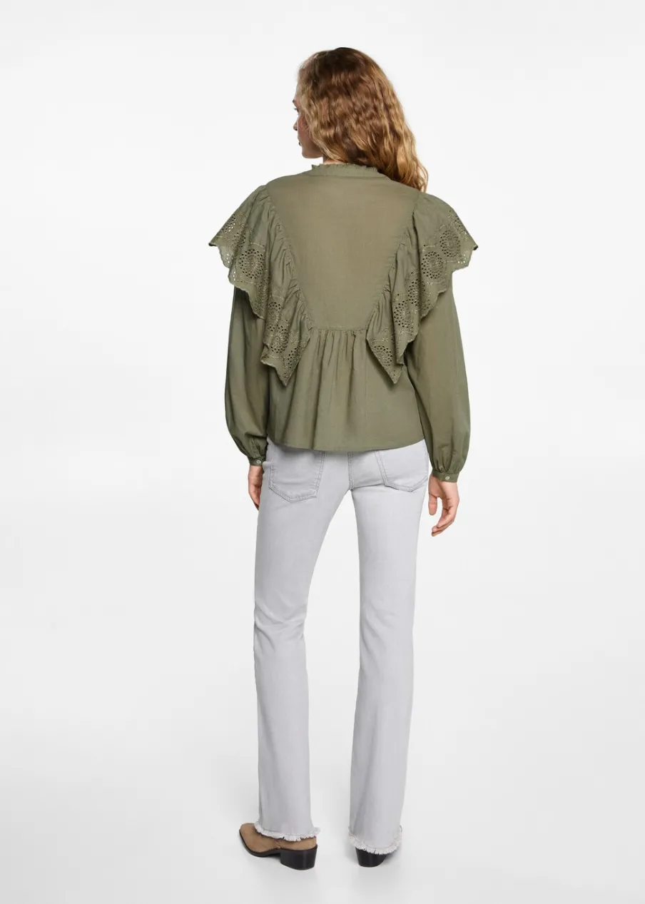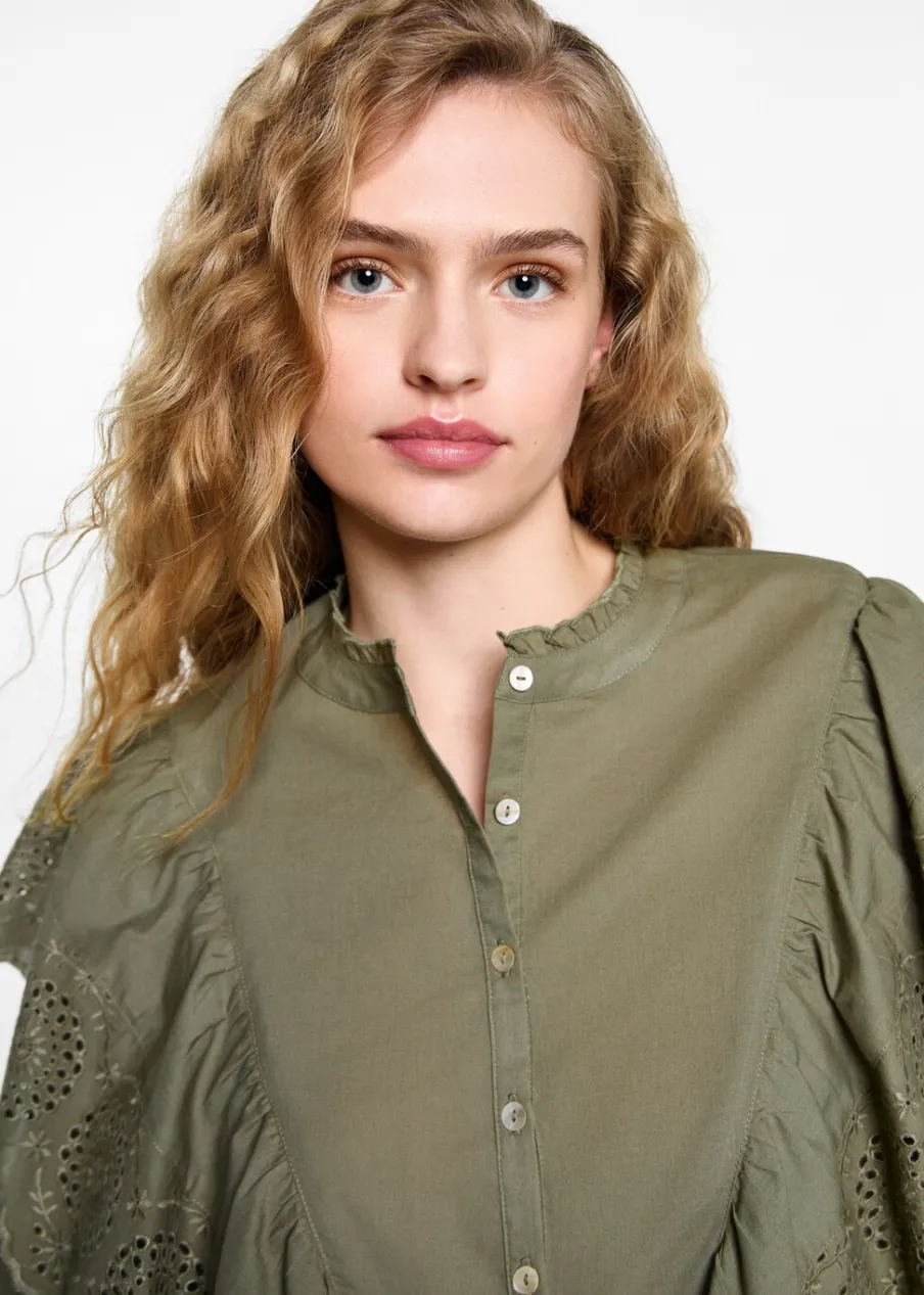 Tkanina z 100% bawełny. Tkanina z angielskim haftem. Okrągły dekolt z falbanką. Haftowana falbanka. Długi rękaw. Marszczona talia. Marszczone mankiety. Zapięcie na guziki z przodu.