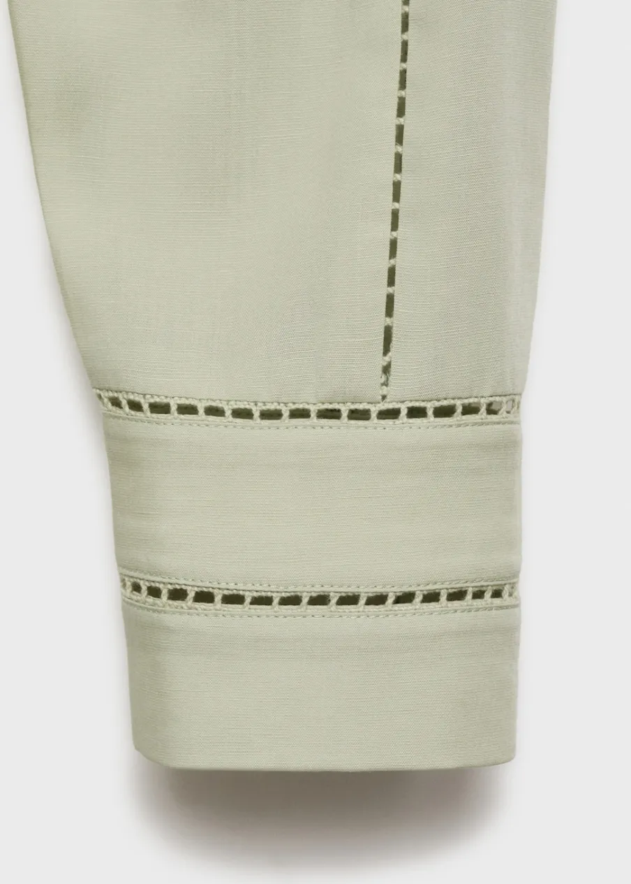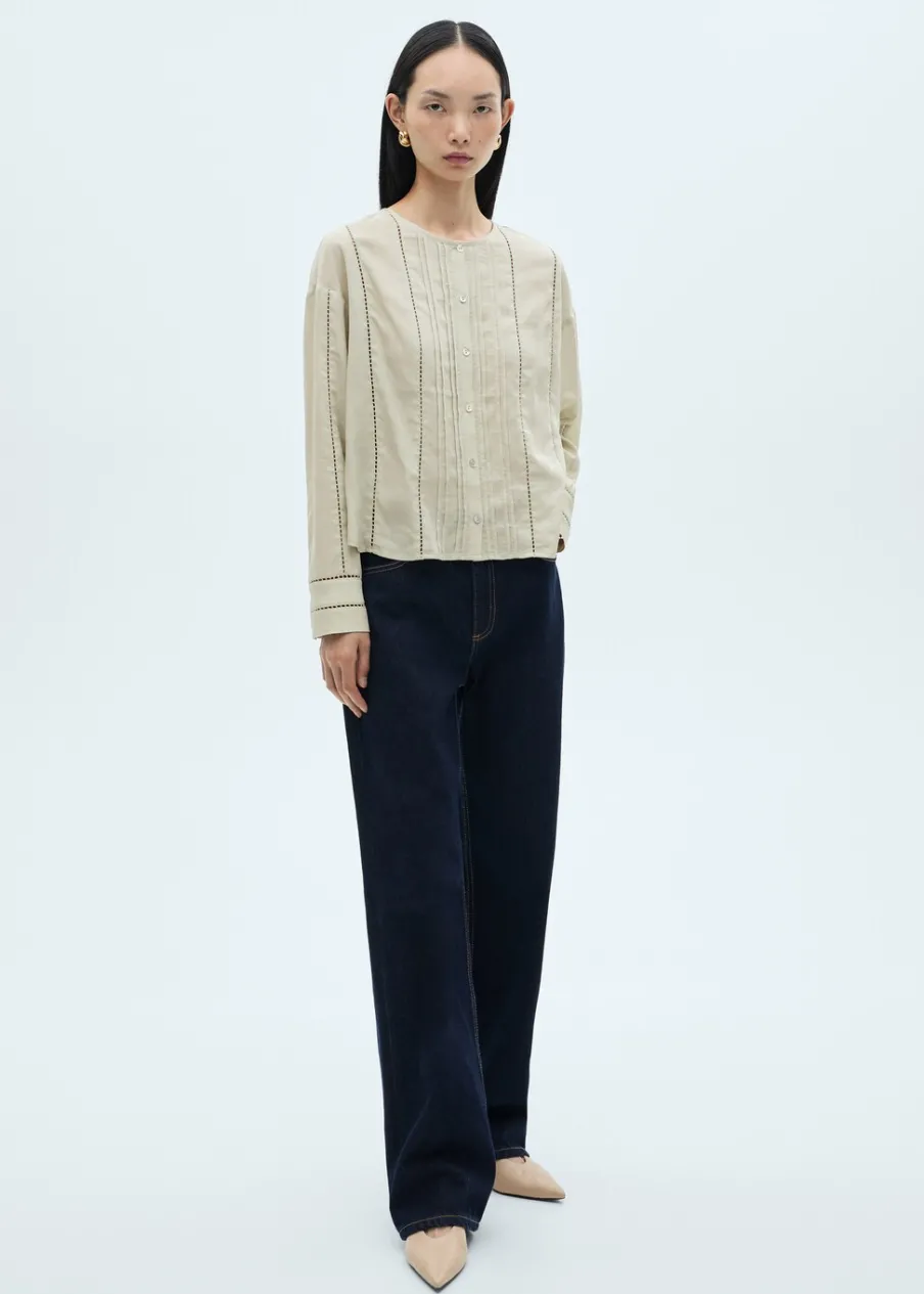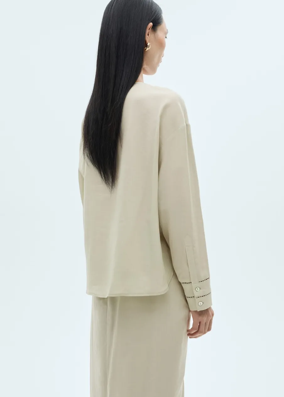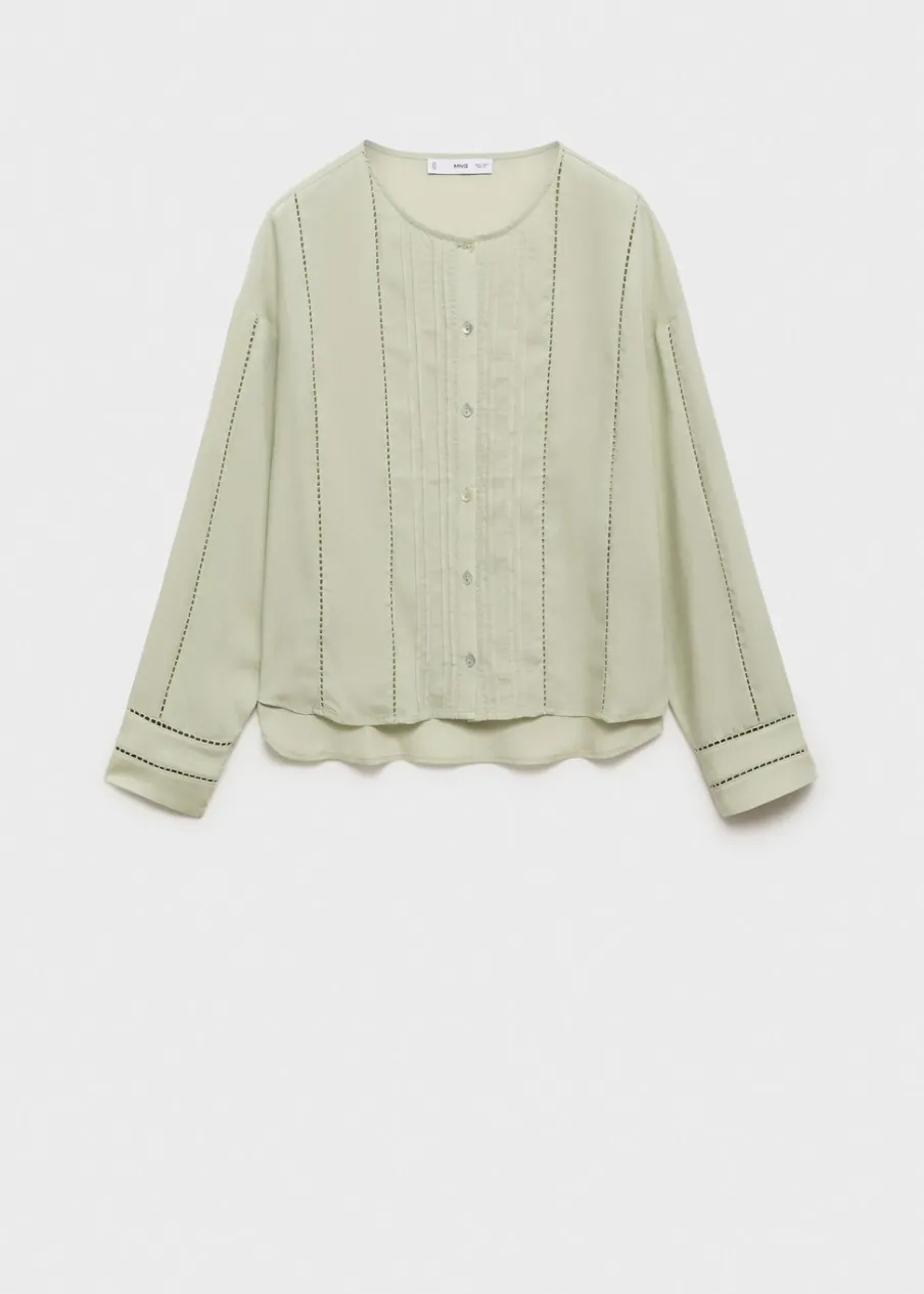 Cienka tkanina. Tkanina mieszana z lnu i lyocellu. Model prosty. Okrągły dekolt. Długi rękaw z guzikami na mankietach. Zapięcie z przodu na guziki. Ażurowe detale. Zapięcie z przodu. Model standardowy. Długi rękaw.