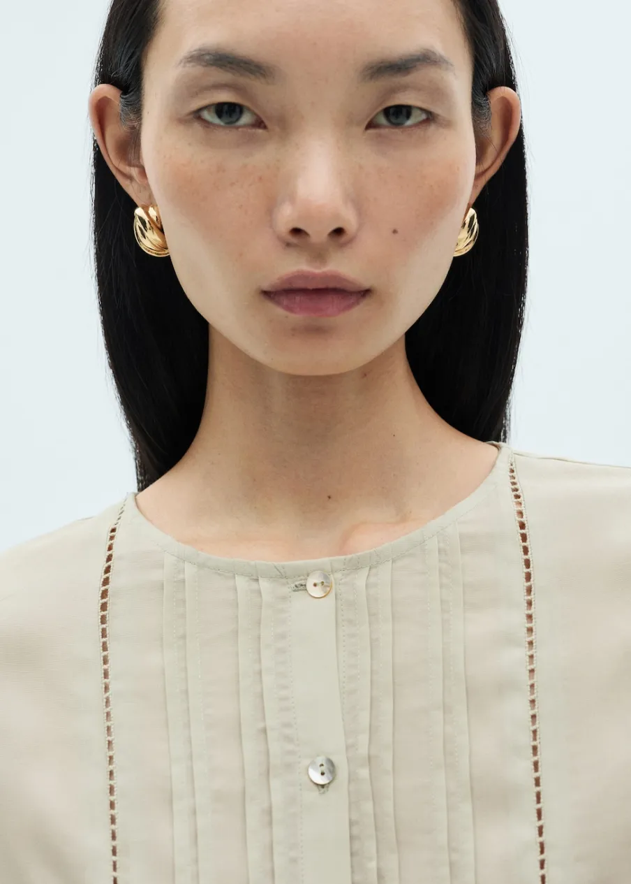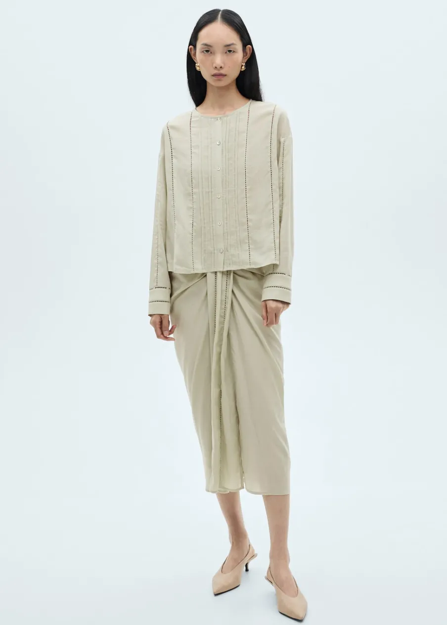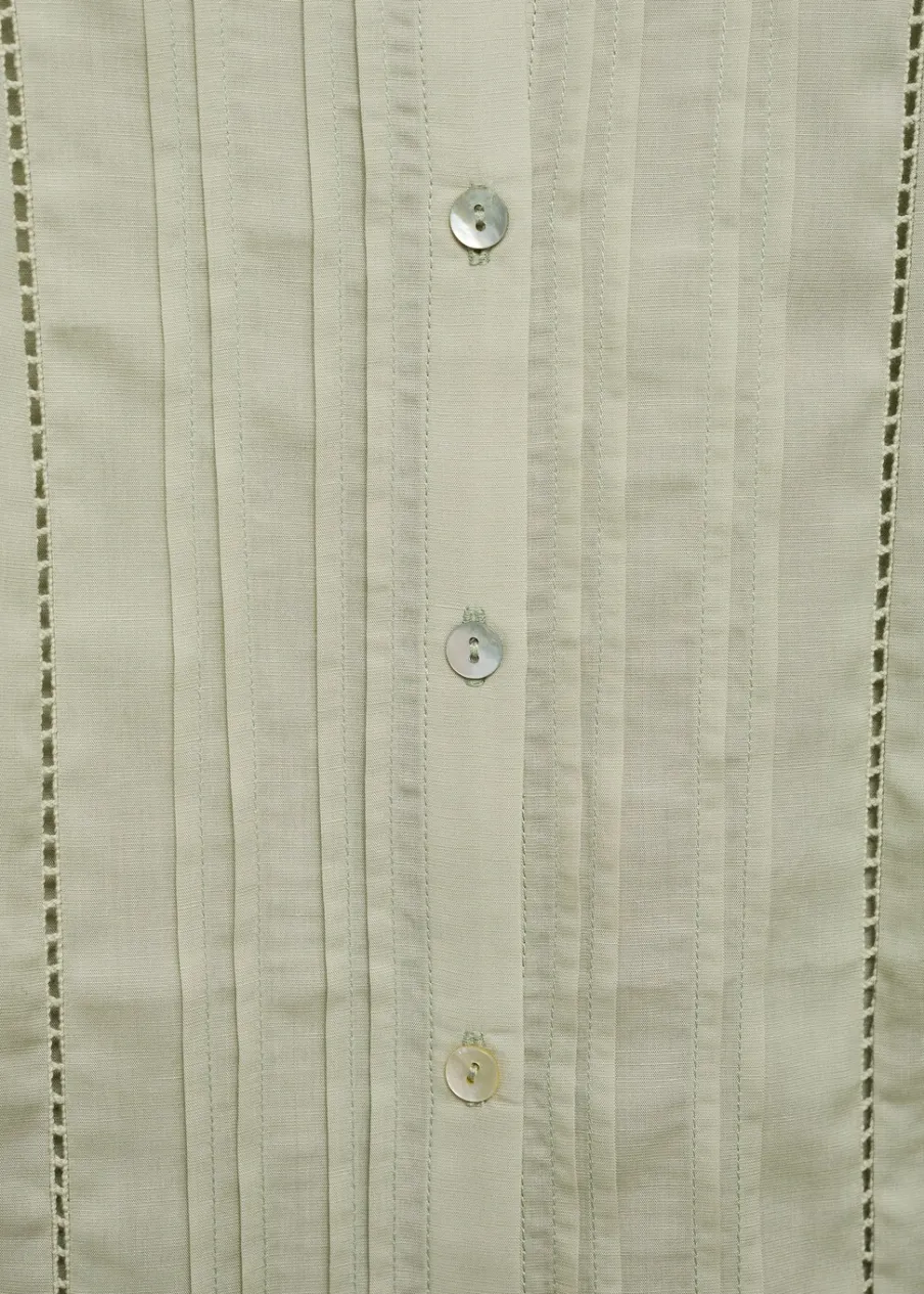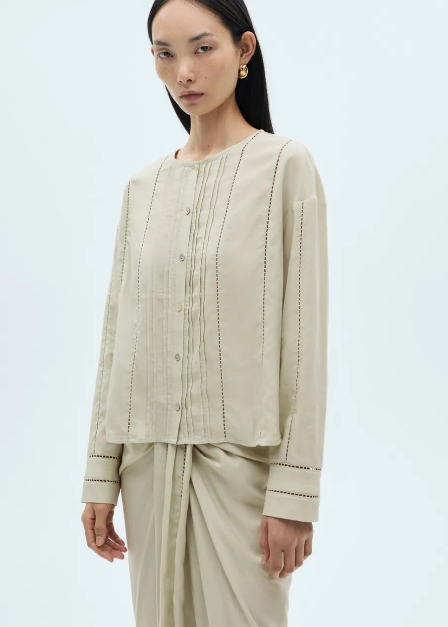 Cienka tkanina. Tkanina mieszana z lnu i lyocellu. Model prosty. Okrągły dekolt. Długi rękaw z guzikami na mankietach. Zapięcie z przodu na guziki. Ażurowe detale. Zapięcie z przodu. Model standardowy. Długi rękaw.