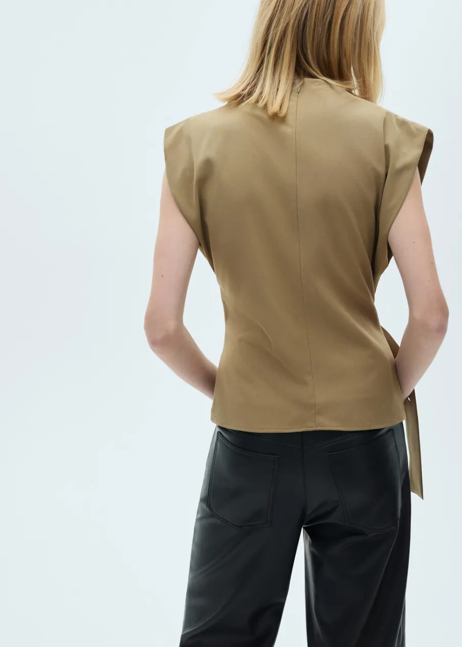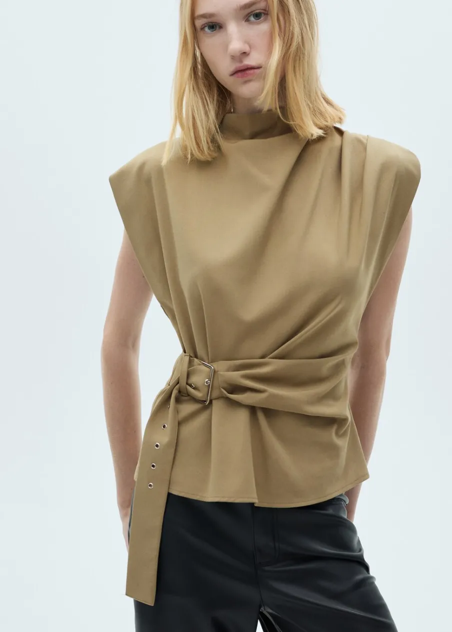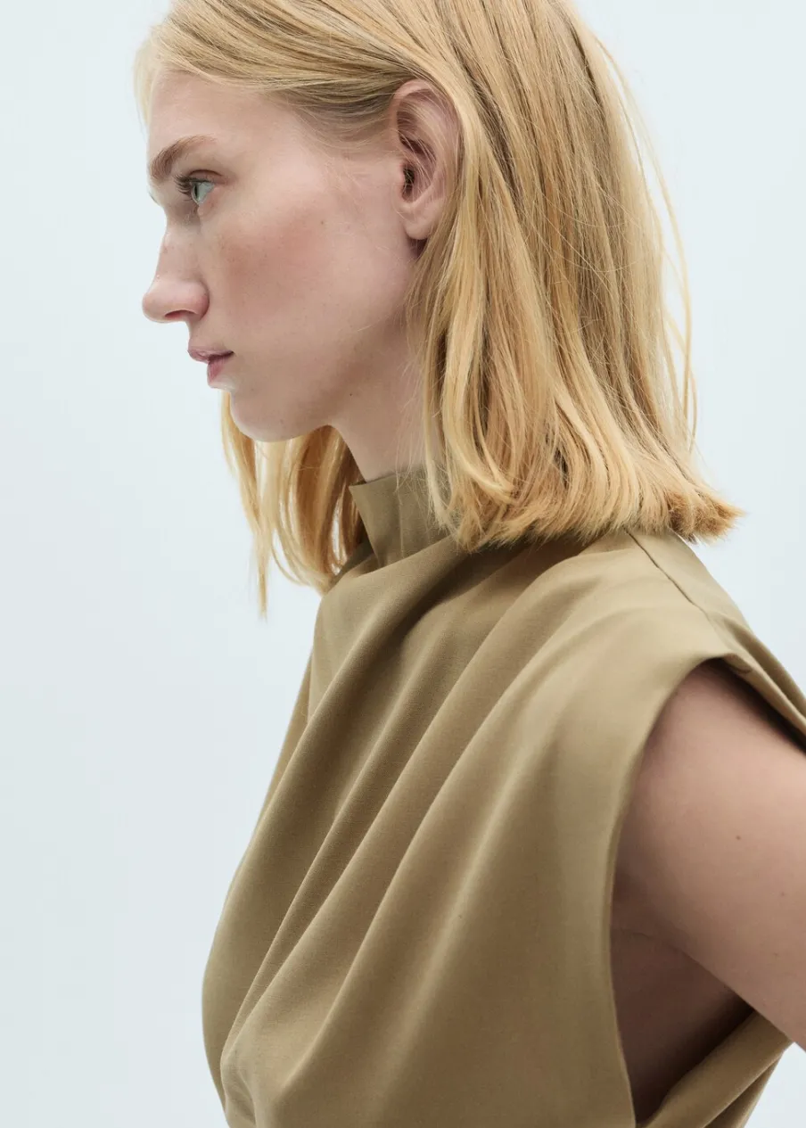 OpisLejąca tkanina. Model prosty. Półgolf. Poduszki na ramionach. Bez rękawów. Regulowany pasek. Zapięcie z tyłu …