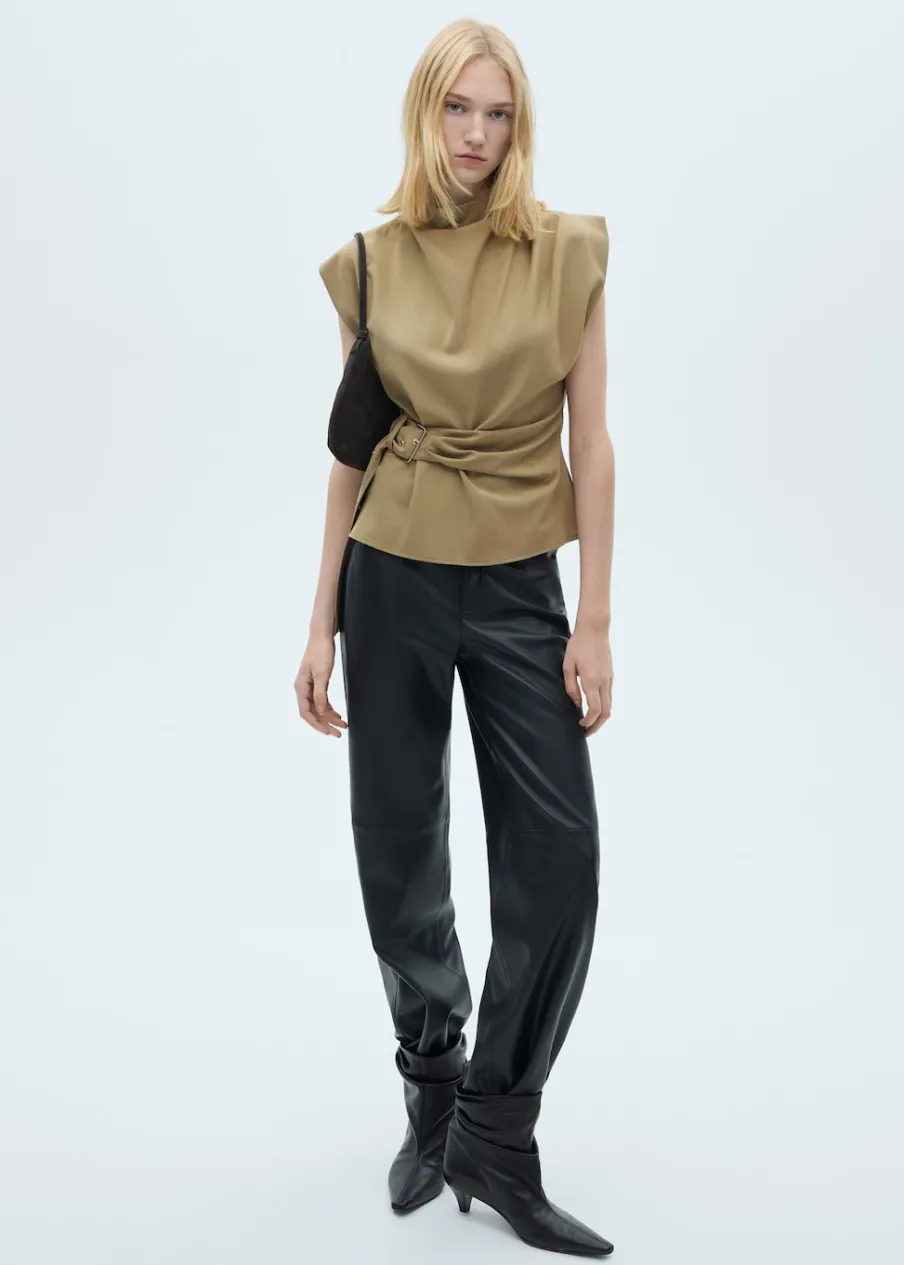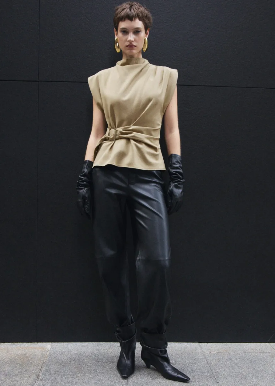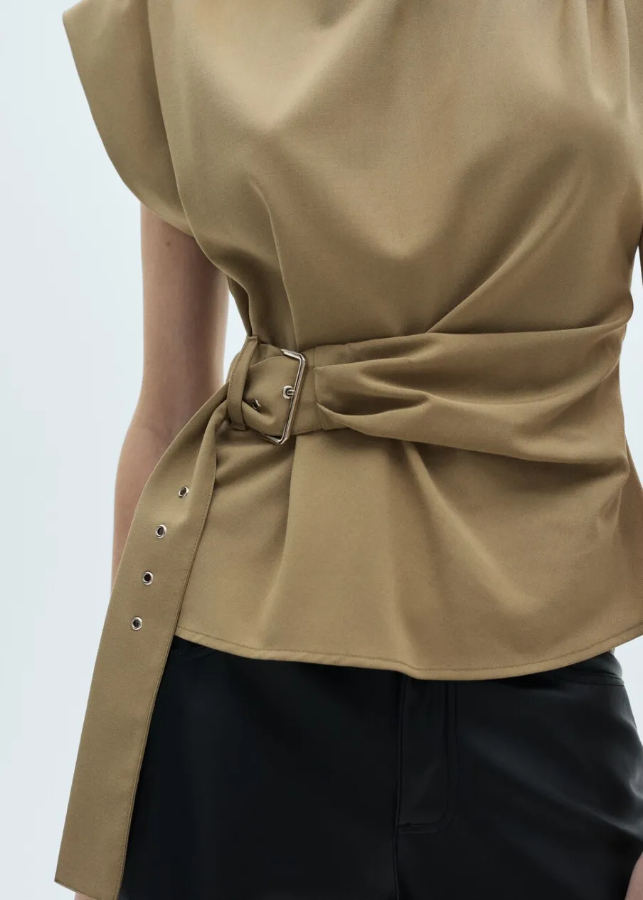 OpisLejąca tkanina. Model prosty. Półgolf. Poduszki na ramionach. Bez rękawów. Regulowany pasek. Zapięcie z tyłu …