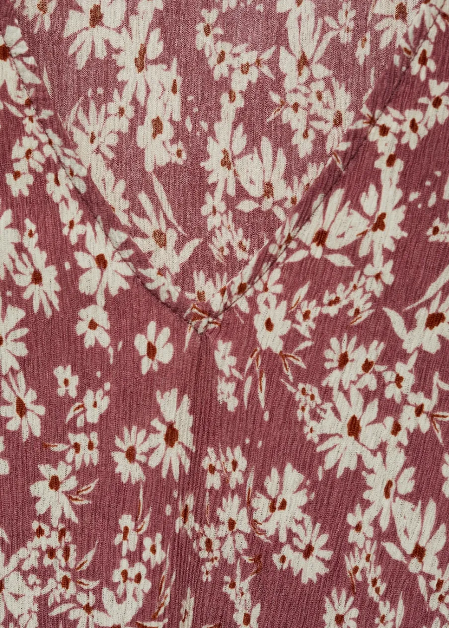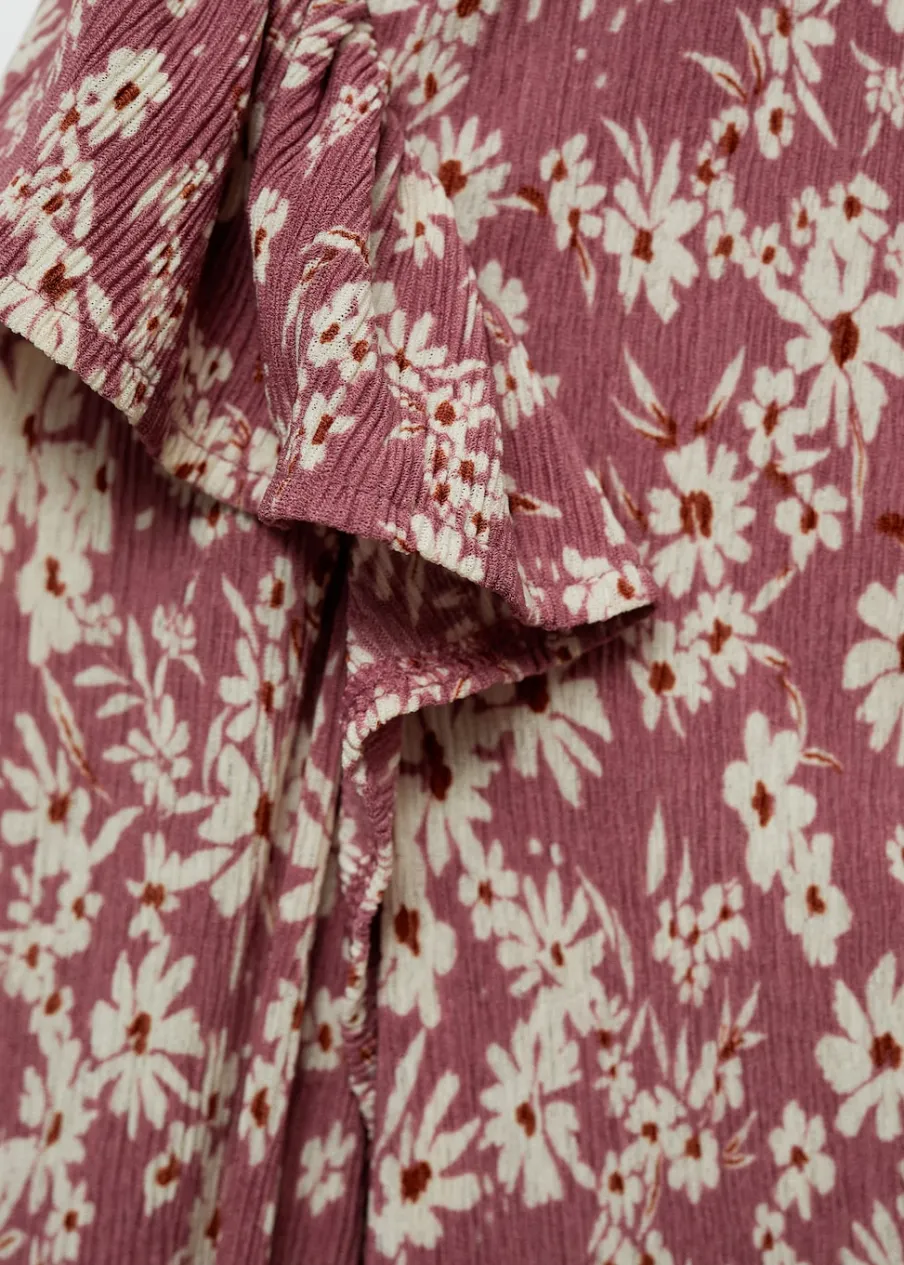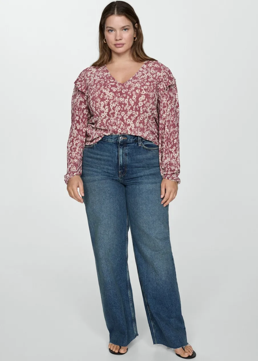 Lejąca tkanina. Model prosty. Dekolt V. Długi rękaw z elastycznymi mankietami. Falbanki na ramionach. Dostępne w Plus Size. Nadruk.