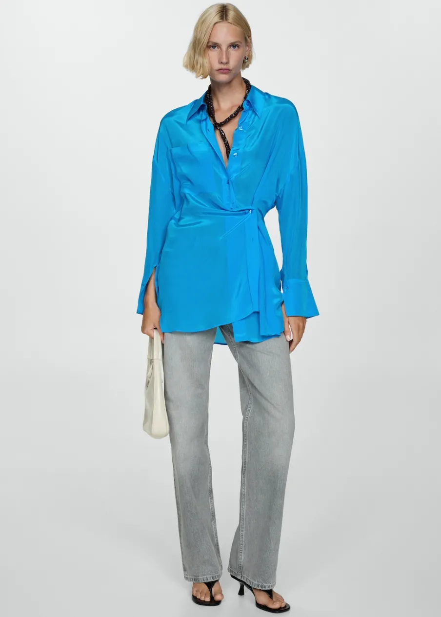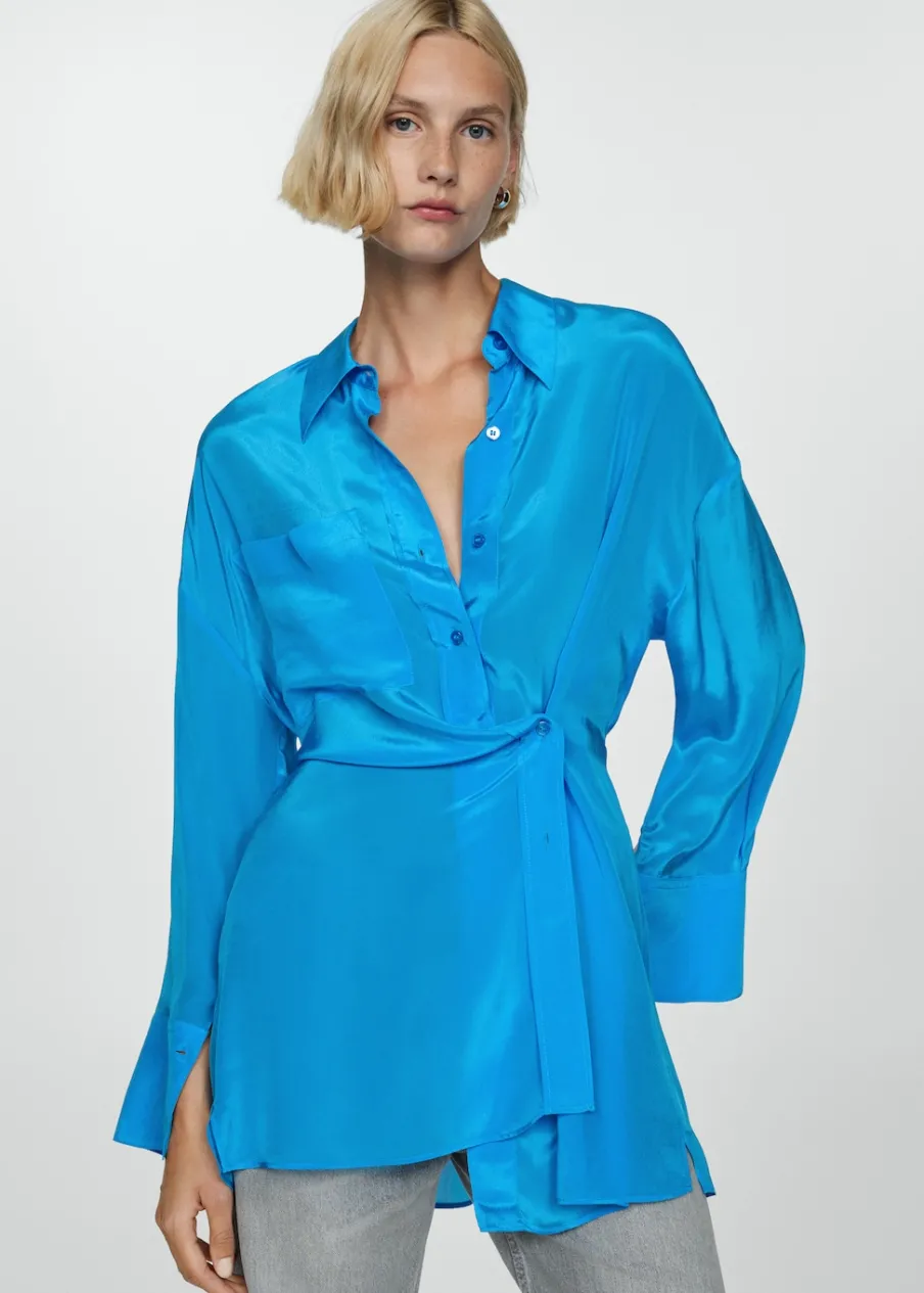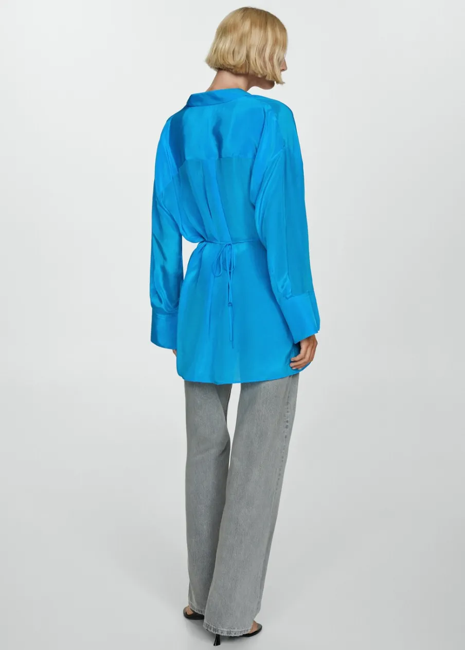 Lejąca tkanina. Satynowa tkanina. Model długi. Model prosty. Regulacja rozmiaru. Koszulowy kołnierz. Długi rękaw z guzikami na mankietach. Zapięcie z przodu na guziki. Asymetryczne zapięcie na guziki. Sznurek do regulacji z tyłu.