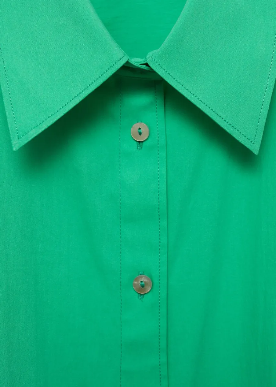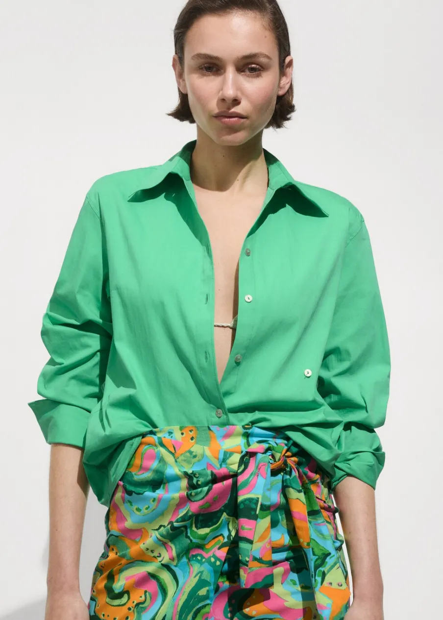100% bomull. Tkanina z bawełnianej popeliny. Model oversize. Koszulowy kołnierz. Długi rękaw z guzikami na mankietach. Zapięcie na guziki z przodu.