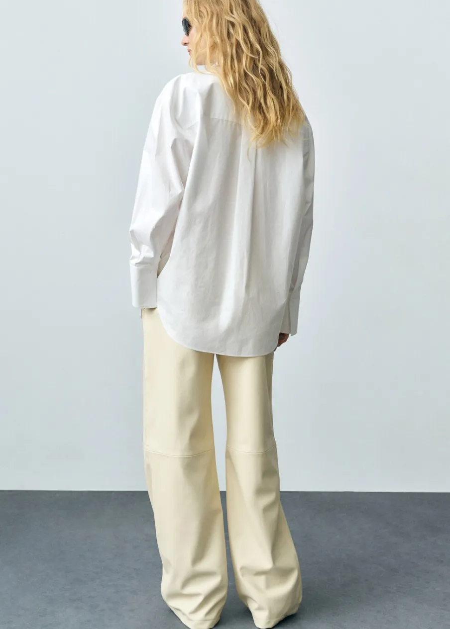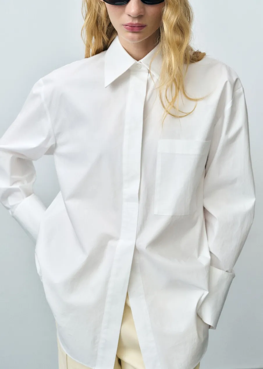 Tkanina z 100% bawełny. Model oversize. Koszulowy kołnierz. Długi rękaw z guzikami na mankietach. Kieszeń nakładana na piersi. Zapięcie na guziki z przodu.