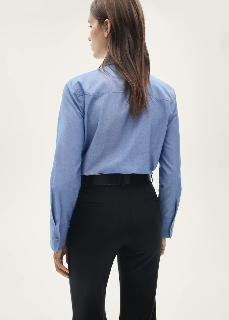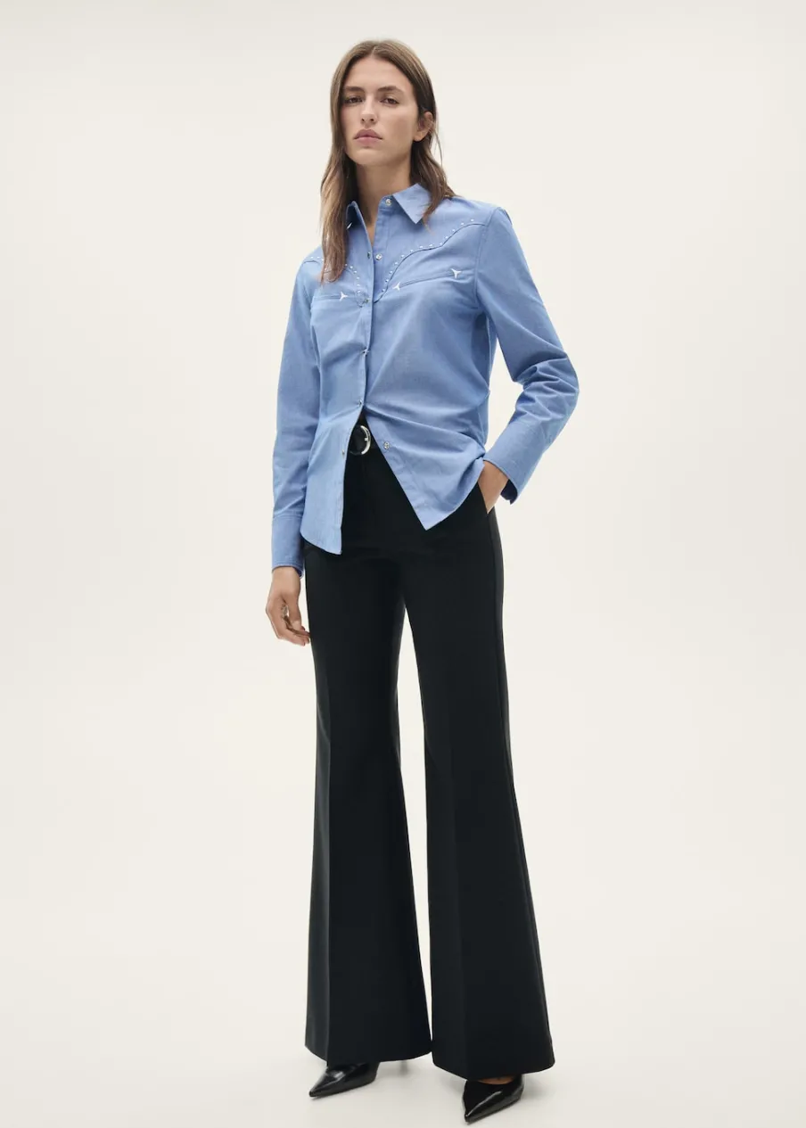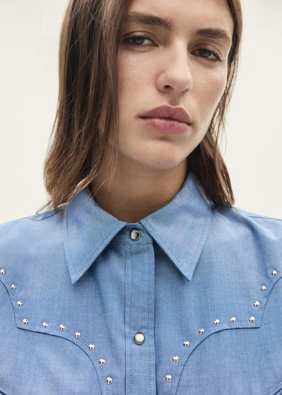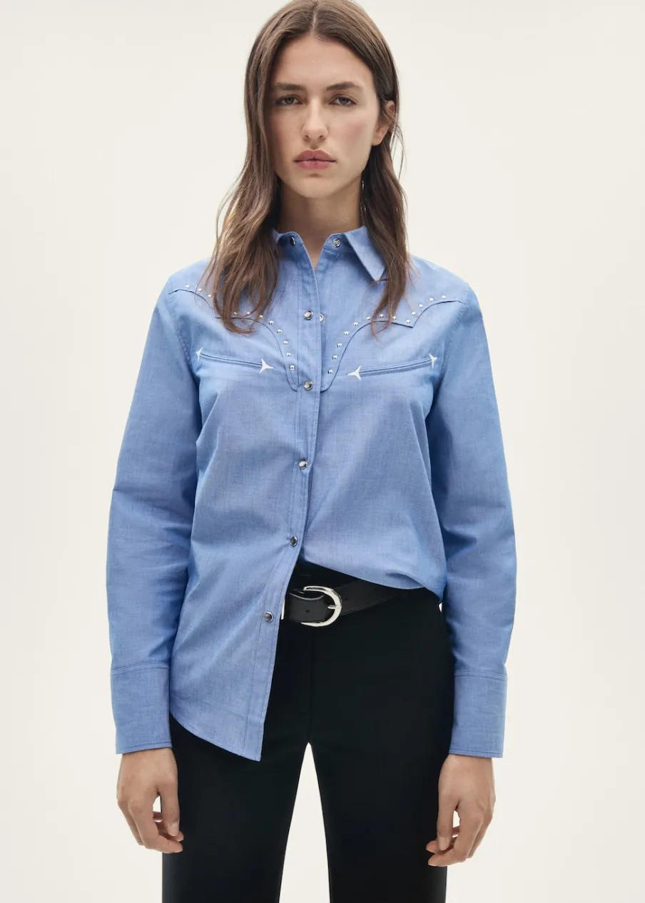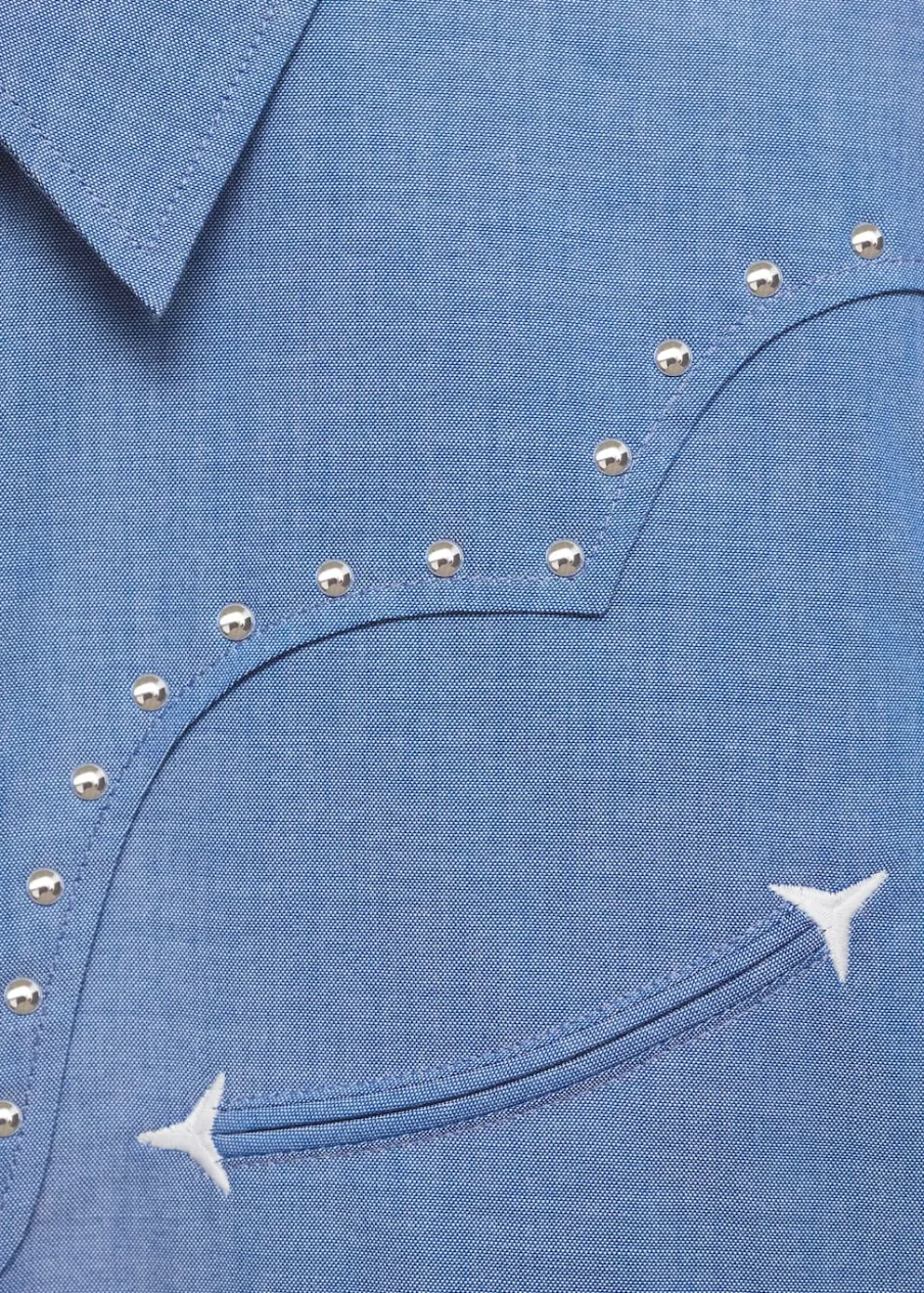 Tkanina mieszanka bawełny. Model prosty. Koszulowy kołnierz. Długi rękaw z guzikami na mankietach. Zapięcie na zatrzaski z przodu. Ozdobne szwy. Ozdobny haft. Ozdobne ćwieki. Modelka ma 178 cm wzrostu i nosi rozmiar S/36.