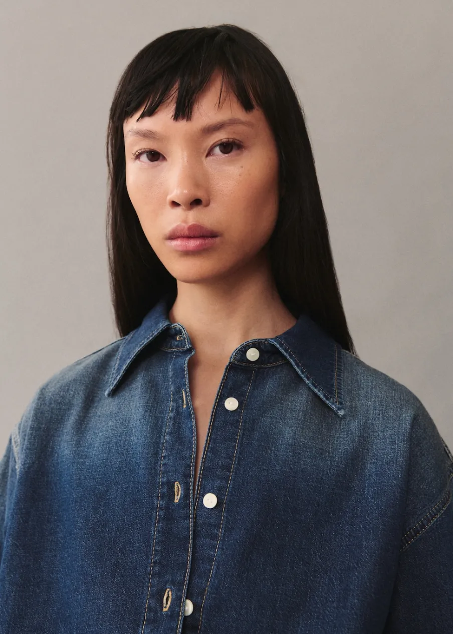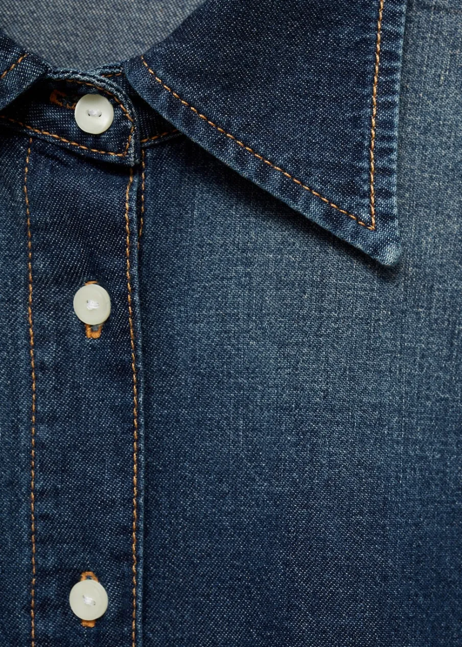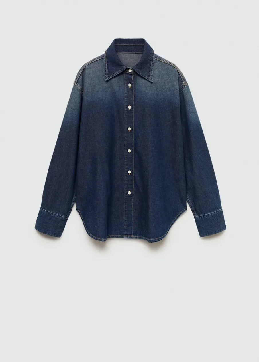 Tkanina denim. Model oversize. Koszulowy kołnierz. Długi rękaw. Zapięcie na guziki. Zapięcie na guziki na rękawie. Kontrastowe szwy. Wytarty efekt. Modelka ma 177 cm wzrostu i nosi rozmiar S/36.