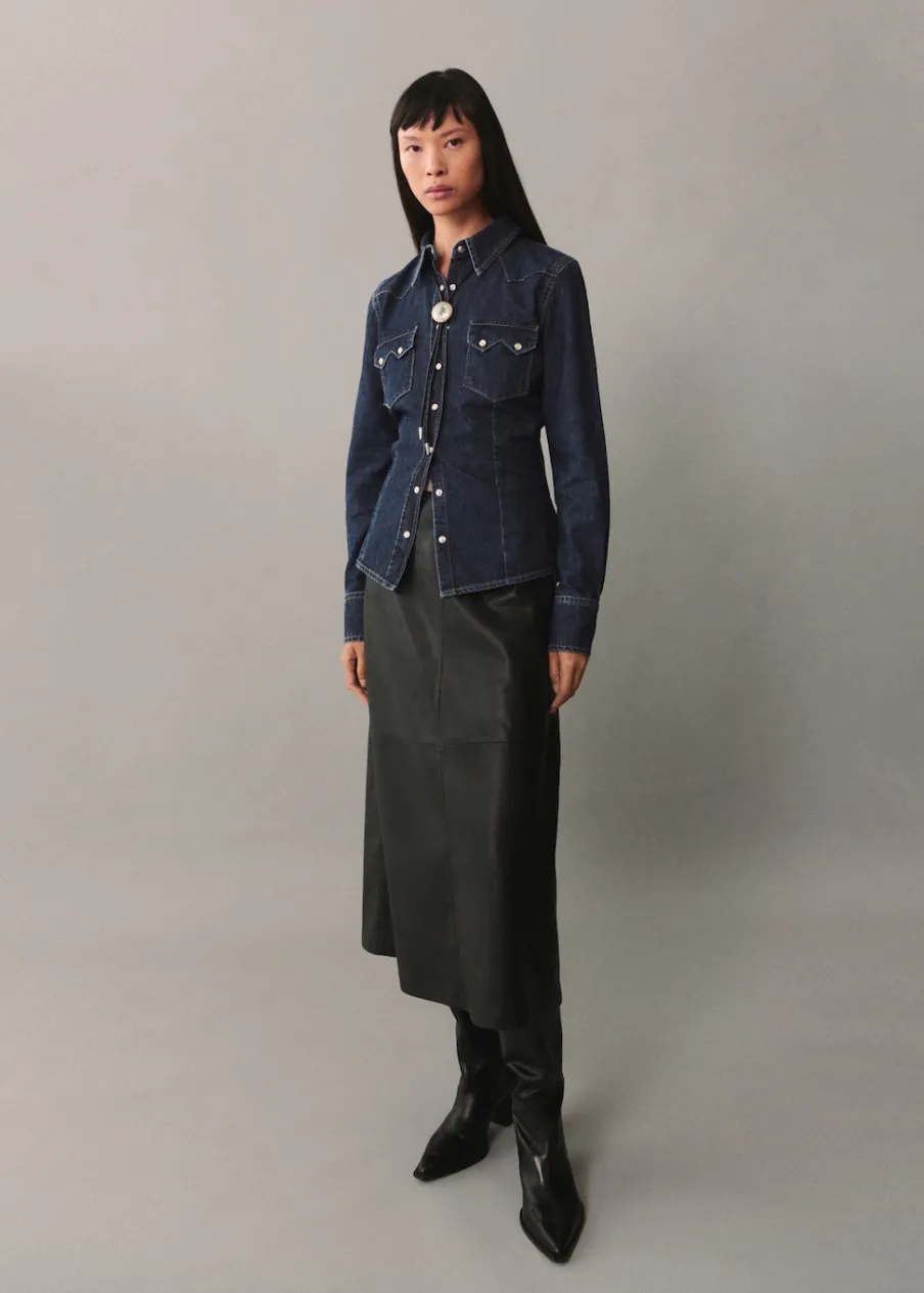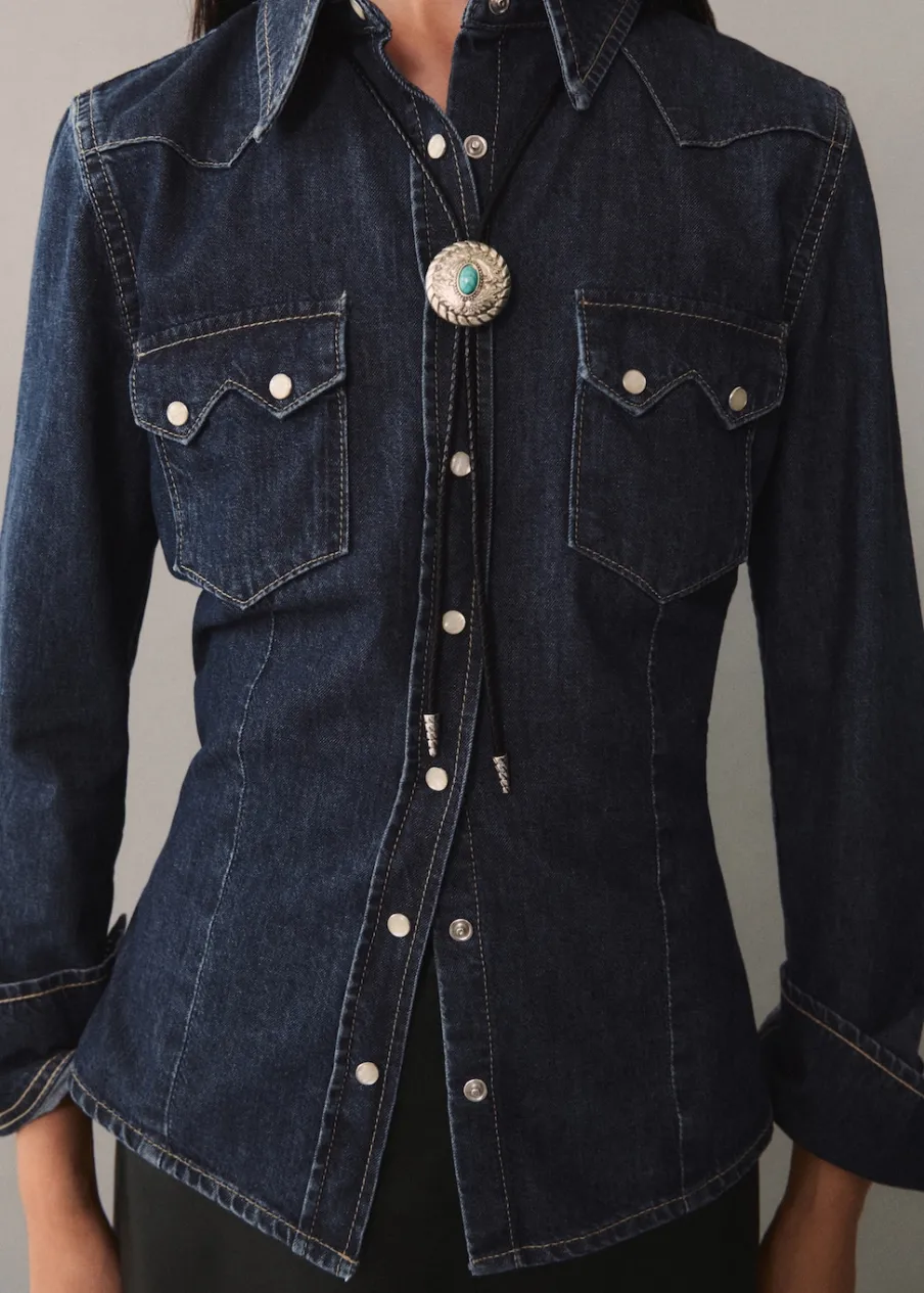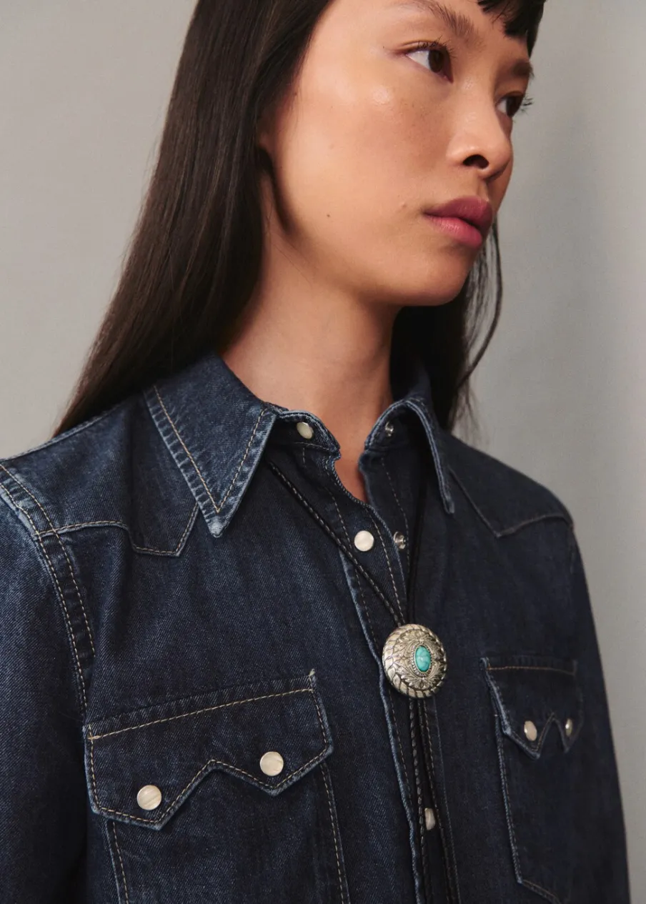 Tkanina bawełniana w dżinsowym stylu. Model prosty. Koszulowy kołnierz. Długi rękaw z guzikami na mankietach. Dwie kieszenie nakładane z przodu. Modelka ma 177 cm wzrostu i nosi rozmiar S/36. Zapięcie na guziki z przodu.