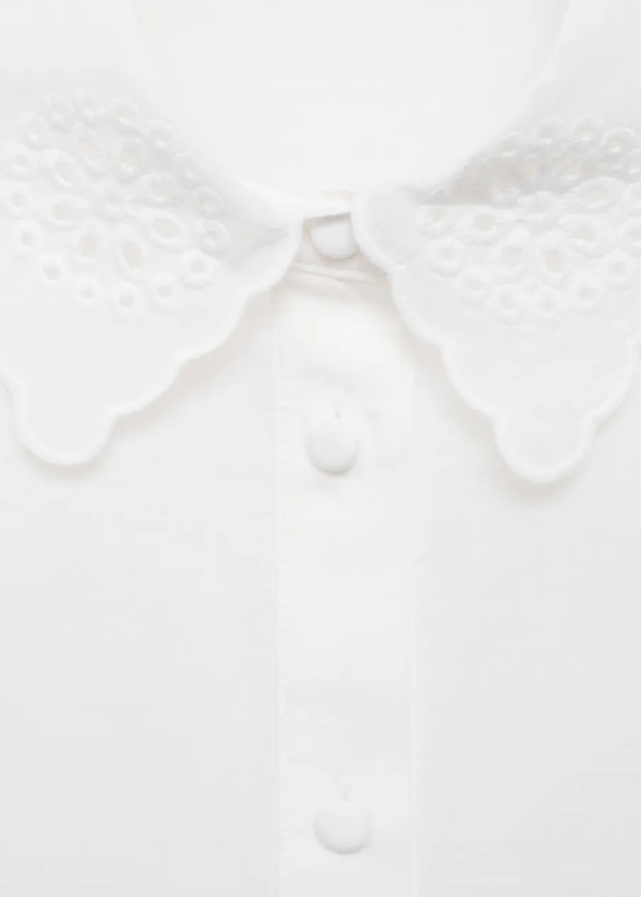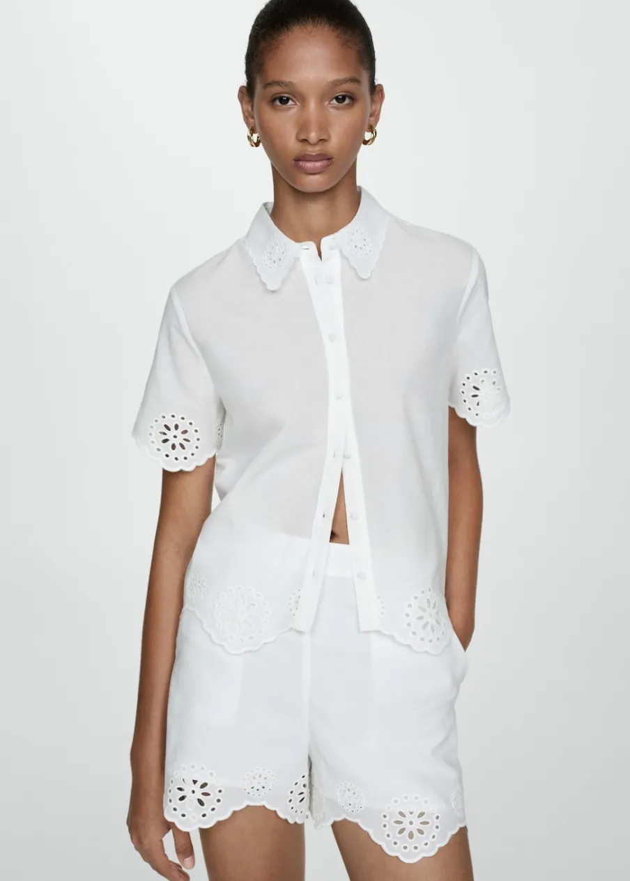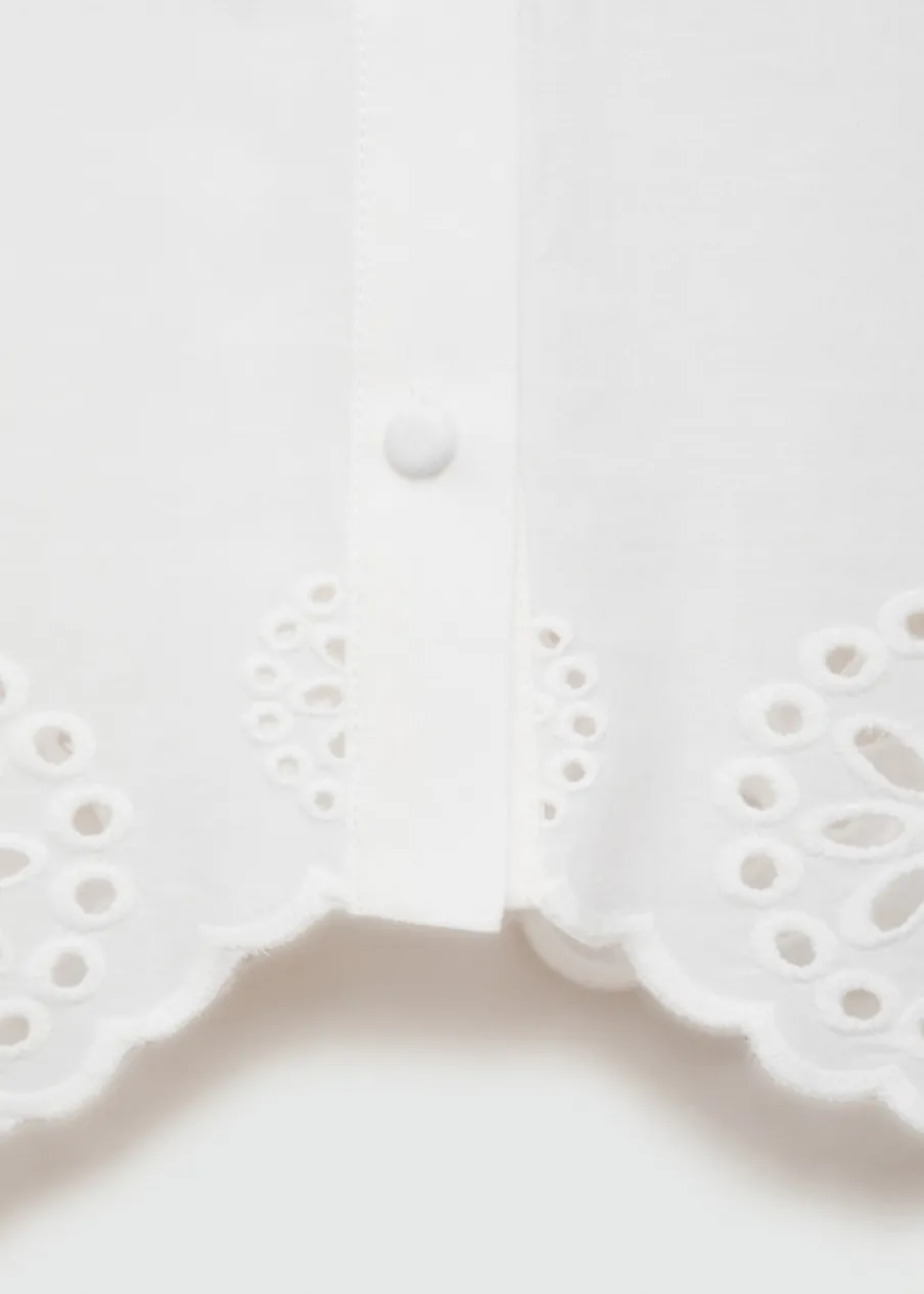 Model prosty. Koszulowy kołnierz. Krótki rękaw. Haftowane detale. Ażurowe detale. Zapięcie z przodu na guziki. Dół z falowanym wykończeniem. Total look. Tkanina z 100% bawełny.