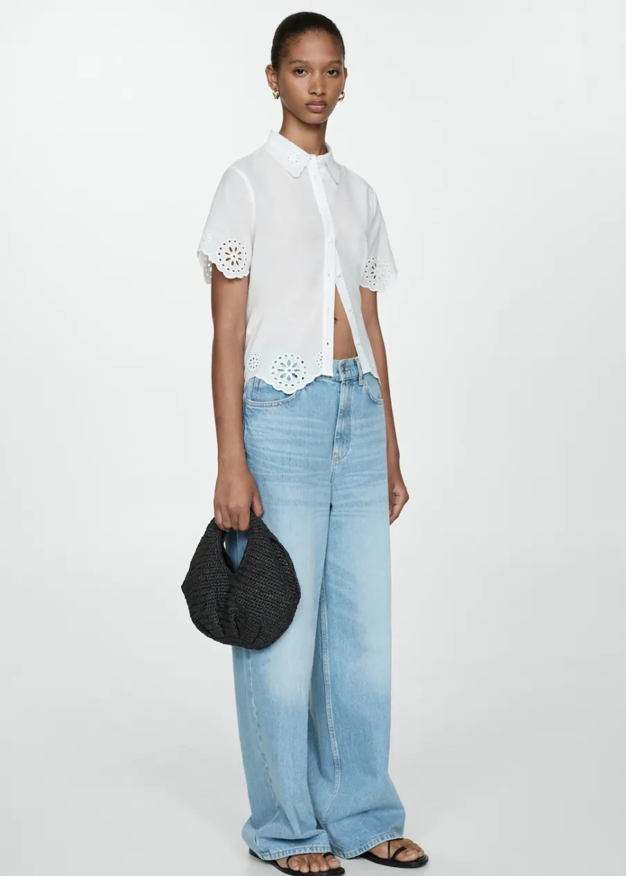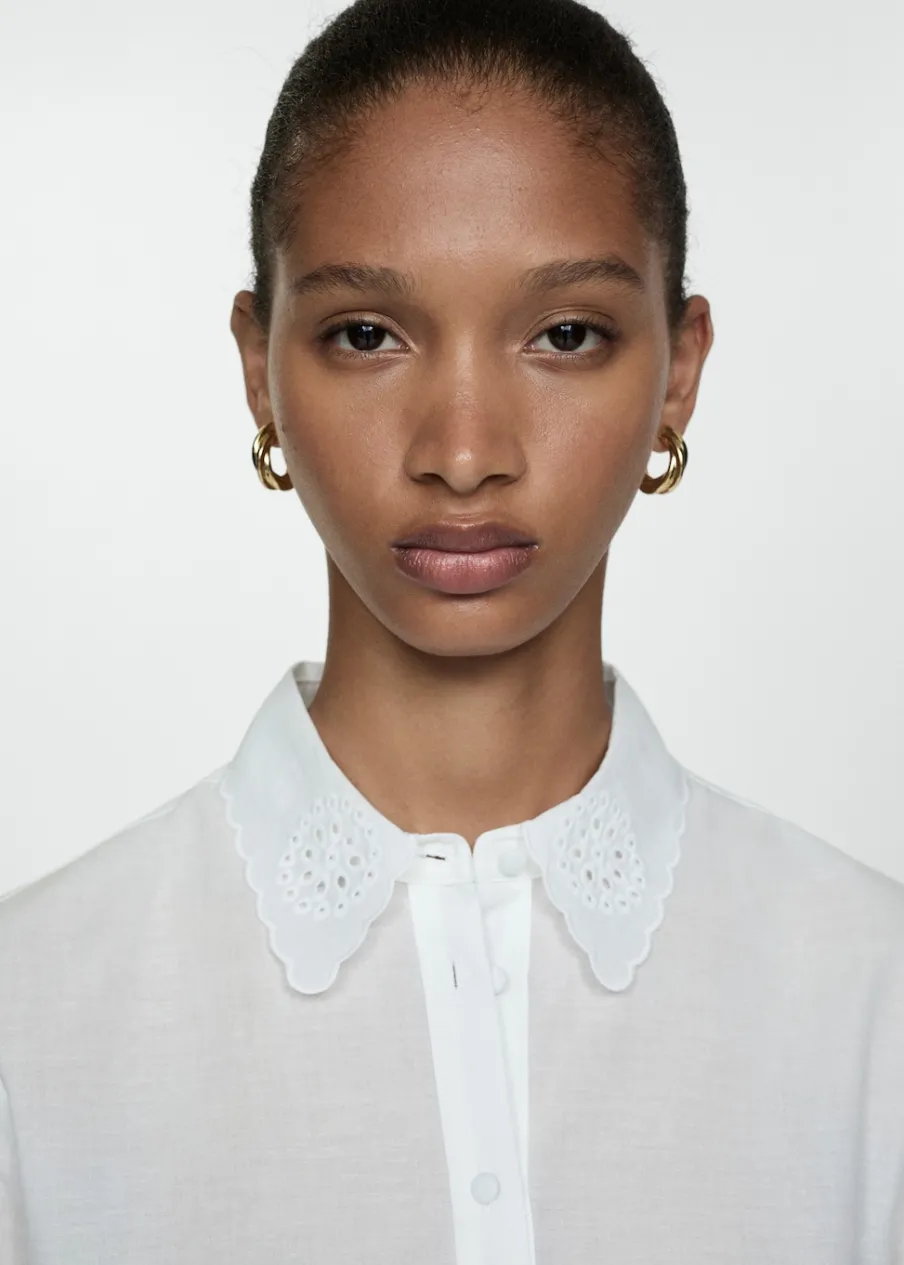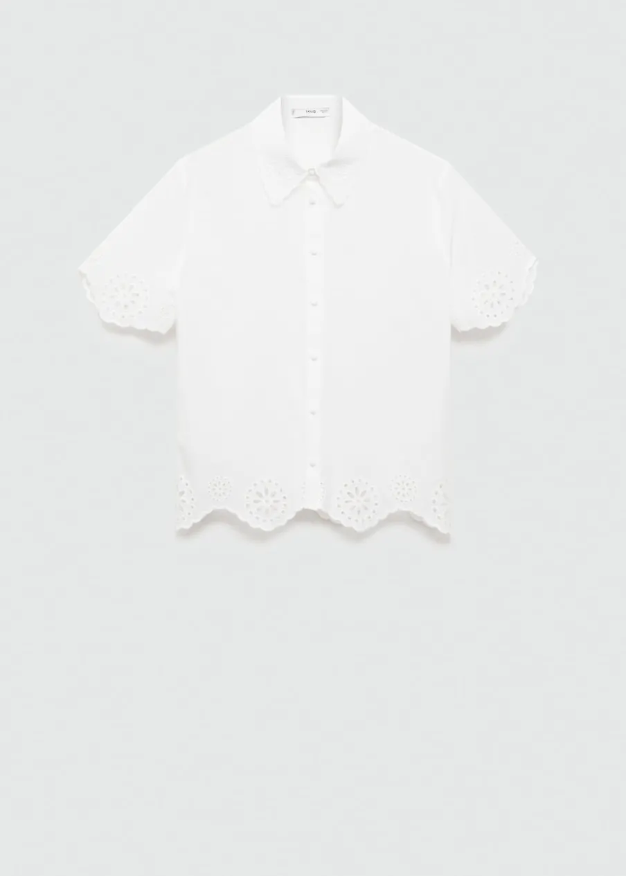 Model prosty. Koszulowy kołnierz. Krótki rękaw. Haftowane detale. Ażurowe detale. Zapięcie z przodu na guziki. Dół z falowanym wykończeniem. Total look. Tkanina z 100% bawełny.