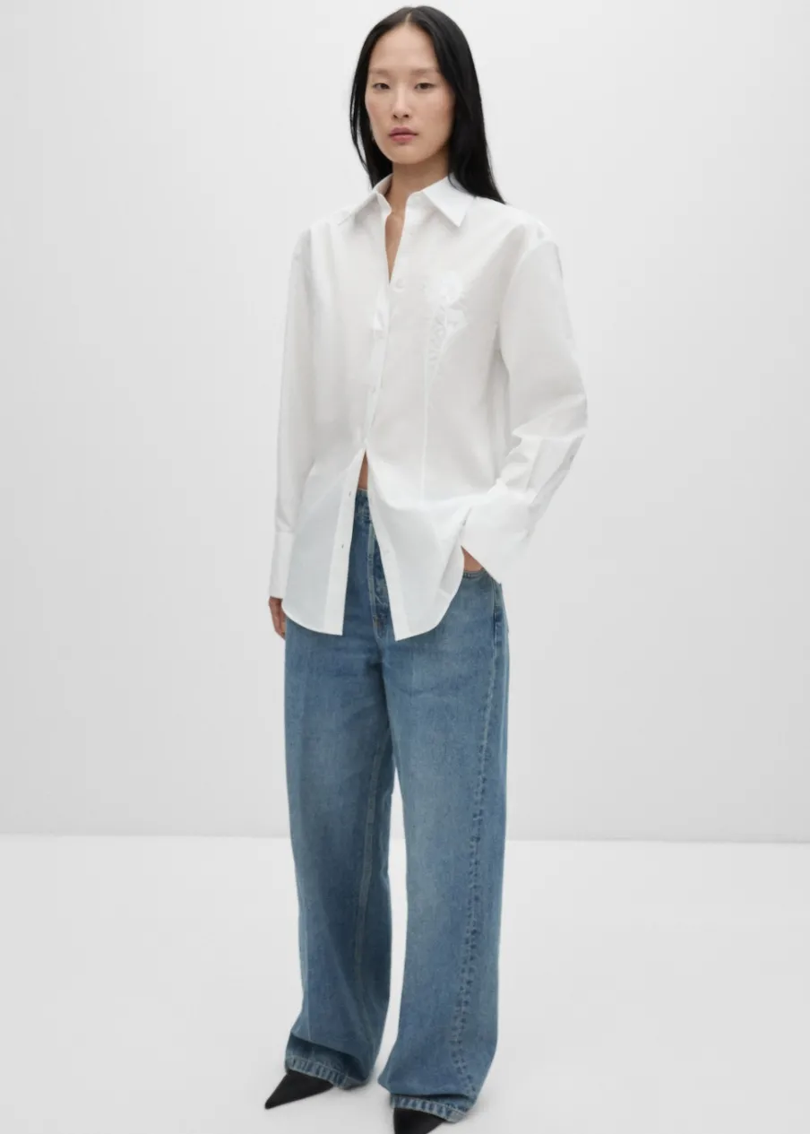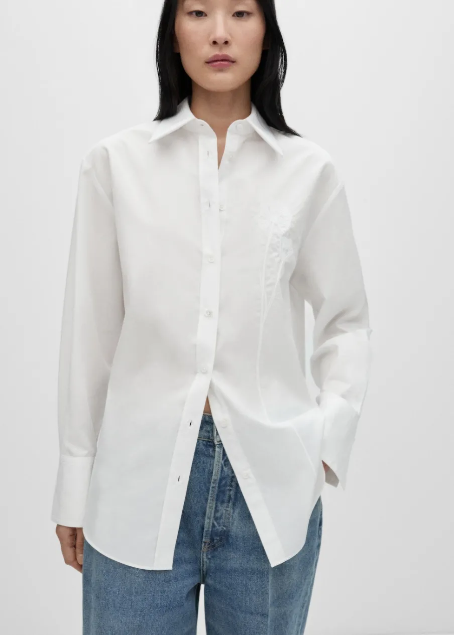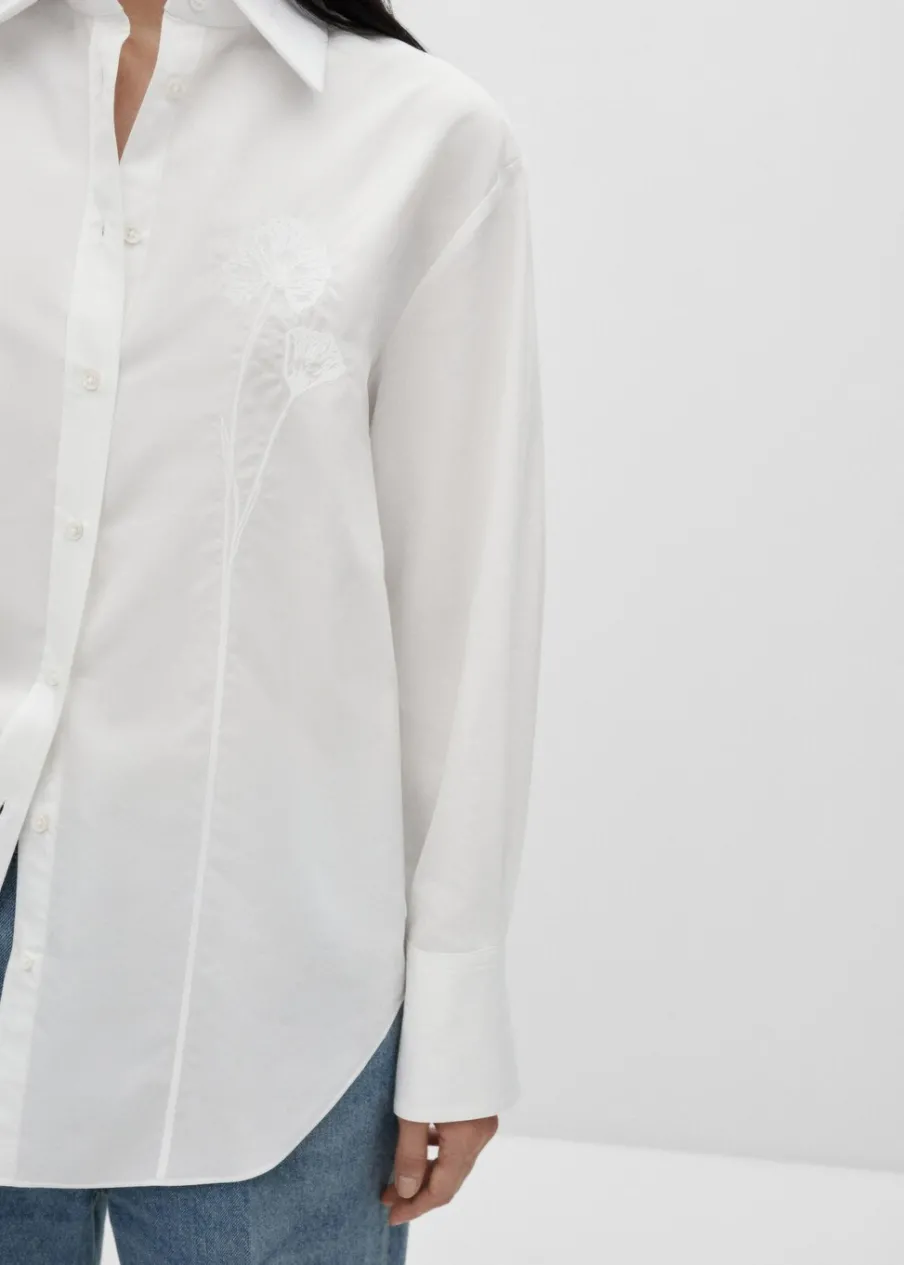 Tkanina z bawełnianej popeliny. Koszulowy kołnierz. Kolekcja Selection. Modelka ma 175 cm wzrostu i nosi rozmiar S/36. Modelka ma 178 cm wzrostu i nosi rozmiar S/36. Mieszanka bawełny i lyocellu. Model prosty. Model oversize. Długi rękaw z guzikami na mankietach. Haftowany detal. Zapięcie na guziki z przodu.
