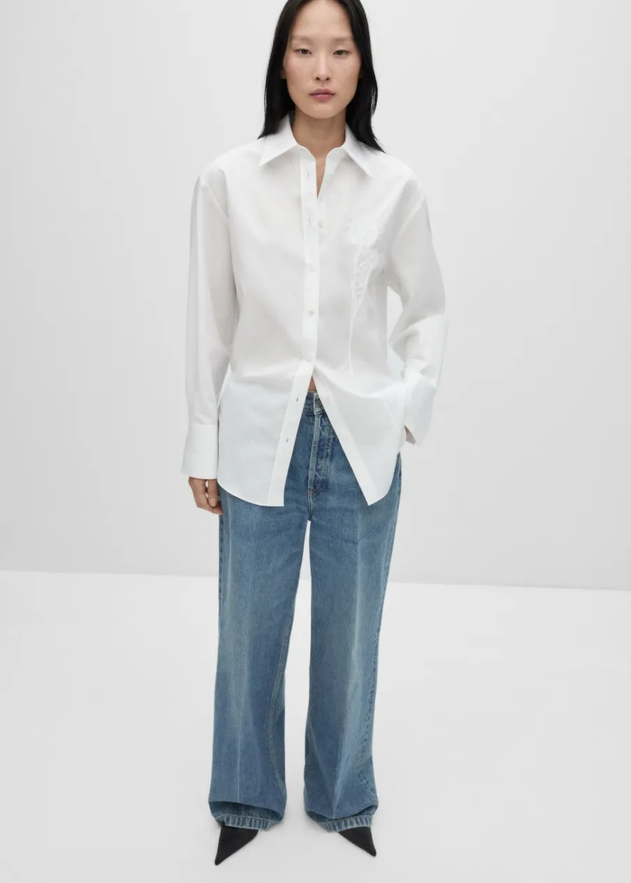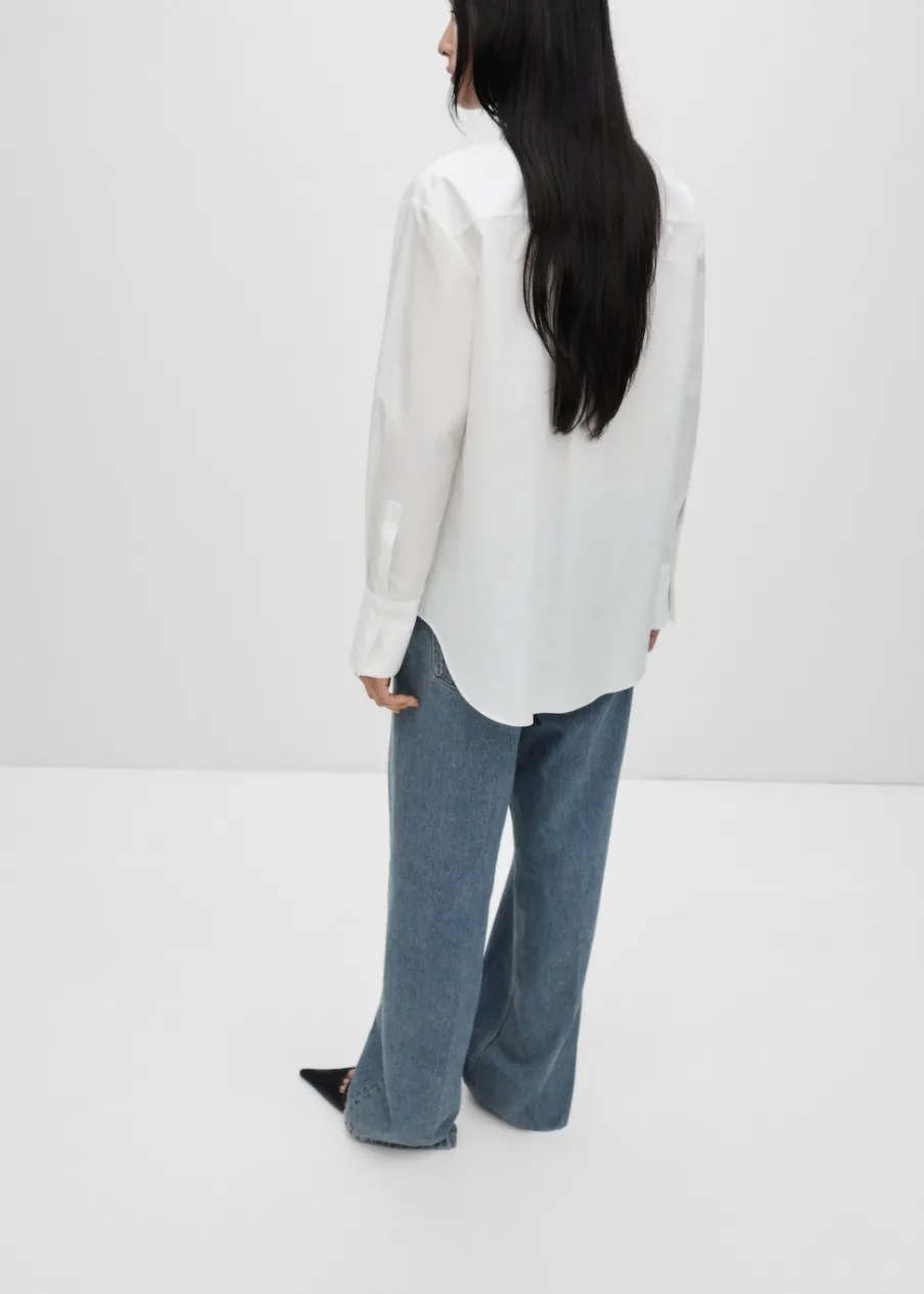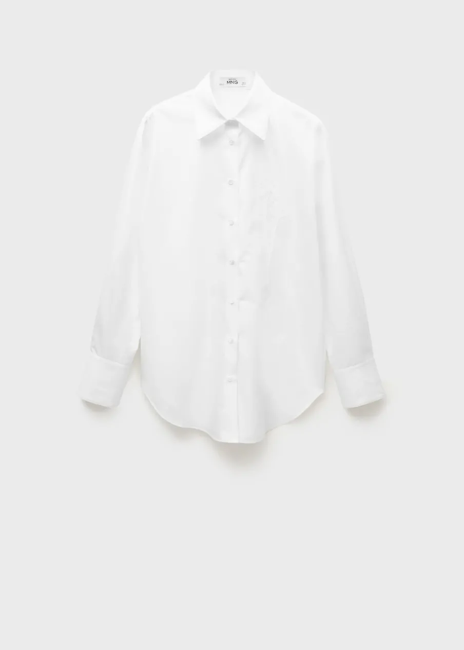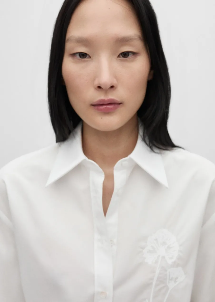 Tkanina z bawełnianej popeliny. Koszulowy kołnierz. Kolekcja Selection. Modelka ma 175 cm wzrostu i nosi rozmiar S/36. Modelka ma 178 cm wzrostu i nosi rozmiar S/36. Mieszanka bawełny i lyocellu. Model prosty. Model oversize. Długi rękaw z guzikami na mankietach. Haftowany detal. Zapięcie na guziki z przodu.