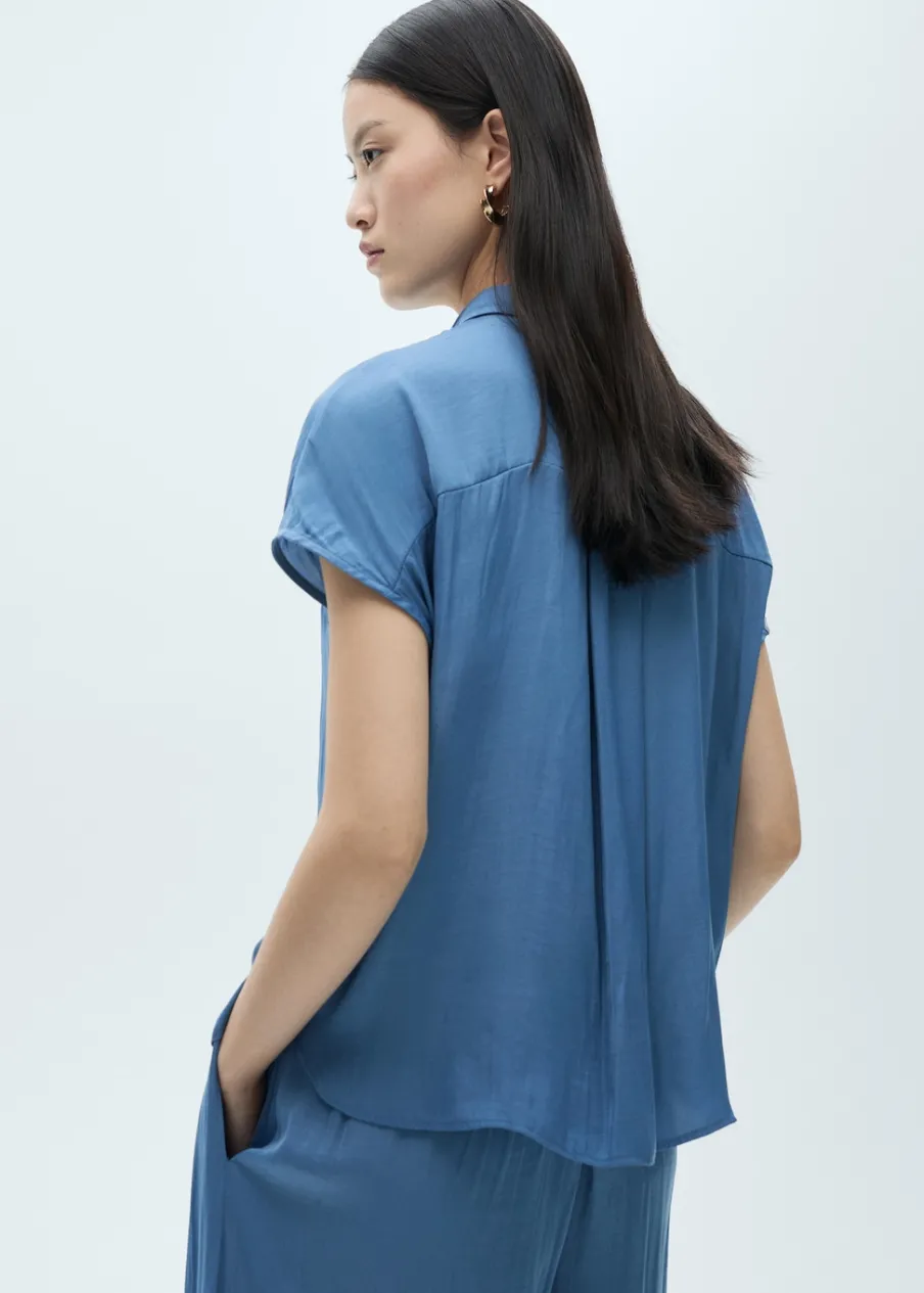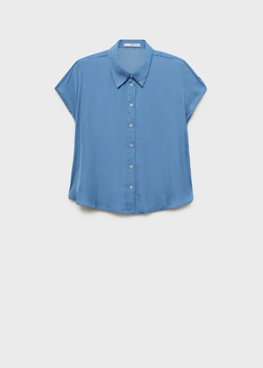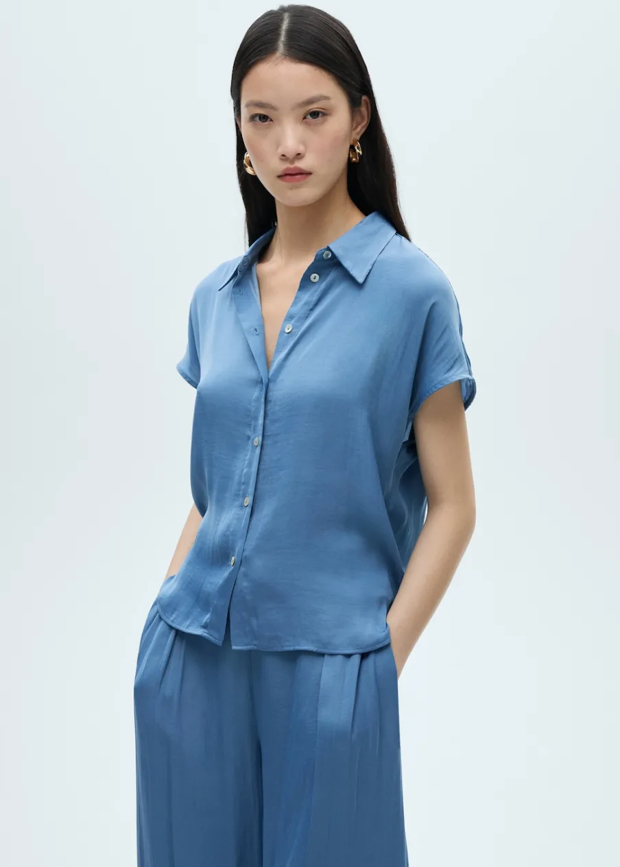 Cienka tkanina. Lejąca tkanina. Model prosty. Koszulowy kołnierz. Koszula z krótkim rękawem. Zapięcie z przodu na guziki. Zapięcie z przodu. Model standardowy. Bez rękawów.