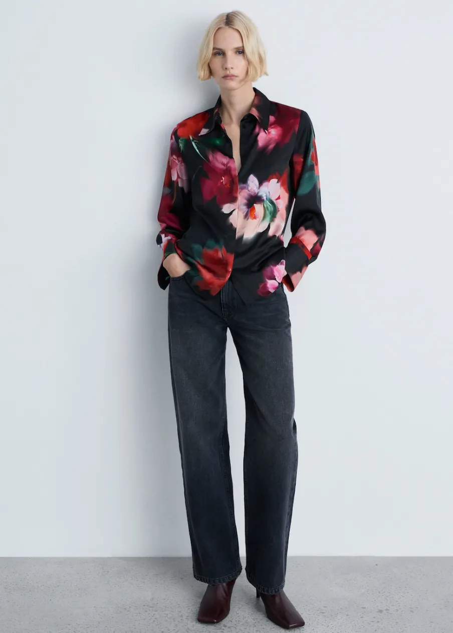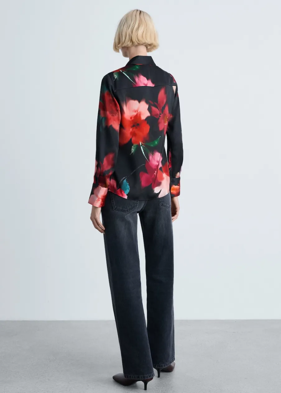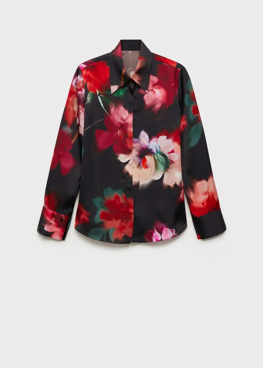 Lejąca tkanina z satynowym wykończeniem. Model standardowy. Model prosty. Wzór w kwiaty. Koszulowy kołnierz. Długi rękaw z guzikami na mankietach. Zapięcie z przodu na guziki. Dostępne w Plus Size.