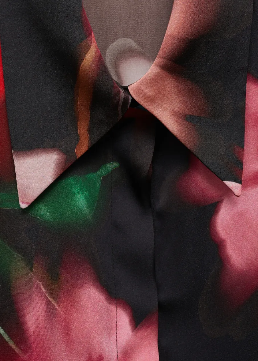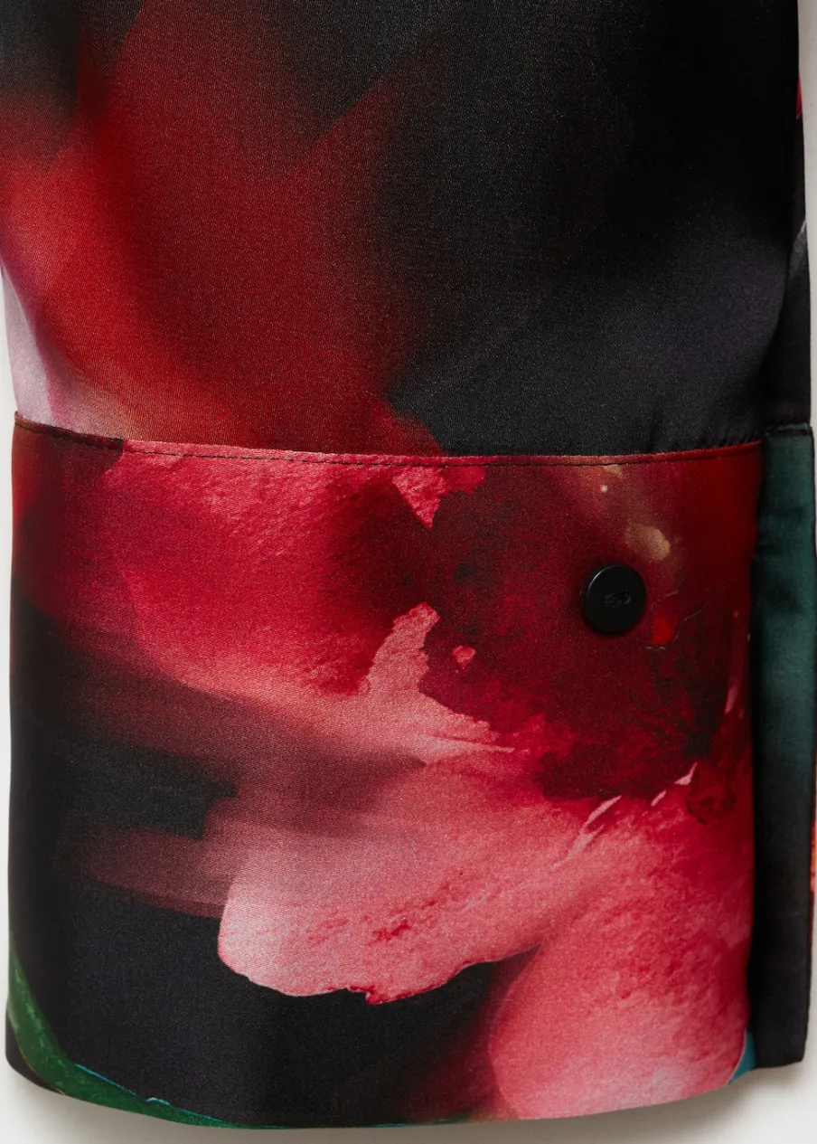OpisLejąca tkanina z satynowym wykończeniem. Model standardowy. Model prosty. Wzór w kwiaty. Koszulowy kołnierz. Dł…