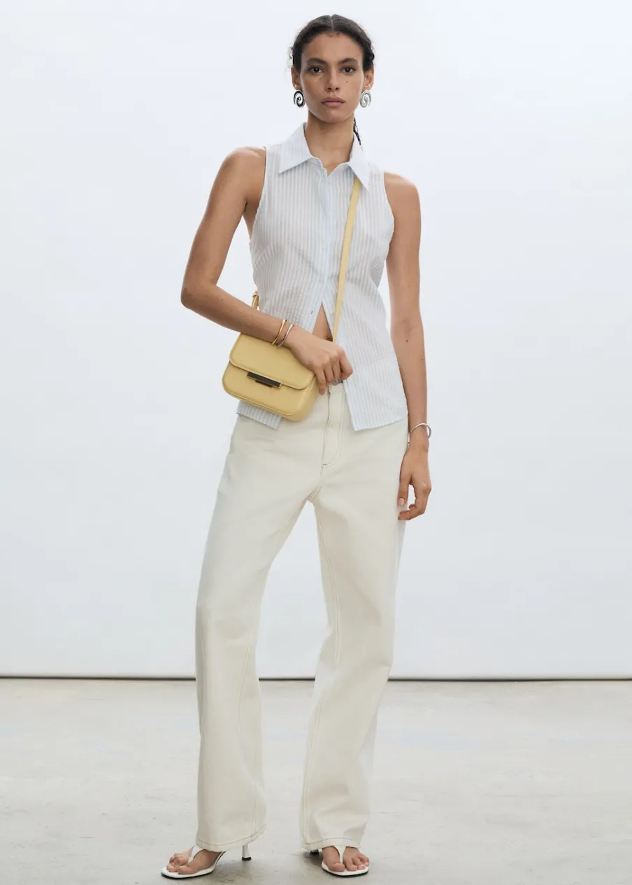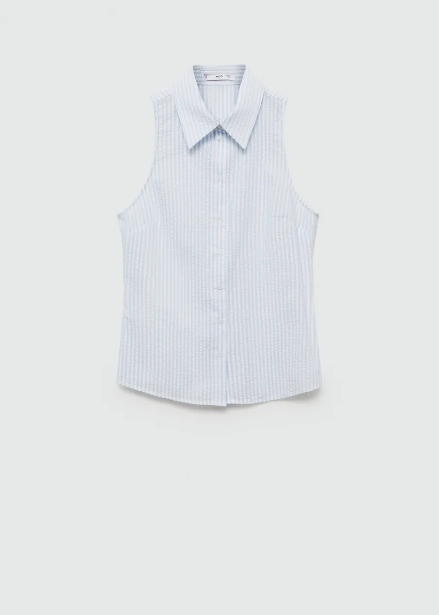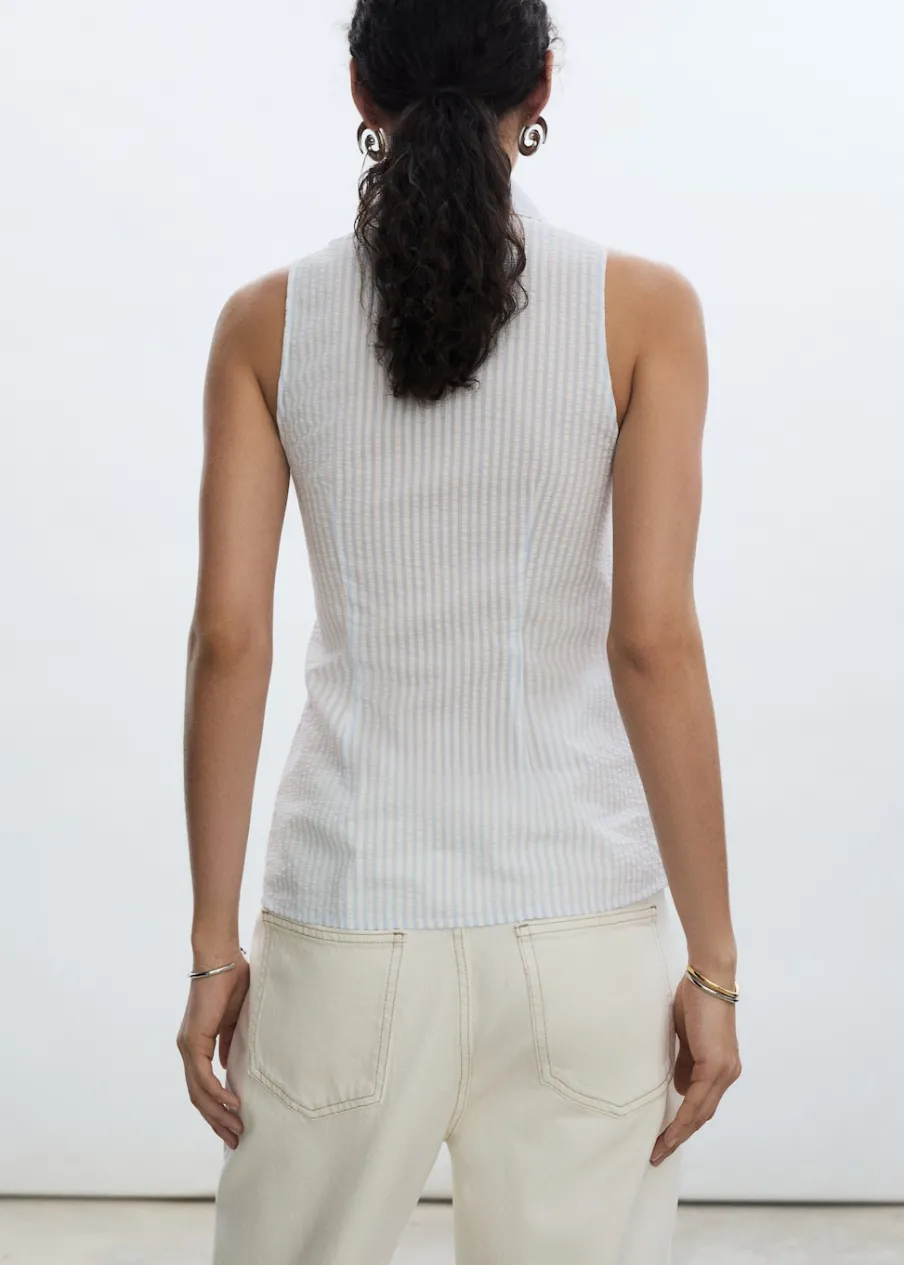 Tkanina z mieszanki modalu i bawełny. Teksturowana tkanina. Model prosty. Koszulowy kołnierz. Bez rękawów. Dwurzędowe zapięcie na guziki z przodu. Wzór w paski.