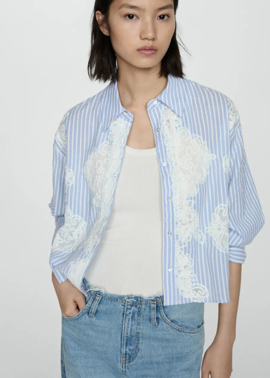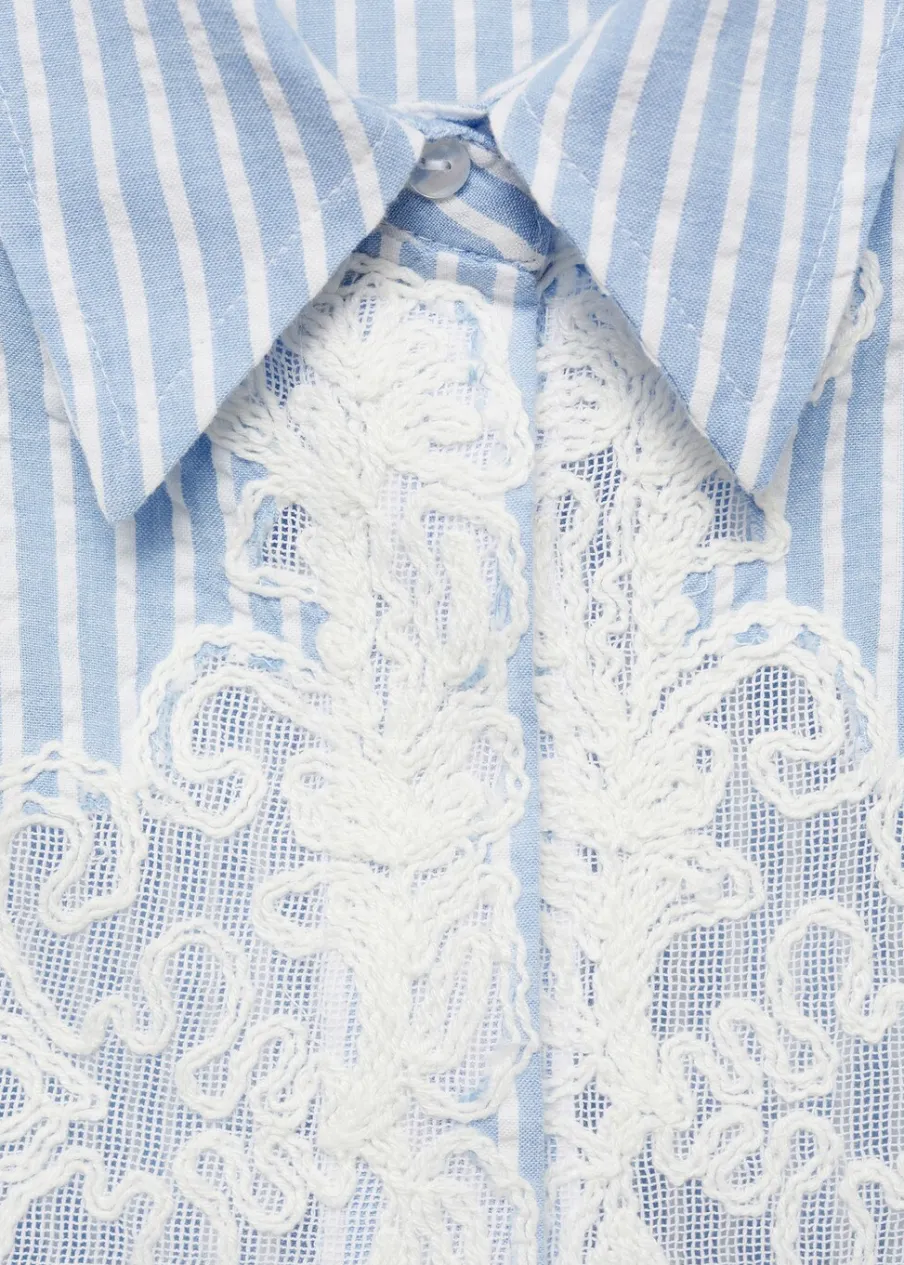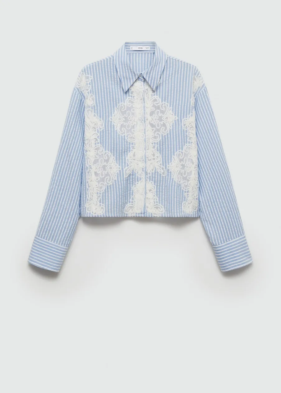Deseń crop. Model prosty. Haftowana wstawka. Koszulowy kołnierz. Długi rękaw z guzikami na mankietach. Zapięcie z przodu na guziki. Tkanina z 100% bawełny.