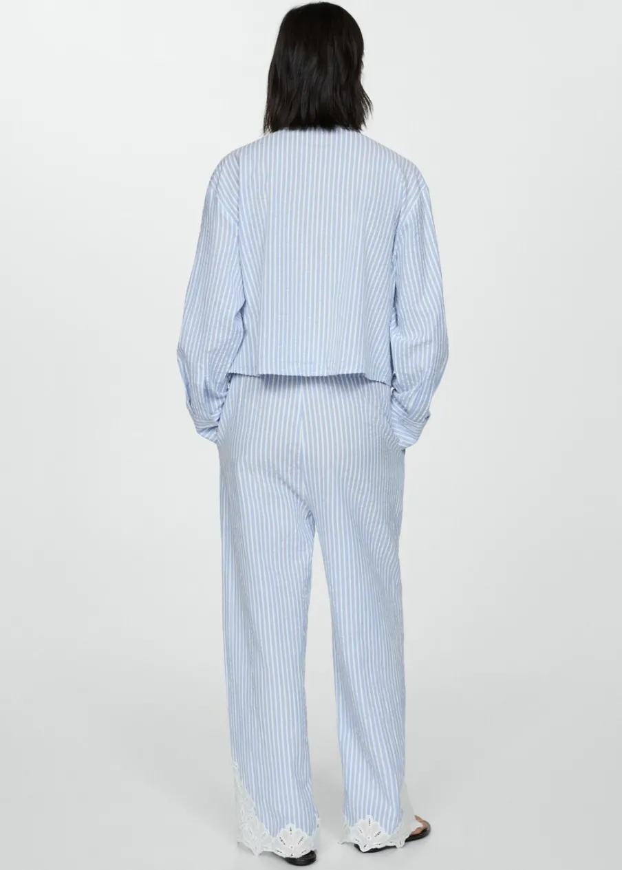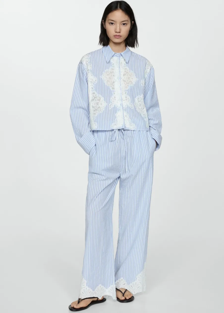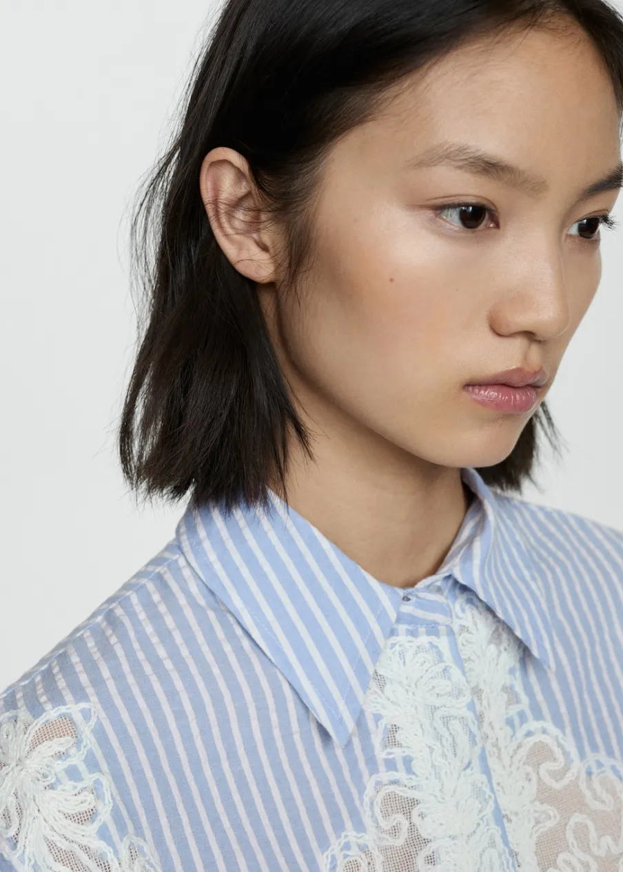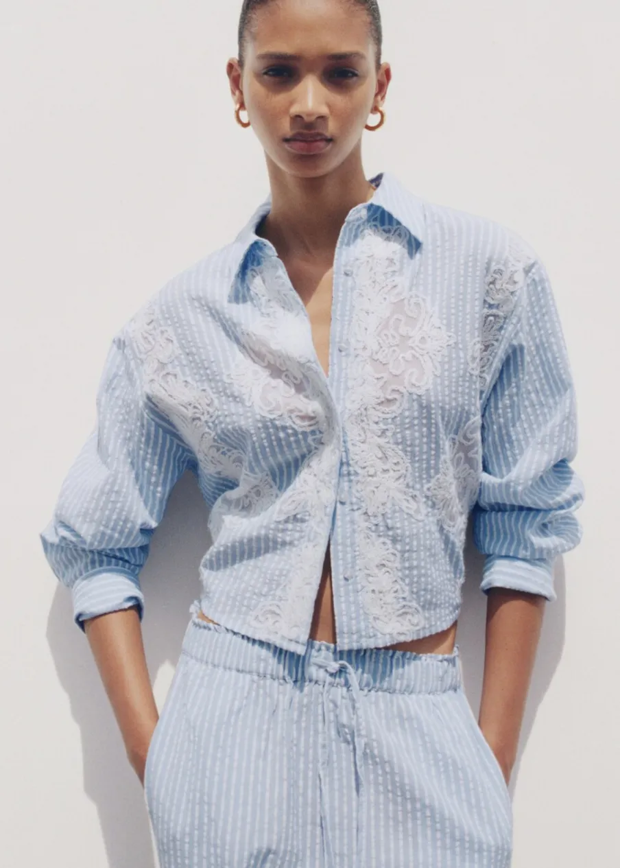 Deseń crop. Model prosty. Haftowana wstawka. Koszulowy kołnierz. Długi rękaw z guzikami na mankietach. Zapięcie z przodu na guziki. Tkanina z 100% bawełny.