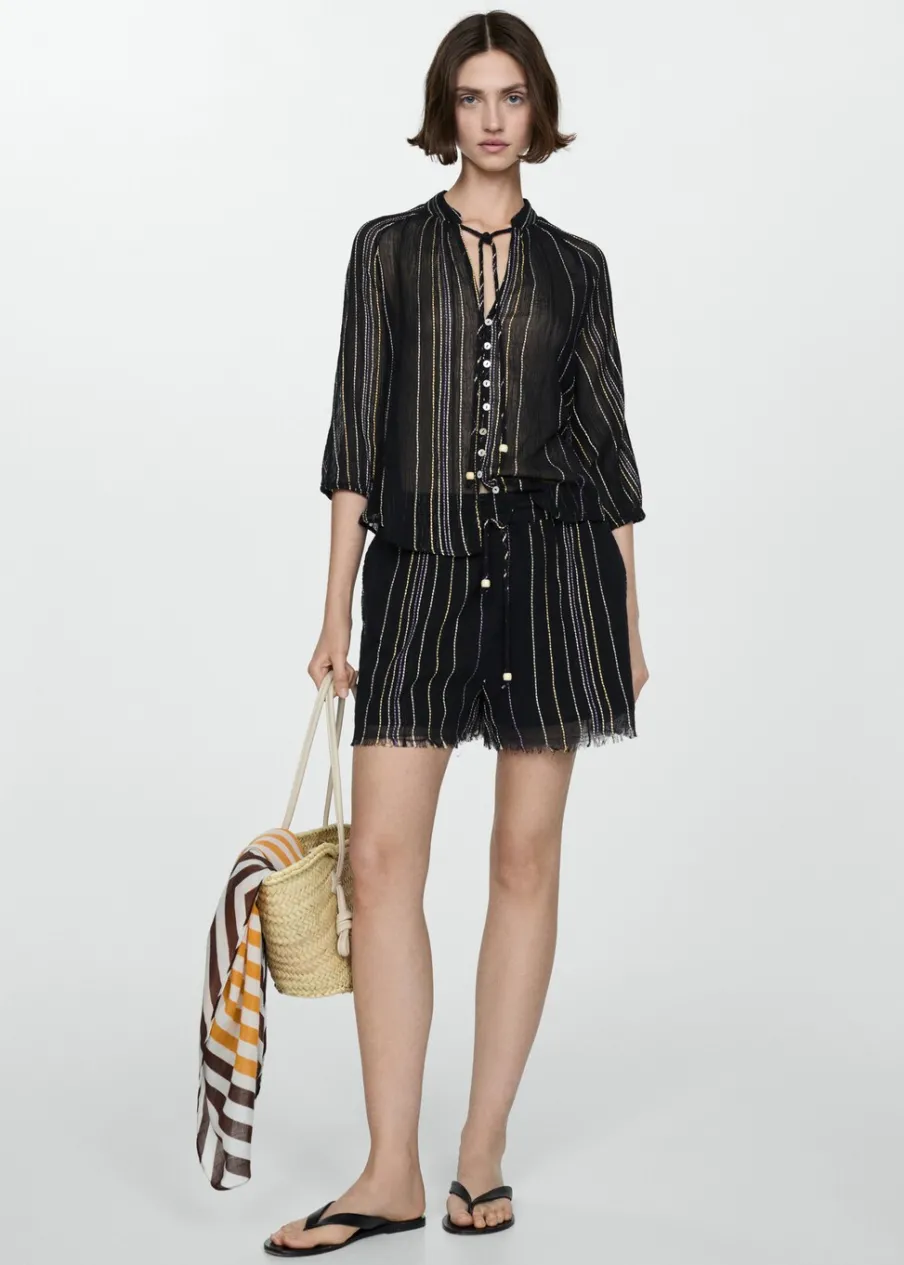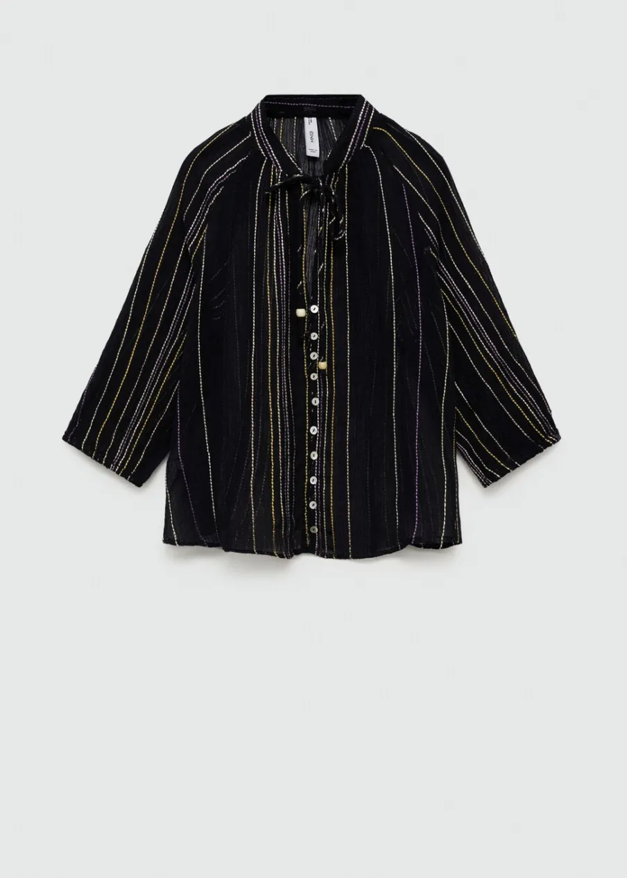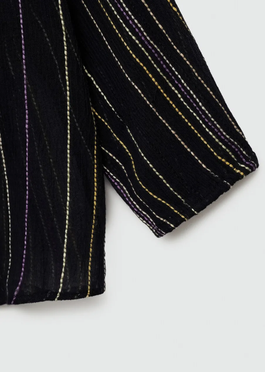 Tkanina mieszanka bawełny. Model prosty. Półprzezroczysty design. Wiązany dekolt w szpic. Rękaw trzy czwarte. Total look. Zapięcie na guziki z przodu. Wzór w paski.