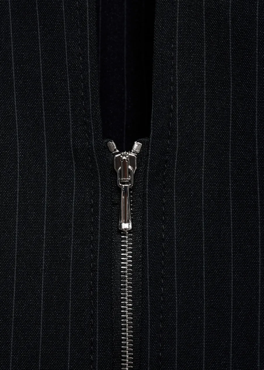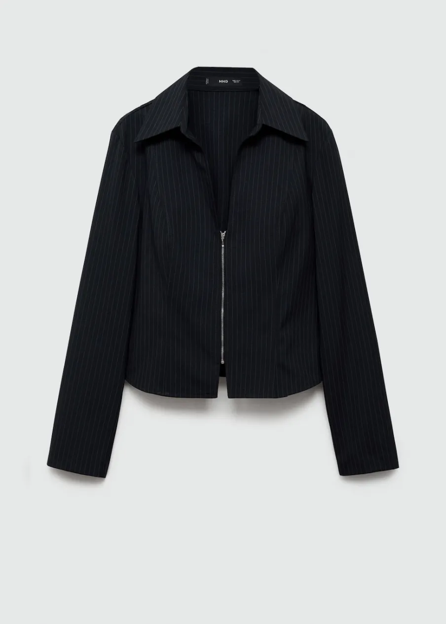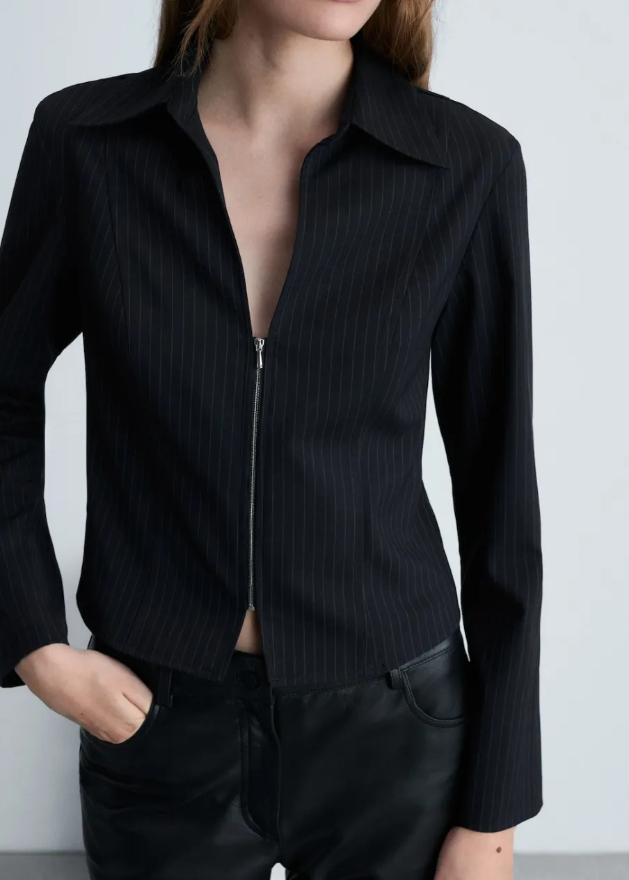 Lejąca tkanina. Model prosty. Deseń w prążki. Kołnierzyk koszulowy w szpic. Długi rękaw. Zapięcie z przodu na suwak. Modelka ma 178 cm wzrostu i nosi rozmiar S/36.