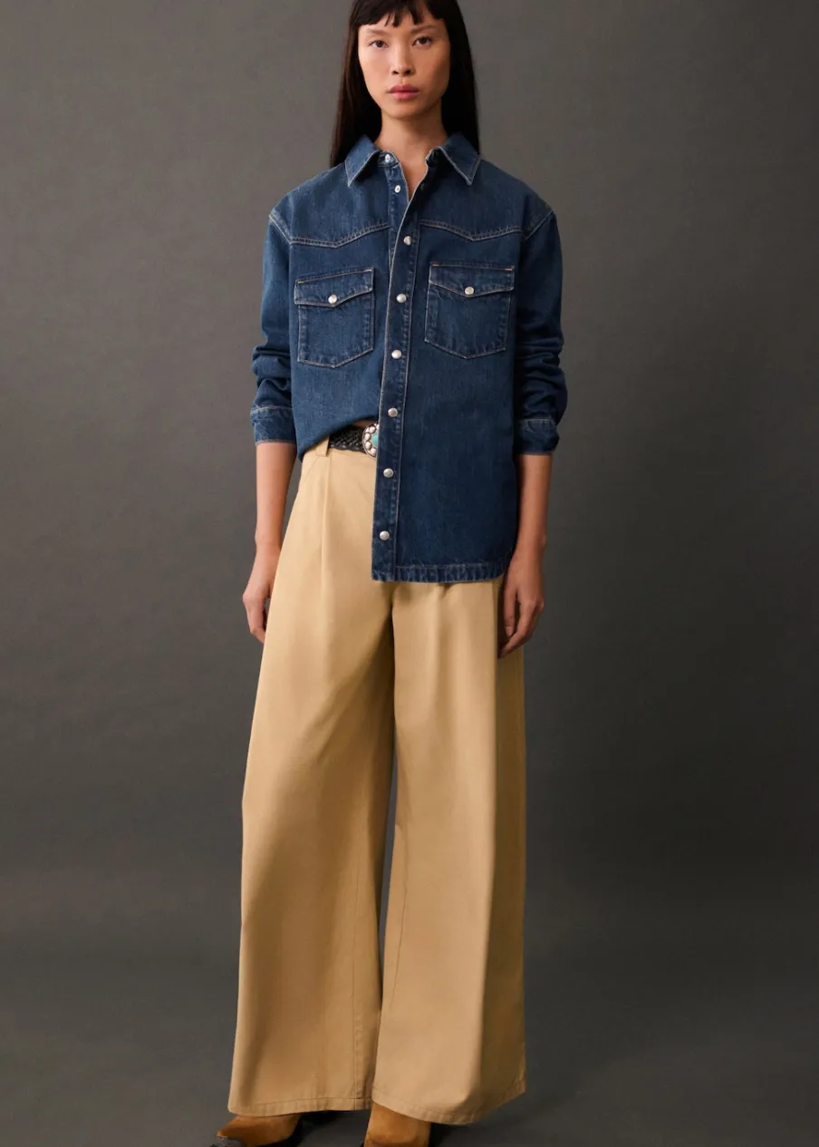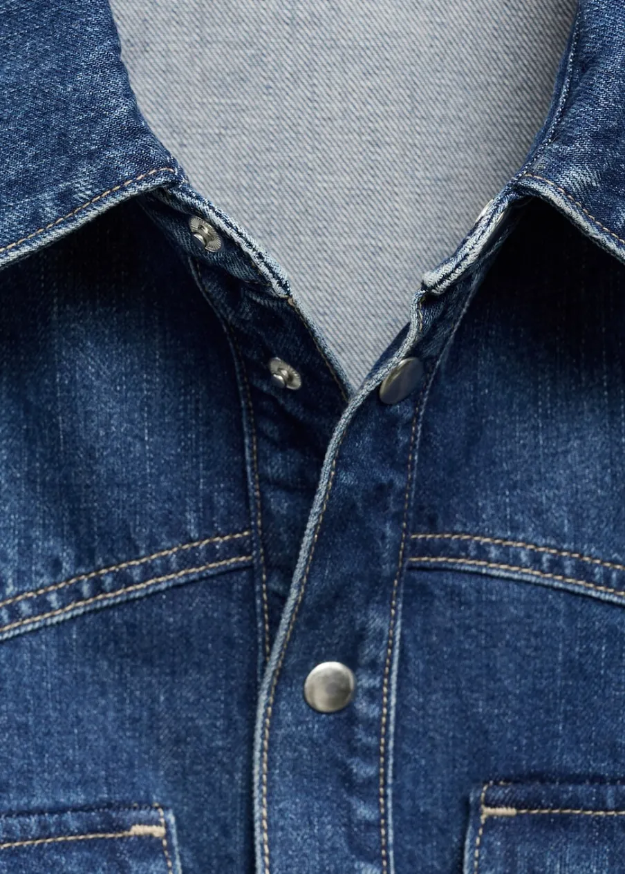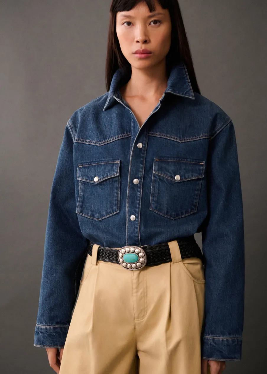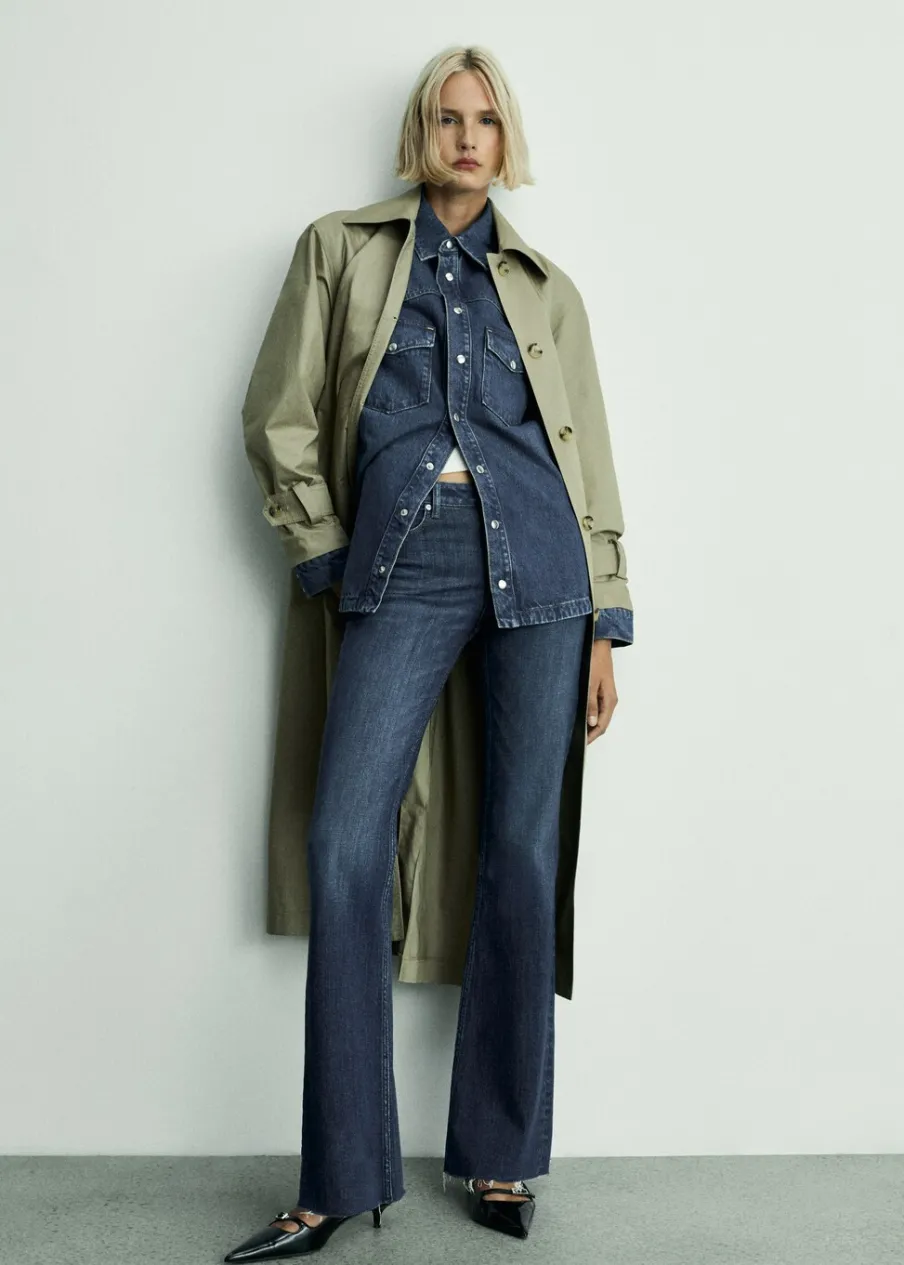Tkanina bawełniana w dżinsowym stylu. Model długi. Model oversize. Model prosty. Koszulowy kołnierz. Długi rękaw z guzikami na mankietach. Dwie kieszenie z patką na piersi. Zapięcie na guziki z przodu. Modelka ma 177 cm wzrostu i nosi rozmiar S/36.