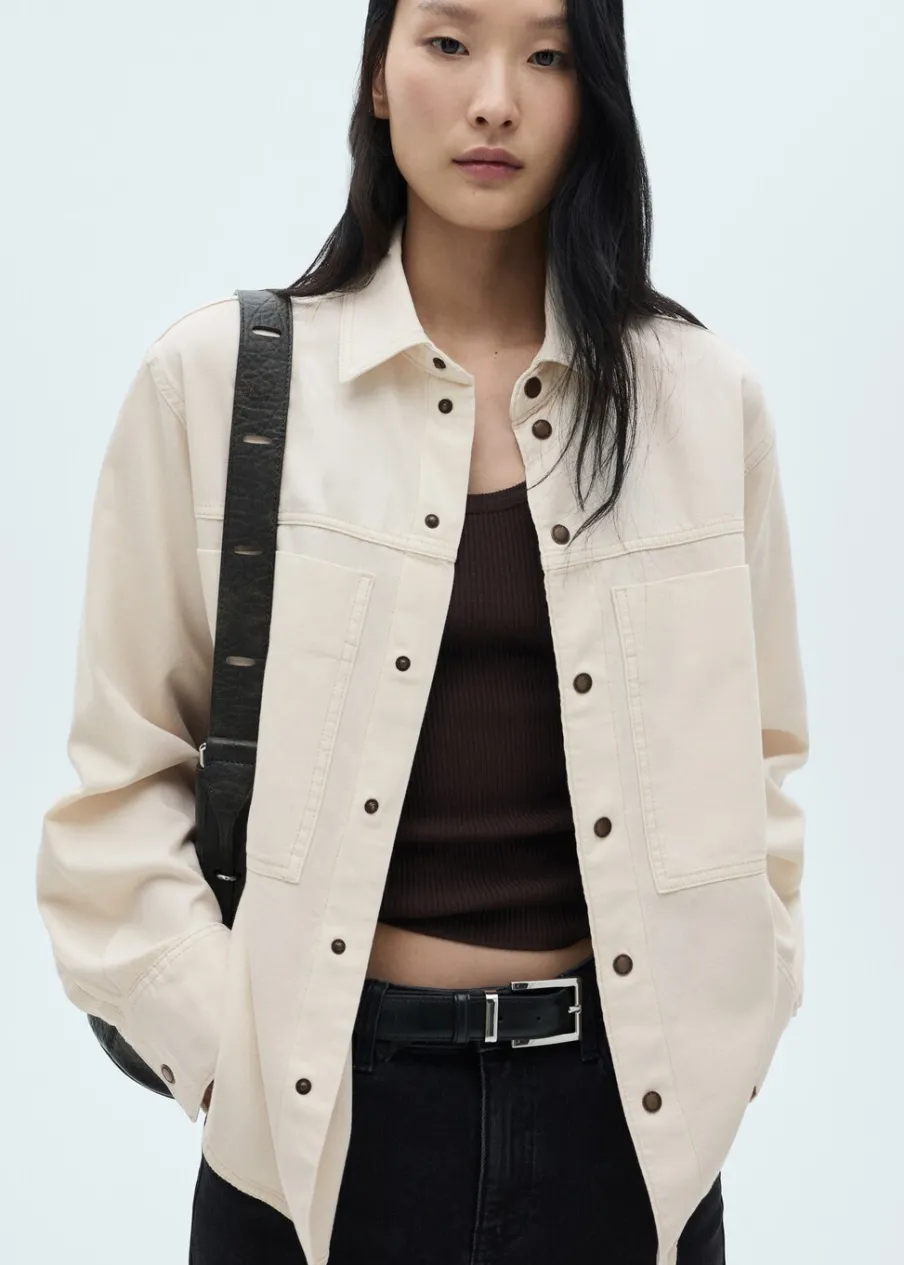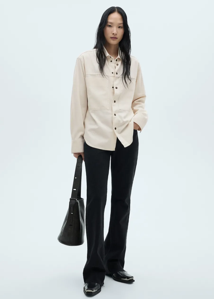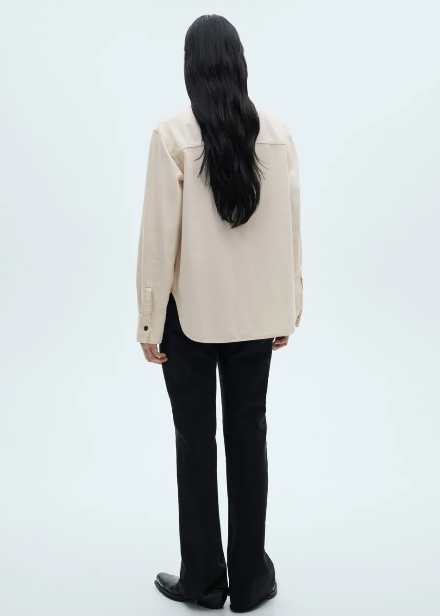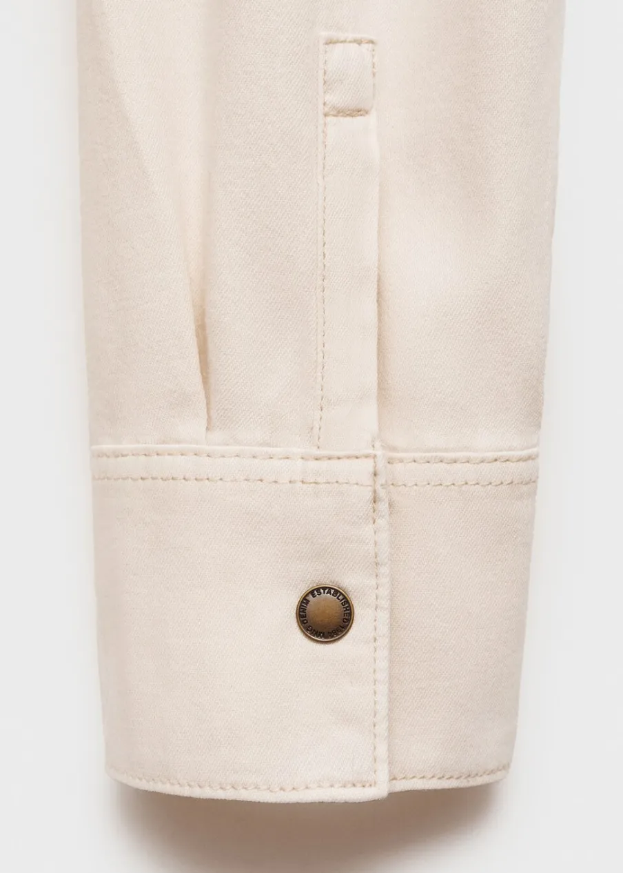 Tkanina bawełniana w dżinsowym stylu. Średnie spranie. Podwyższony stan. Szlufki. Pięć kieszeni. Zapięcie na suwak i guzik. Model długi. Modelka ma 175 cm wzrostu i nosi rozmiar S/36. Model oversize. Średnia wielkość. Zapięcie z przodu. Model standardowy. Długi rękaw. Koszulowy kołnierz.
