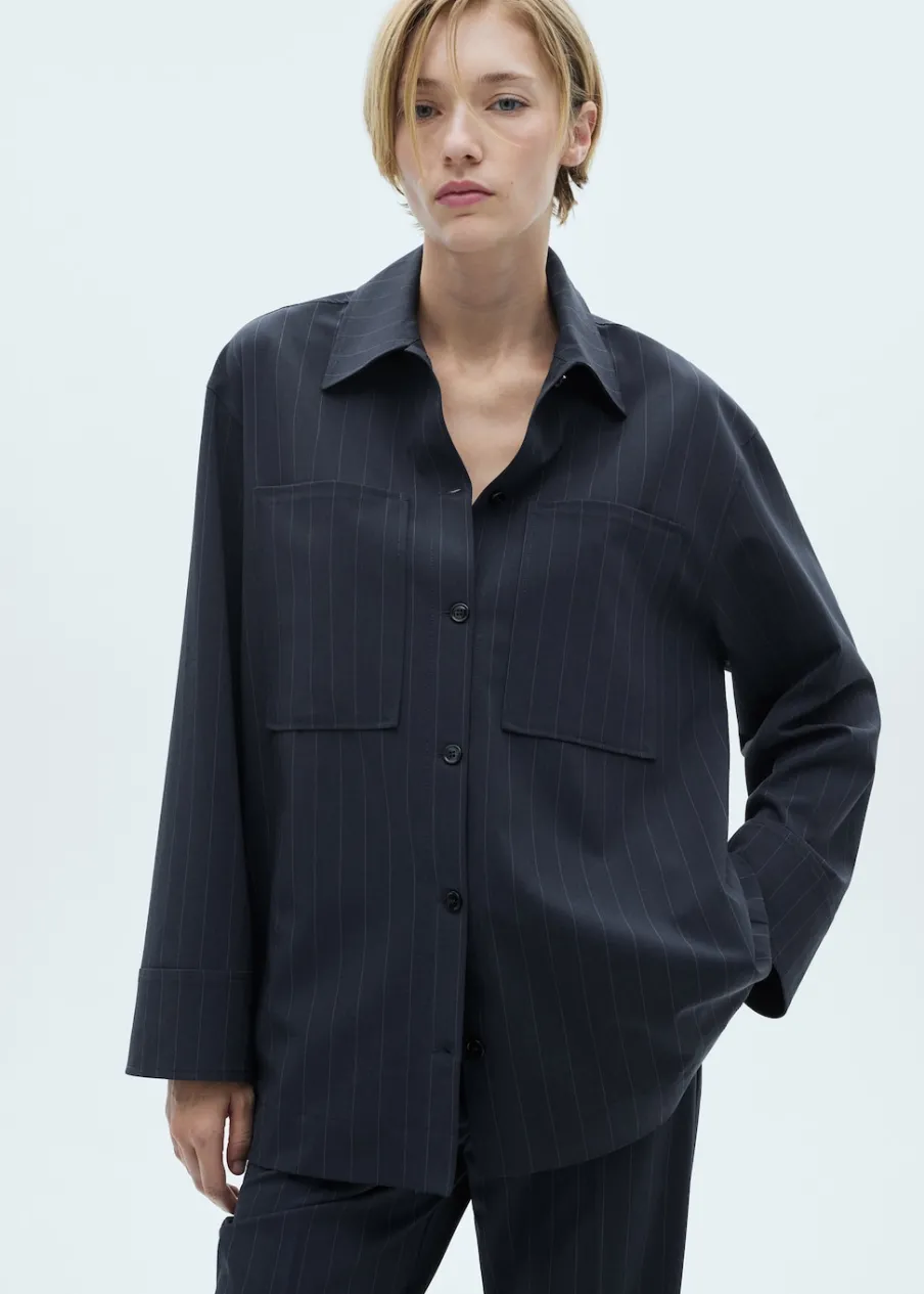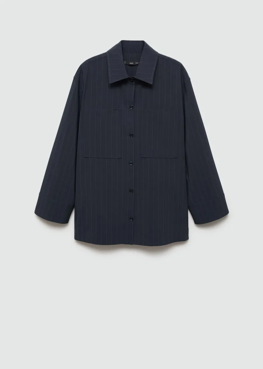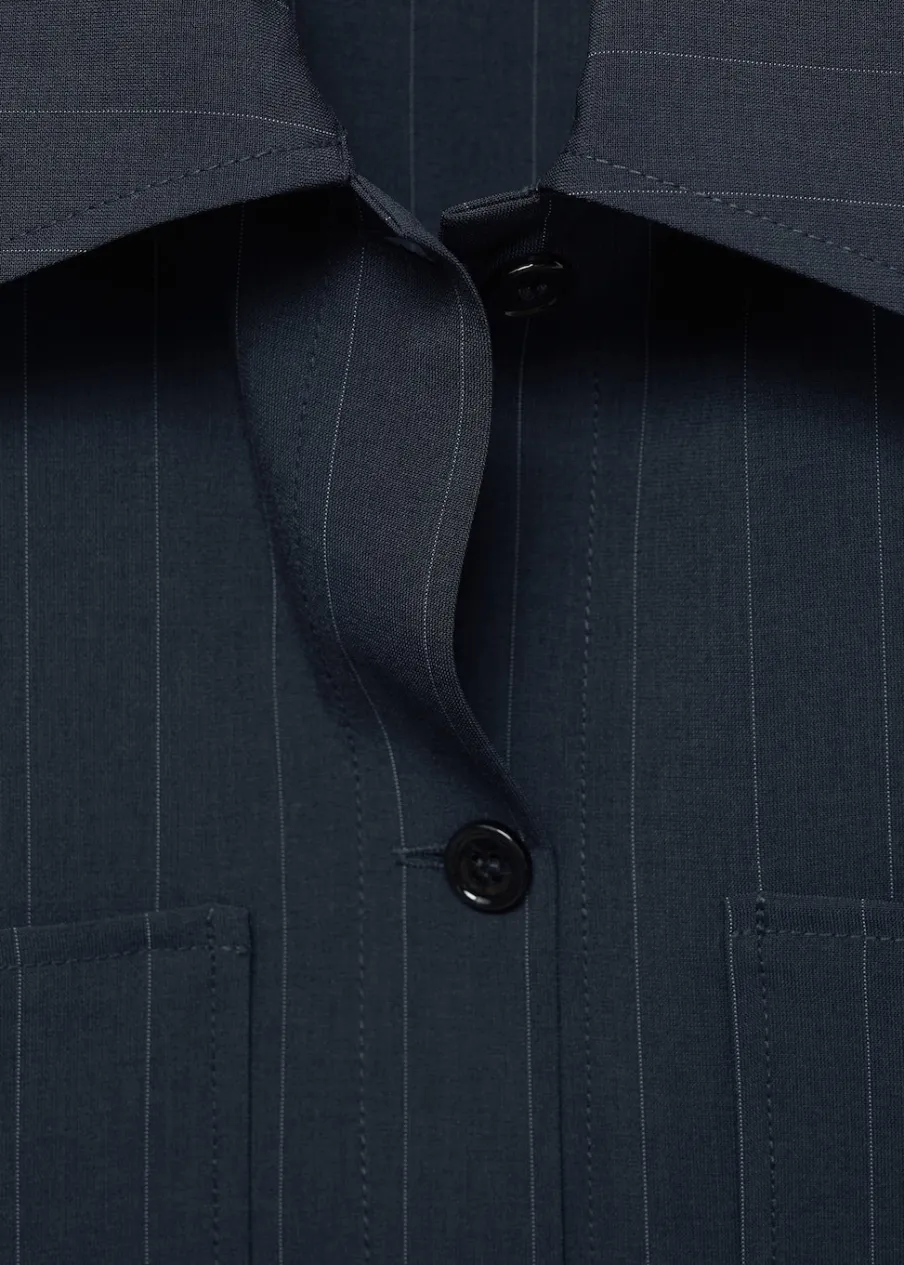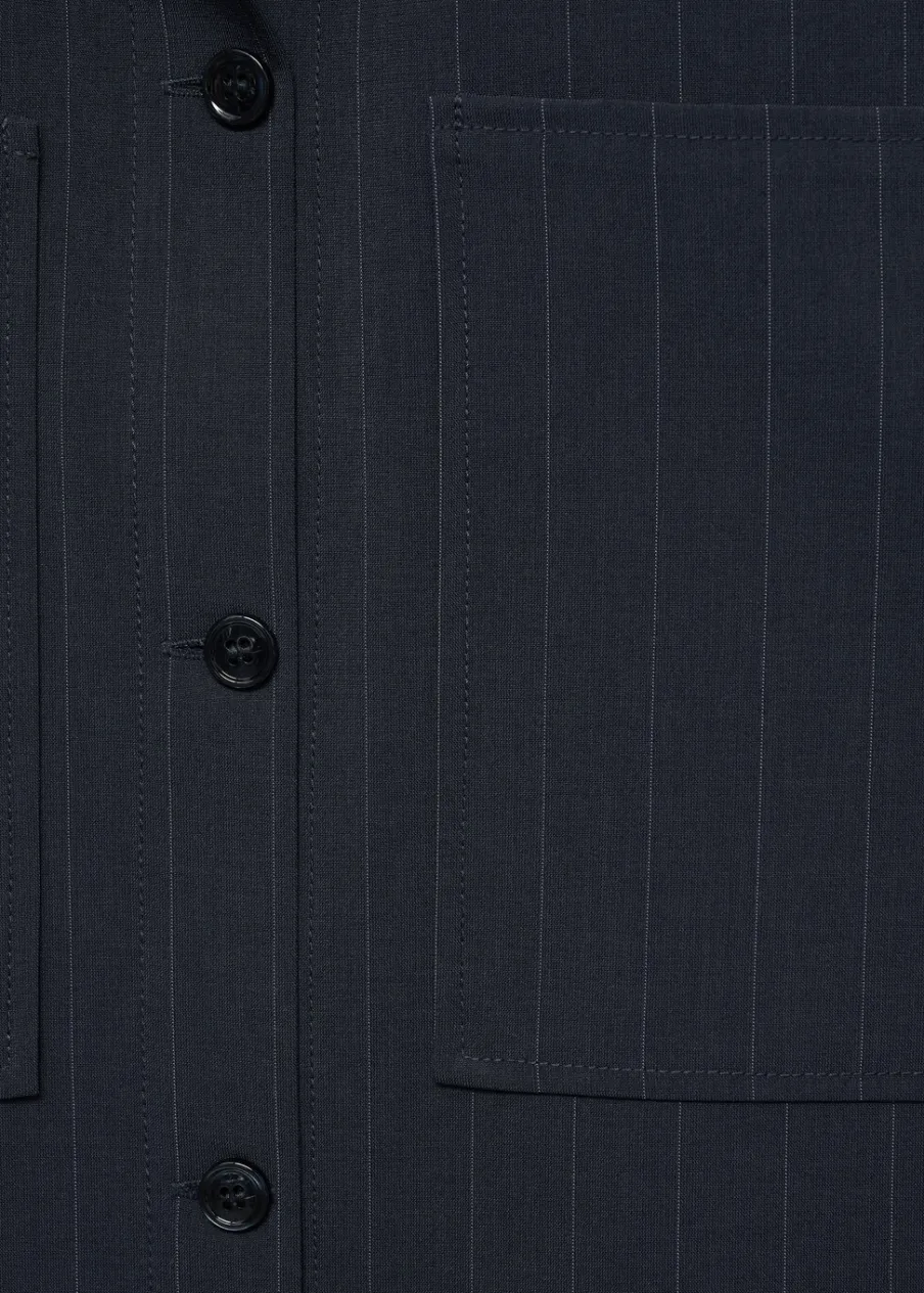 Deseń w prążki. Model prosty. Koszulowy kołnierz. Długi rękaw. Dwie kieszenie nakładane z przodu. Zapięcie z przodu na guziki. Total look. Modelka ma 181 cm wzrostu i nosi rozmiar S/36.