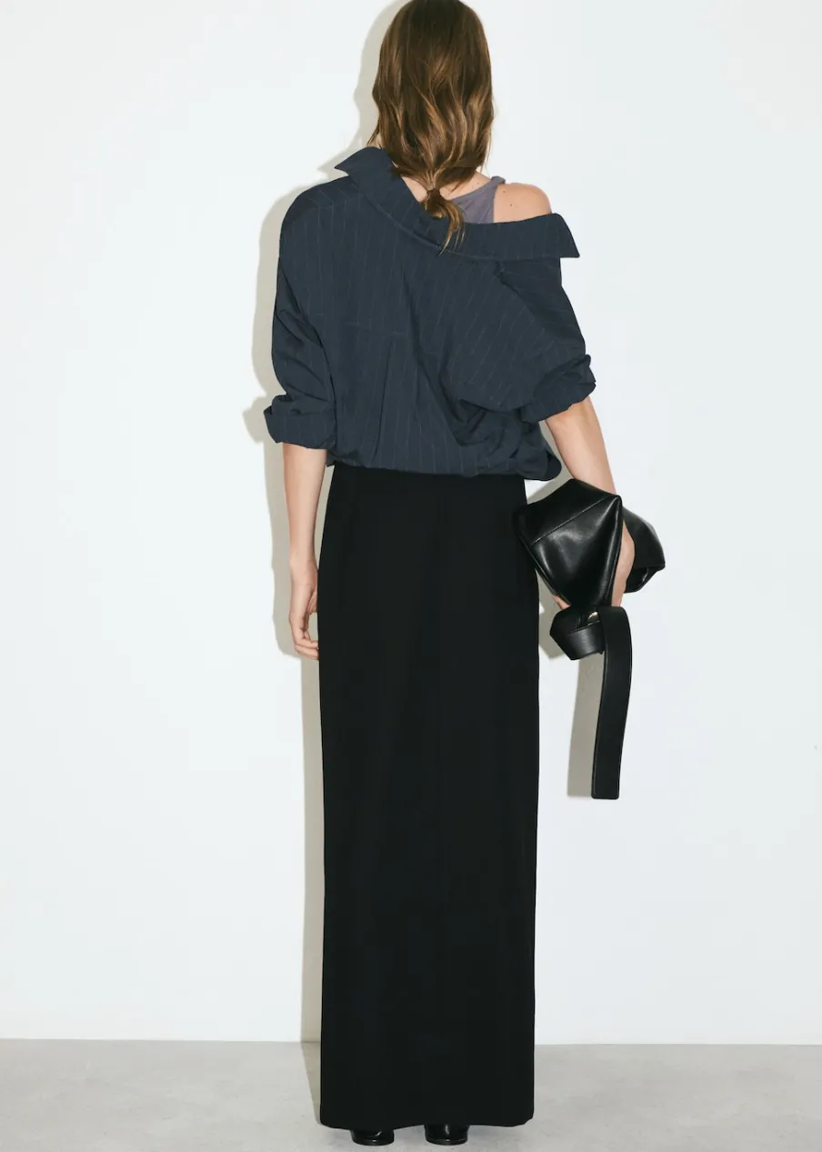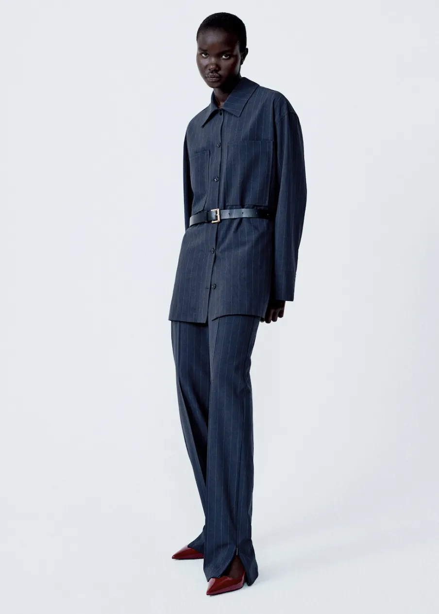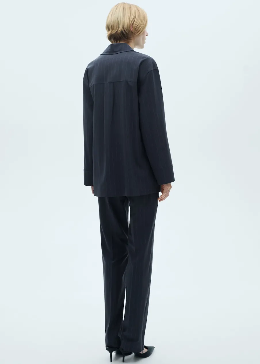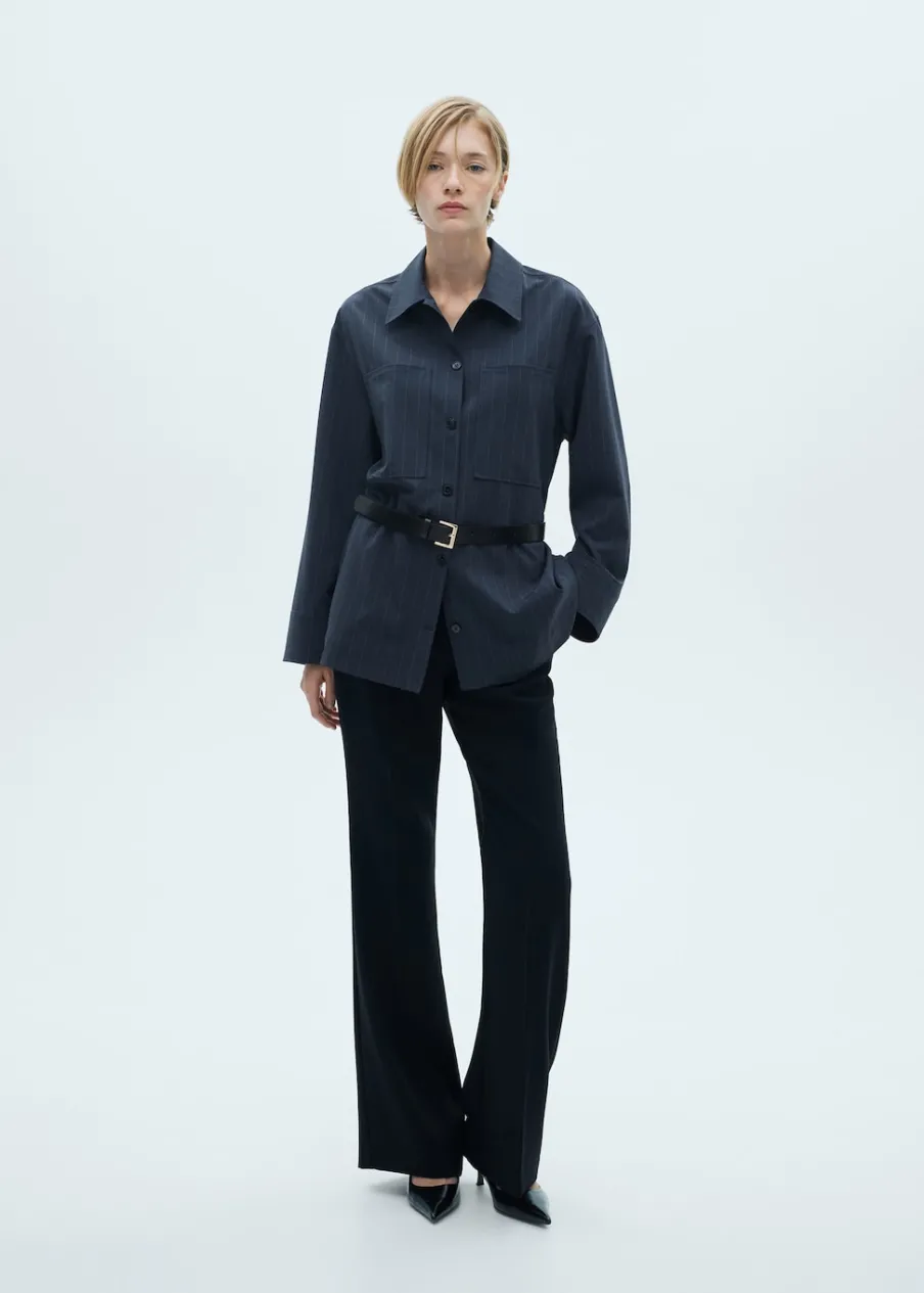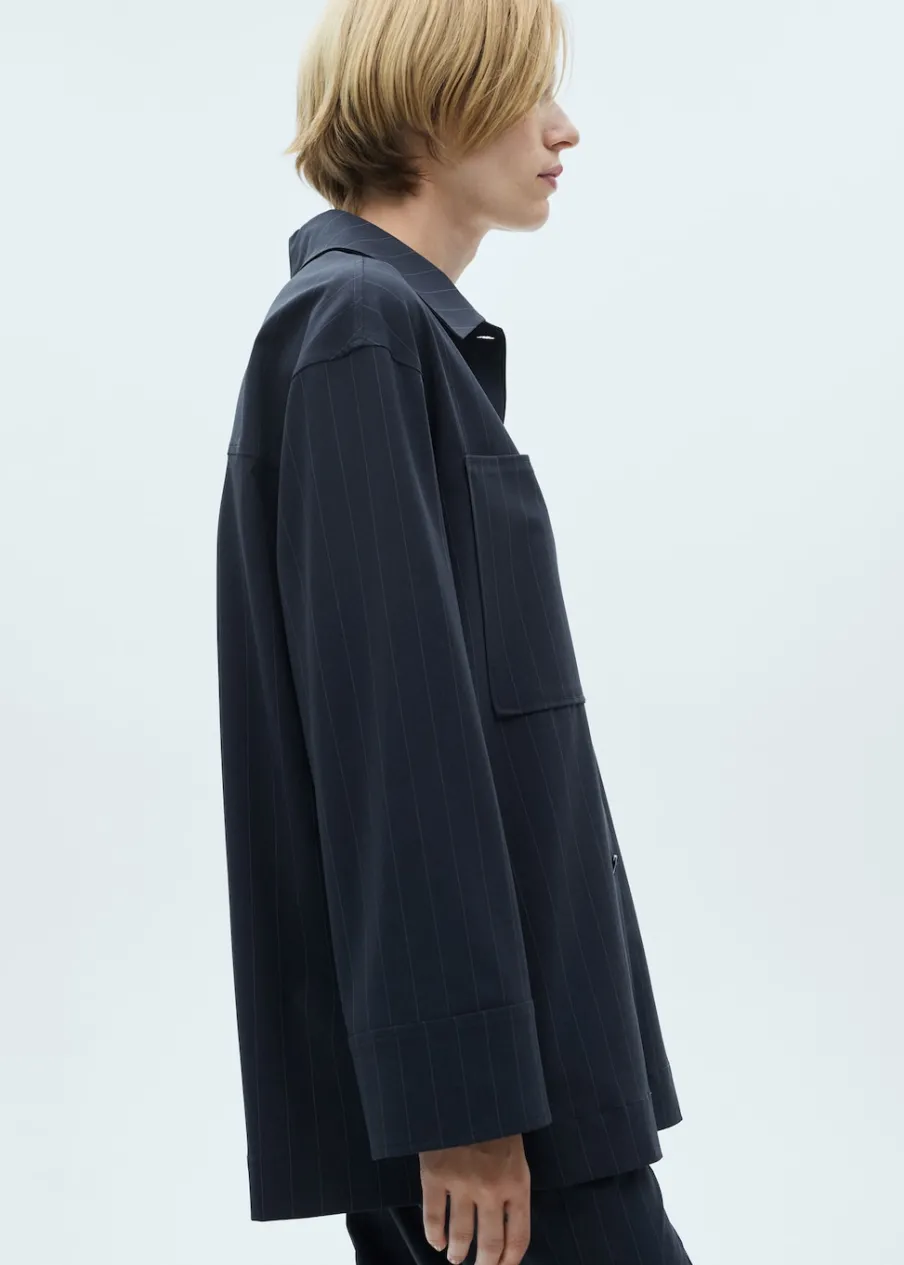 Deseń w prążki. Model prosty. Koszulowy kołnierz. Długi rękaw. Dwie kieszenie nakładane z przodu. Zapięcie z przodu na guziki. Total look. Modelka ma 181 cm wzrostu i nosi rozmiar S/36.