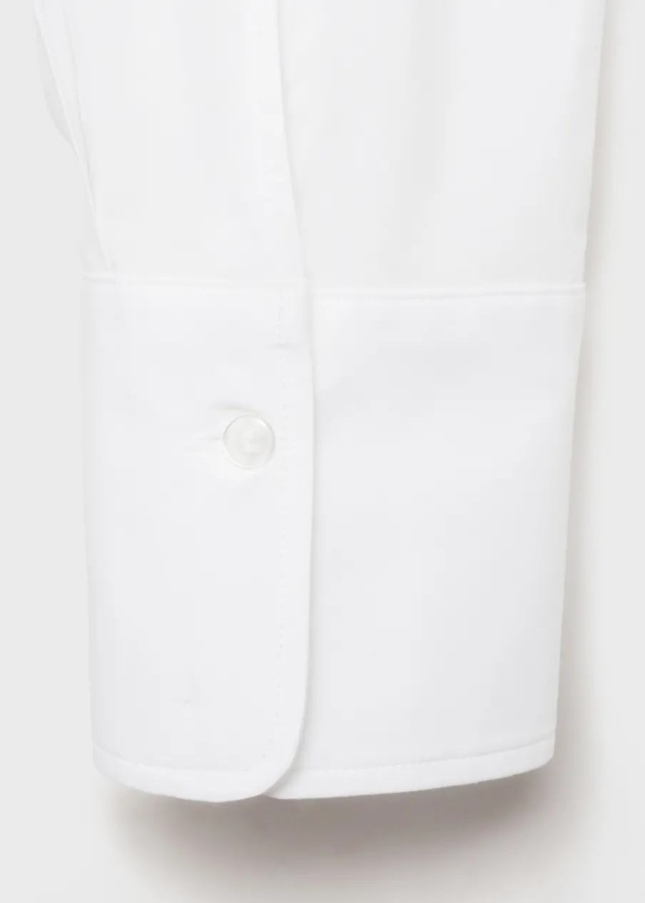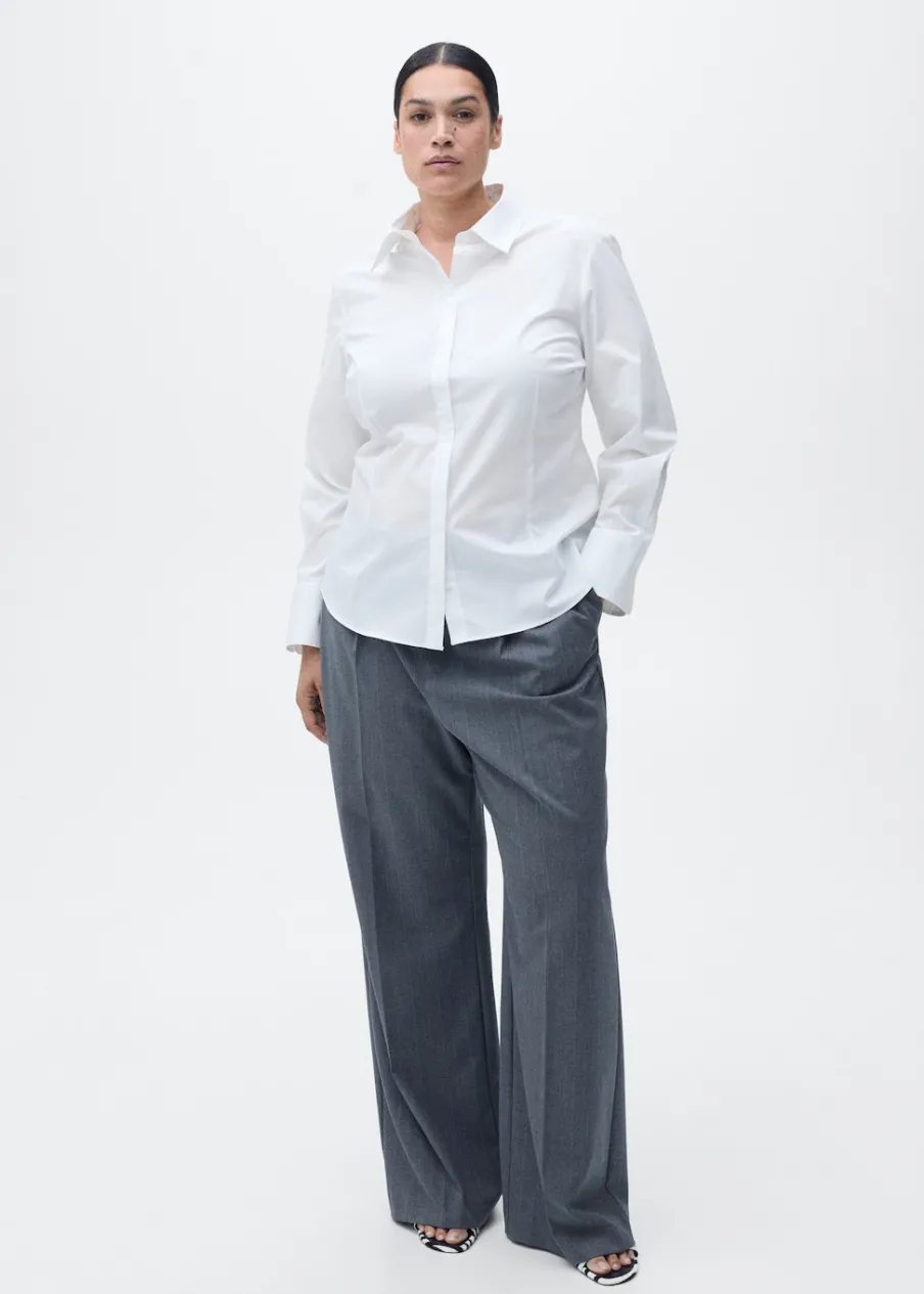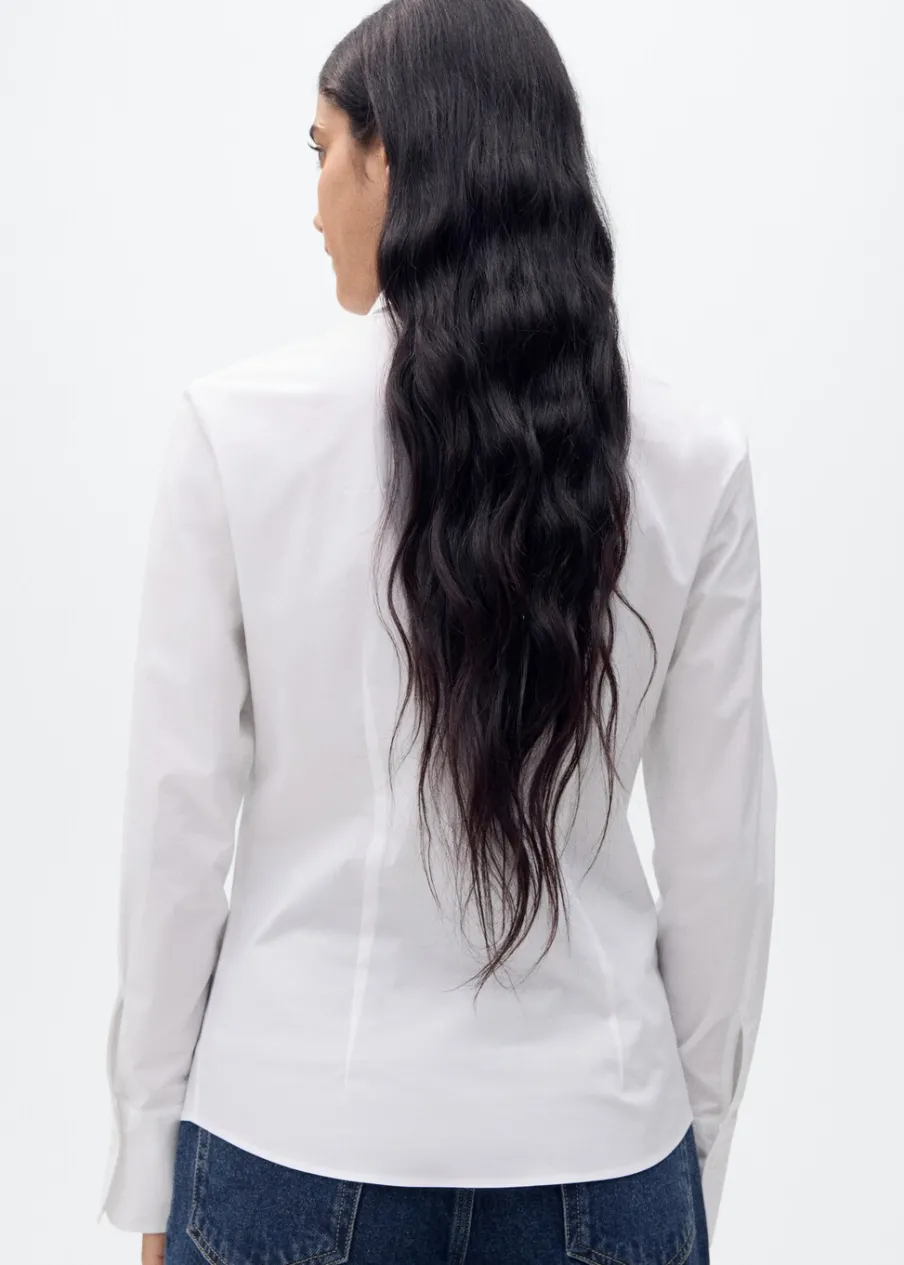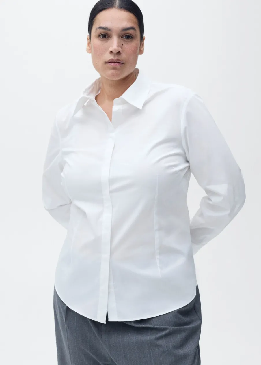 Bawełniana tkanina. Model wcięty. Slim-fit. Fason garniturowy. Koszulowy kołnierz. Długi rękaw z guzikami na mankietach. Zapięcie z przodu na guziki. Detal z zakładkami. Wyłącznie online. Dostępne w Plus Size. Stylizacje biurowe.