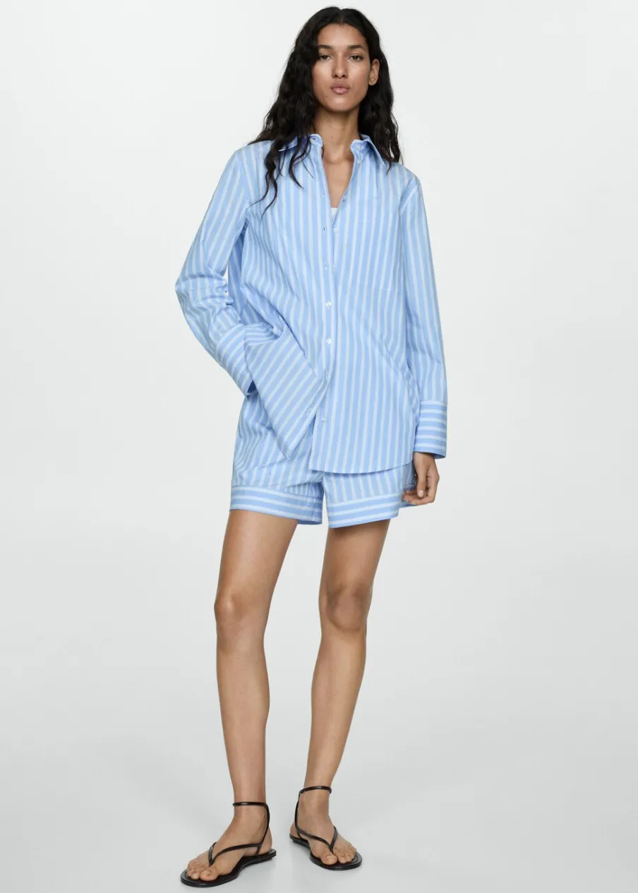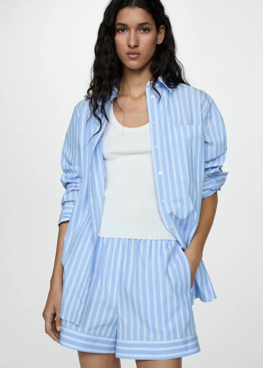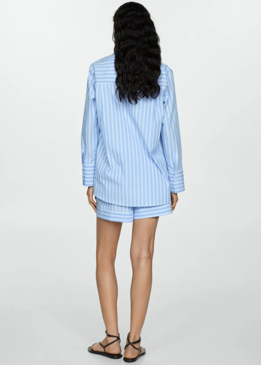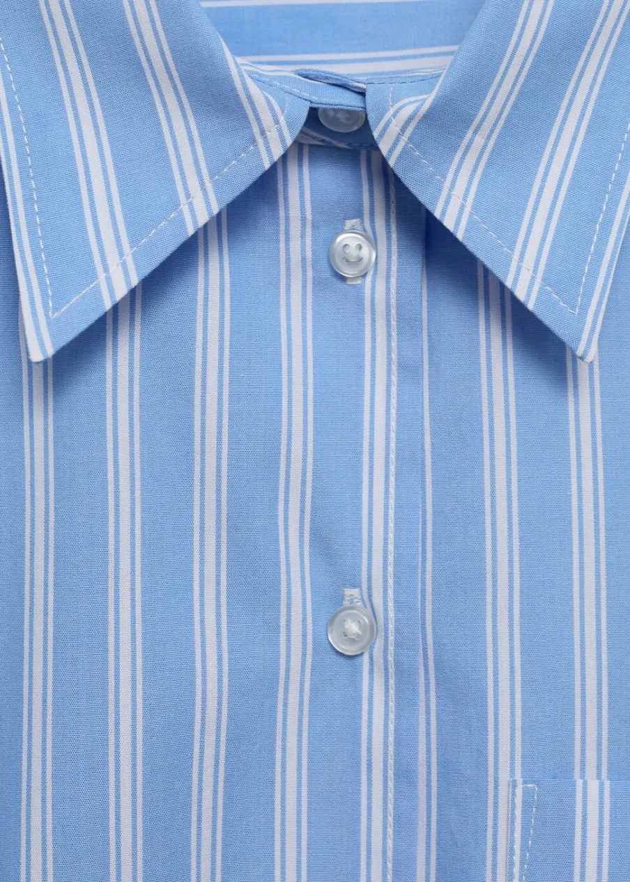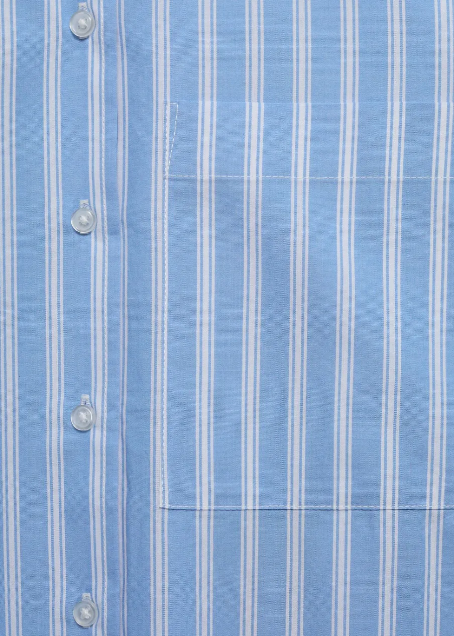 Model prosty. Wzór w pasy. Koszulowy kołnierz. Długi rękaw. Nakładana kieszeń przednia. Total look. Zapięcie na guziki z przodu. Tkanina z 100% bawełny.
