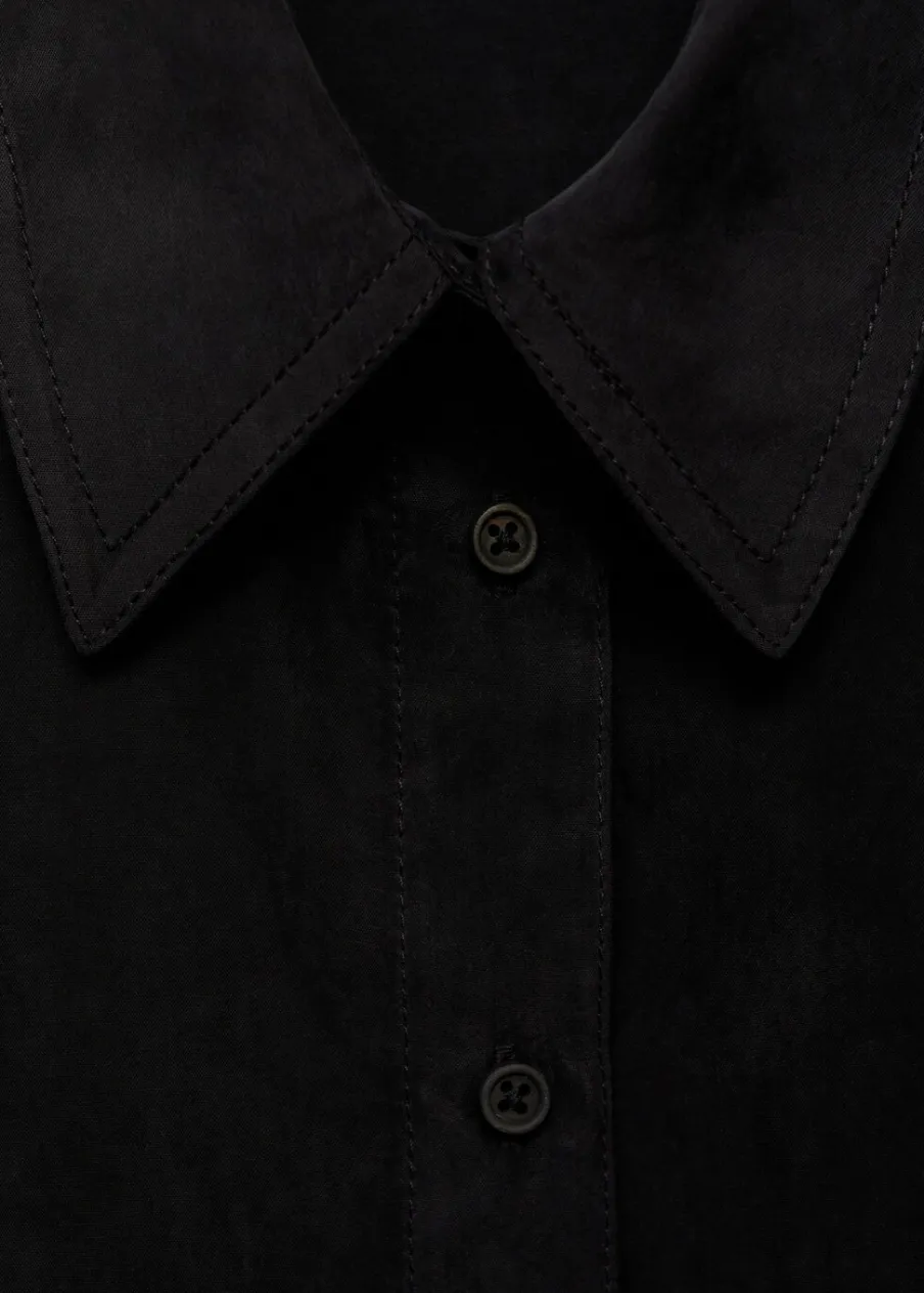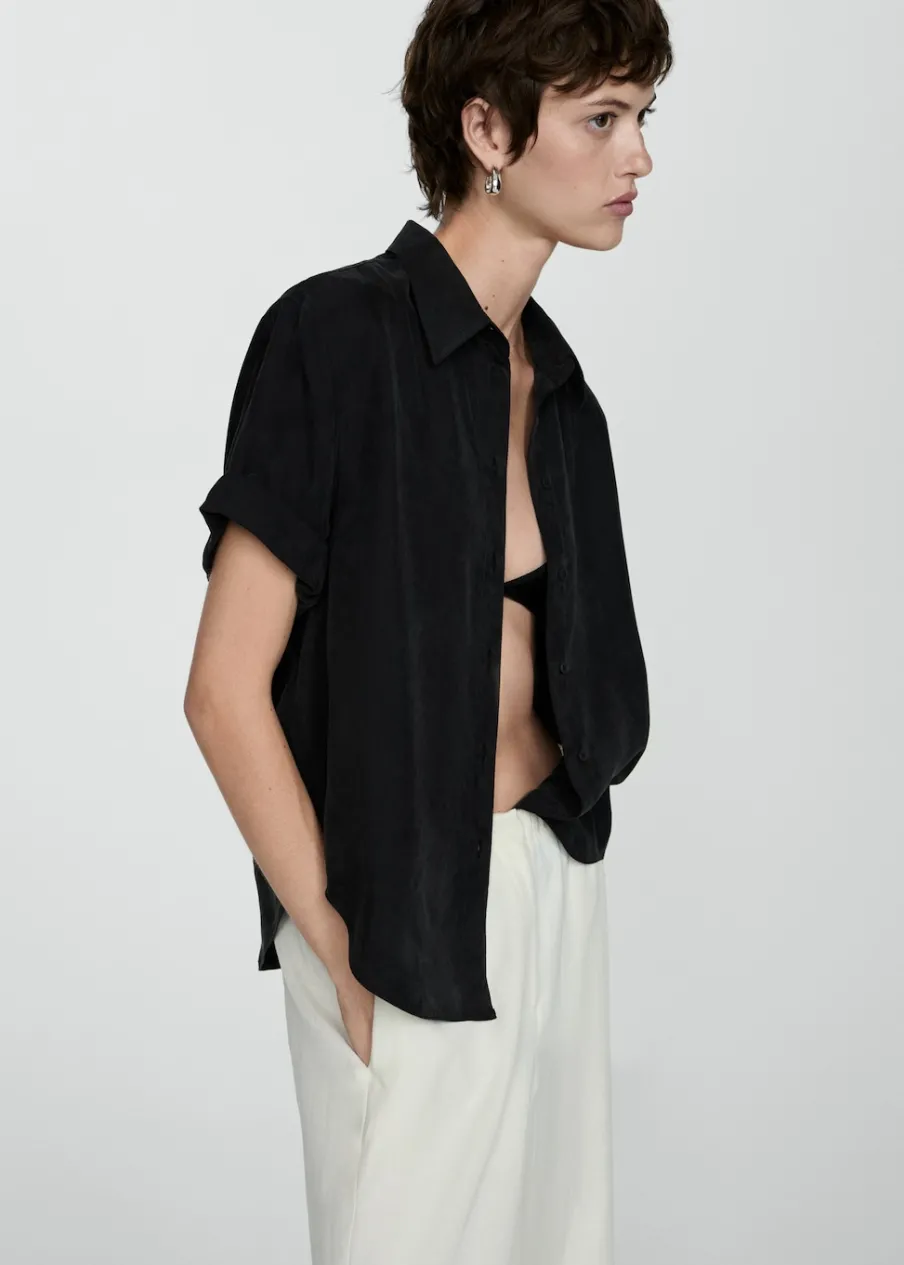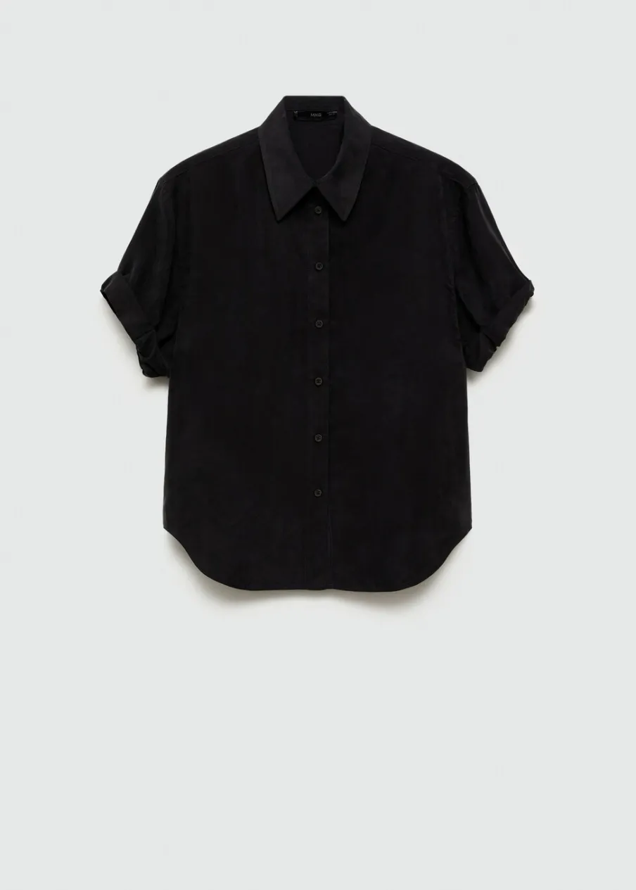 Tkanina z mieszanki włókna cupro. Model prosty. Koszulowy kołnierz. Krótki rękaw z guzikiem. Total look. Modelka ma 178 cm wzrostu i nosi rozmiar S/36. Zapięcie na guziki z przodu.