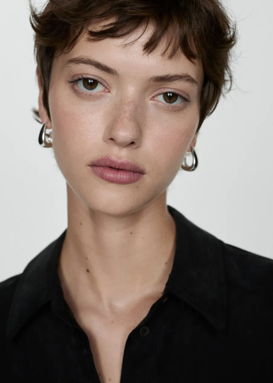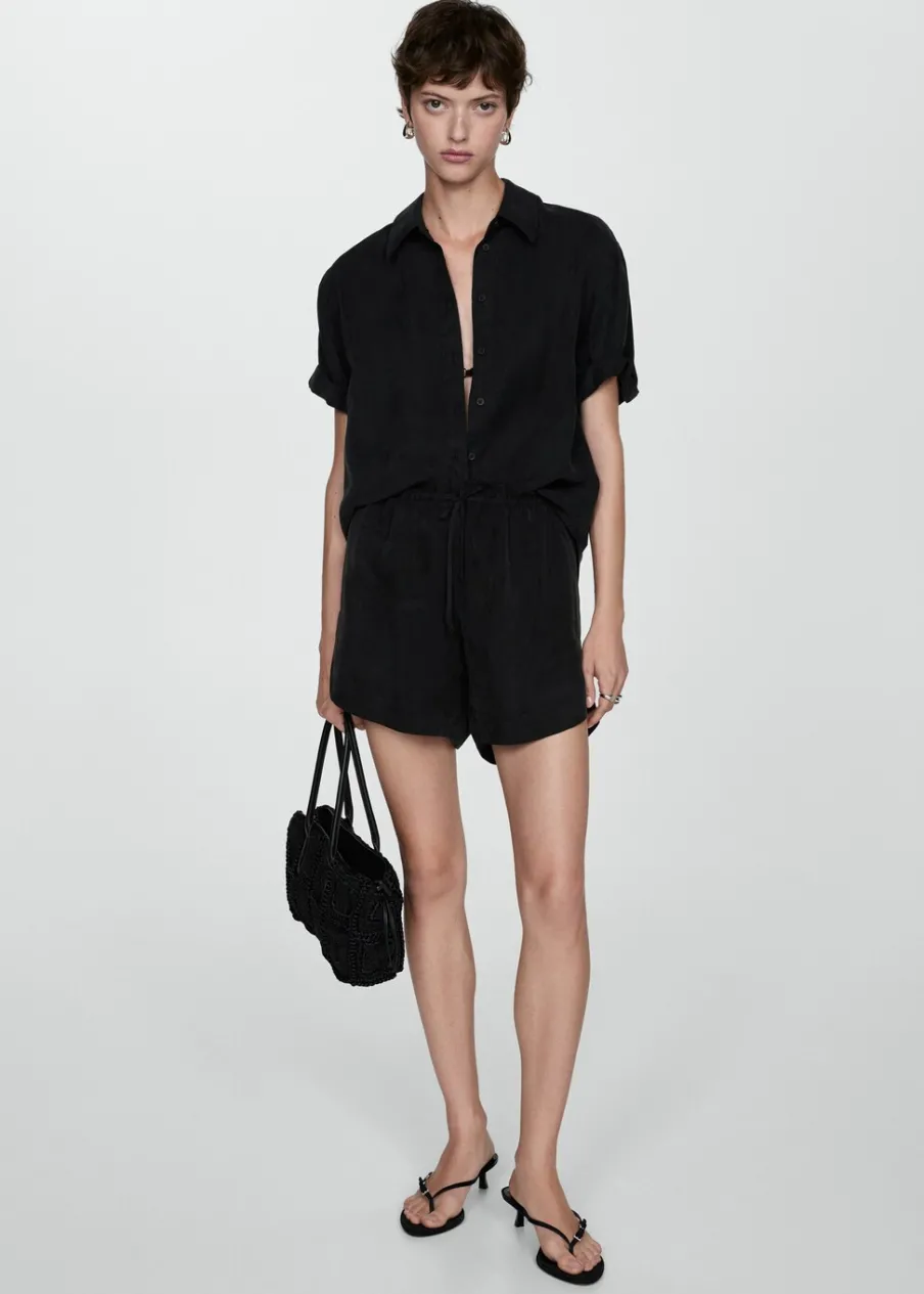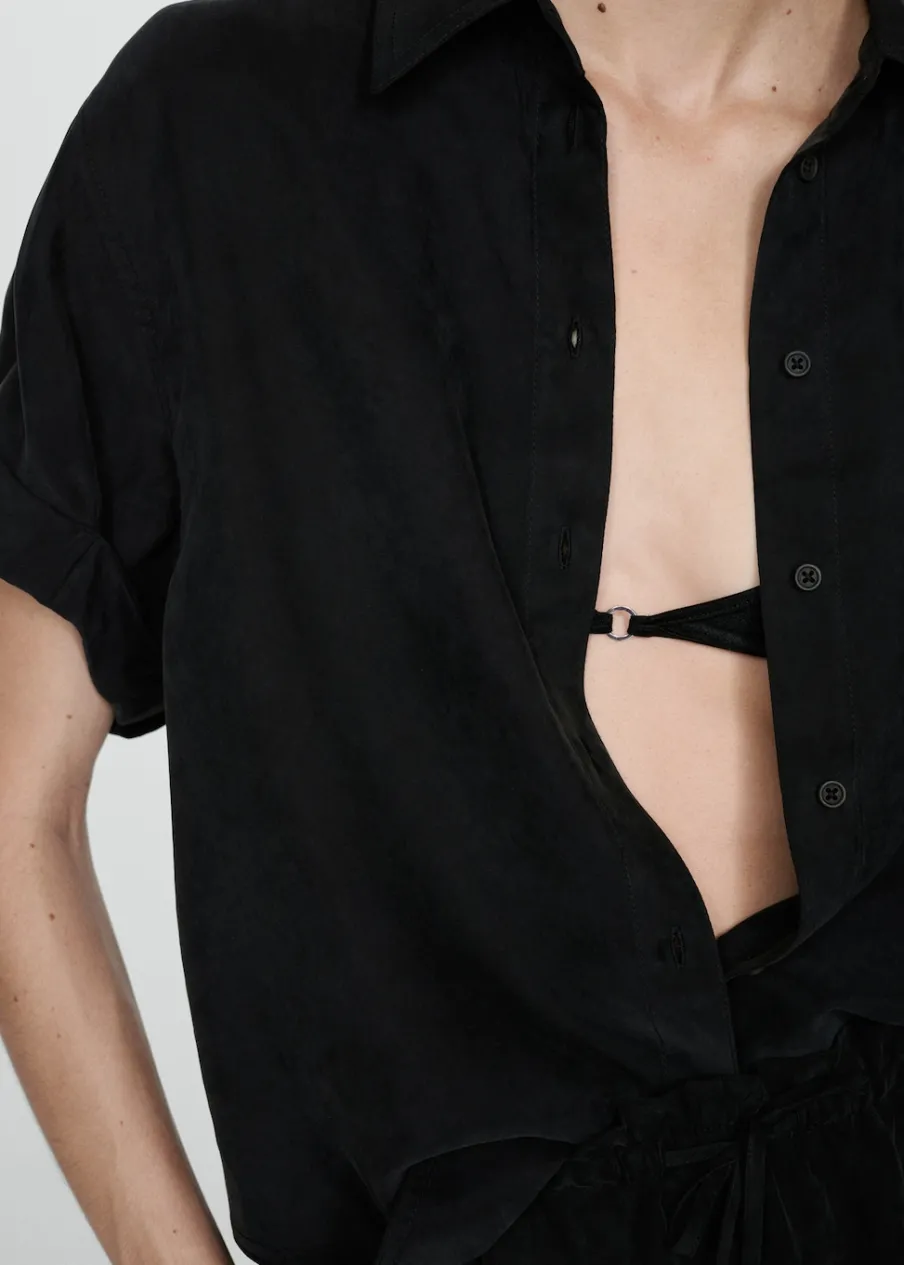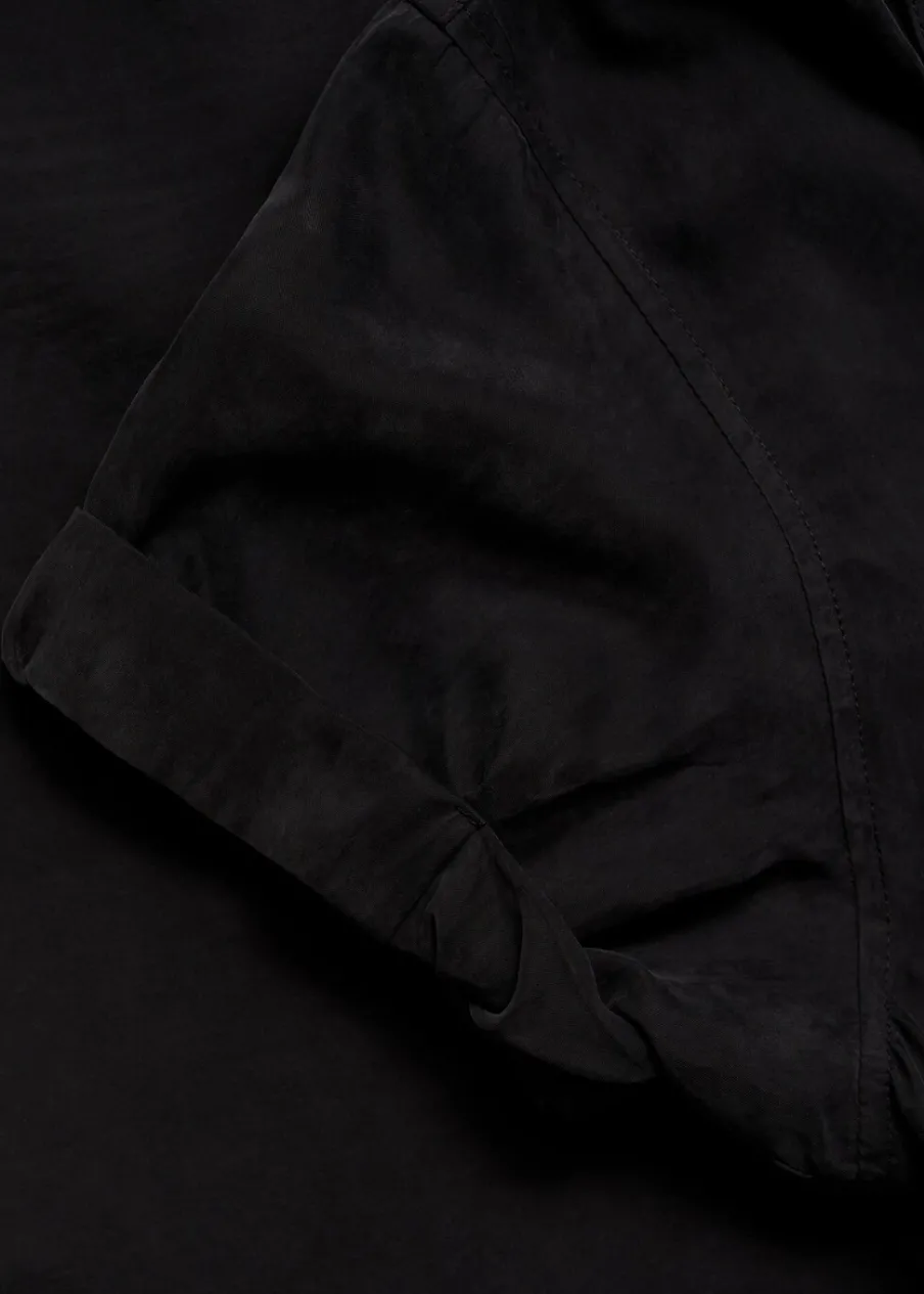 Tkanina z mieszanki włókna cupro. Model prosty. Koszulowy kołnierz. Krótki rękaw z guzikiem. Total look. Modelka ma 178 cm wzrostu i nosi rozmiar S/36. Zapięcie na guziki z przodu.
