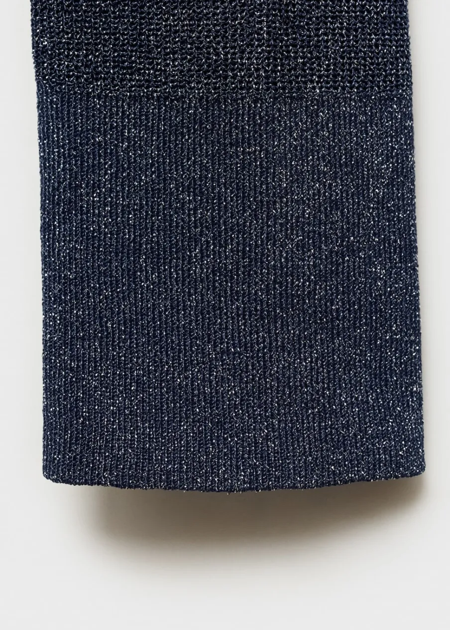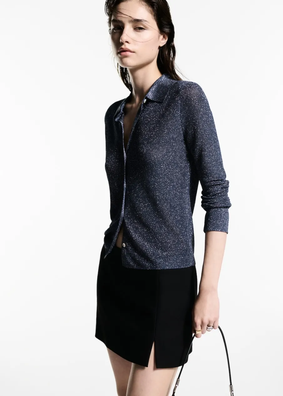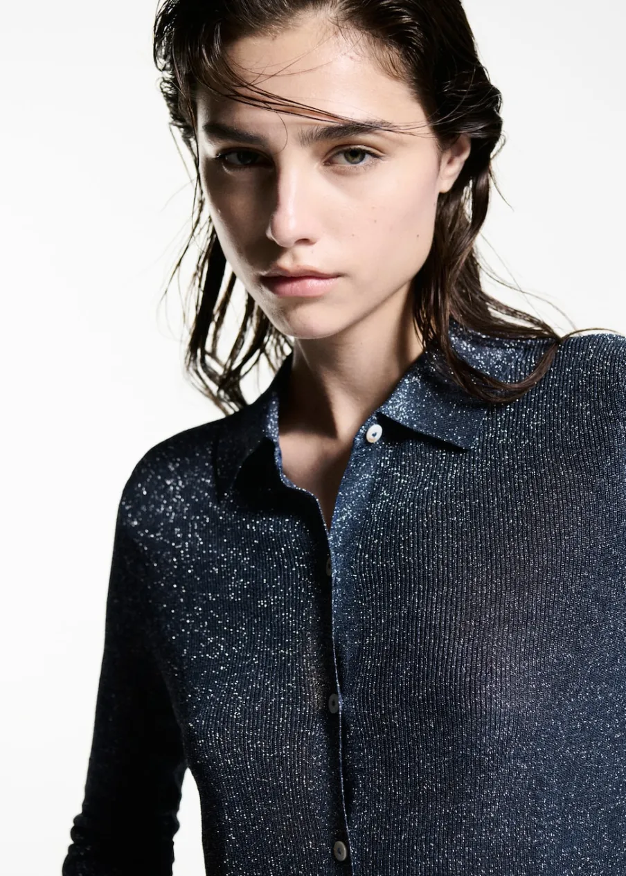 Tkanina z cienkiej dzianiny. Tkanina lureks. Model wcięty. Koszulowy kołnierz. Długi rękaw. Zapięcie z przodu na guziki. Kolekcja wizytowa. Modelka ma 177 cm wzrostu i nosi rozmiar S/36.