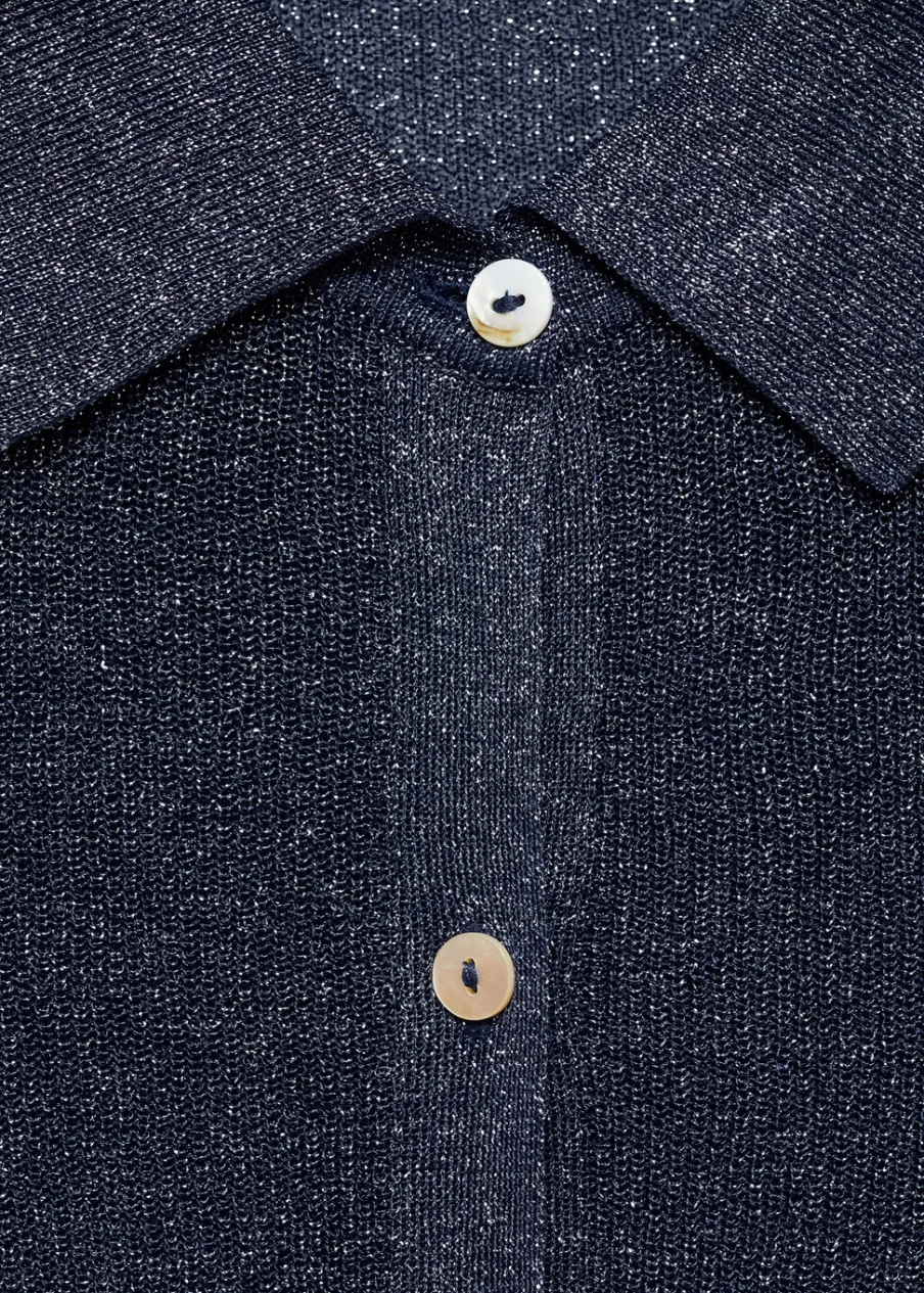 OpisTkanina z cienkiej dzianiny. Tkanina lureks. Model wcięty. Koszulowy kołnierz. Długi rękaw. Zapięcie z przodu n…