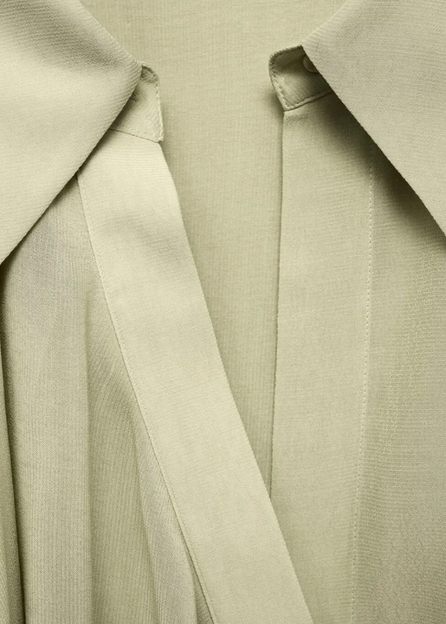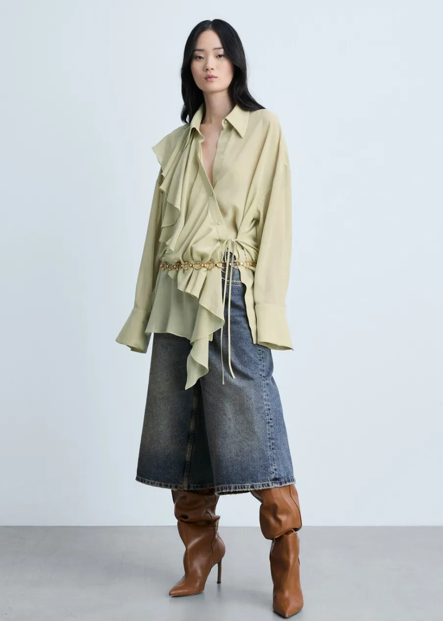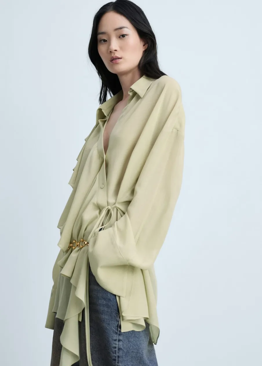 Szyfonowa tkanina. Lejąca tkanina. Model oversize. Model długi. Model prosty. Koszulowy kołnierz. Długi rękaw z guzikami na mankietach. Dwurzędowe zapięcie na guziki z przodu. Sznurek wiązany na krzyż. Detal z falbaną.
