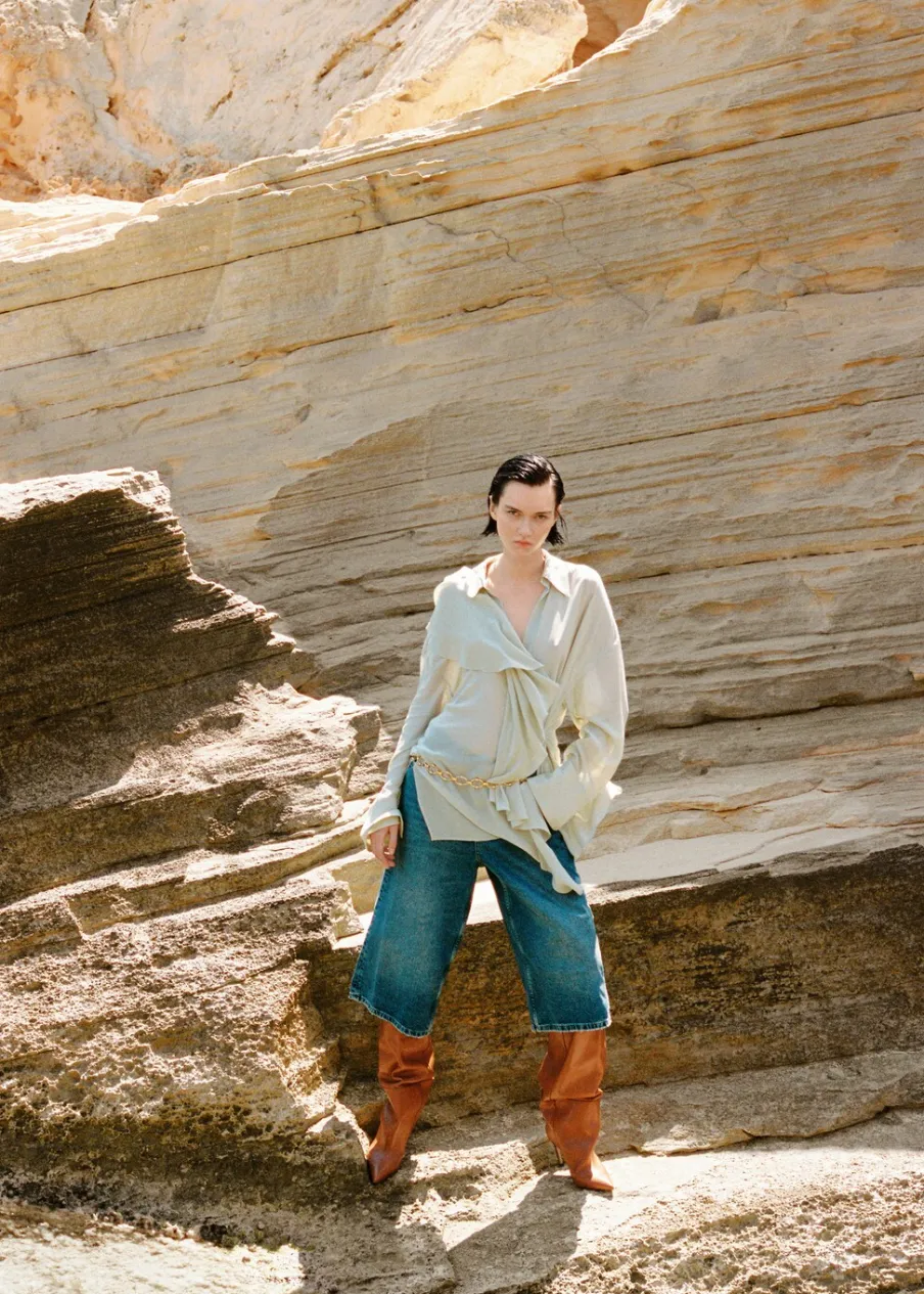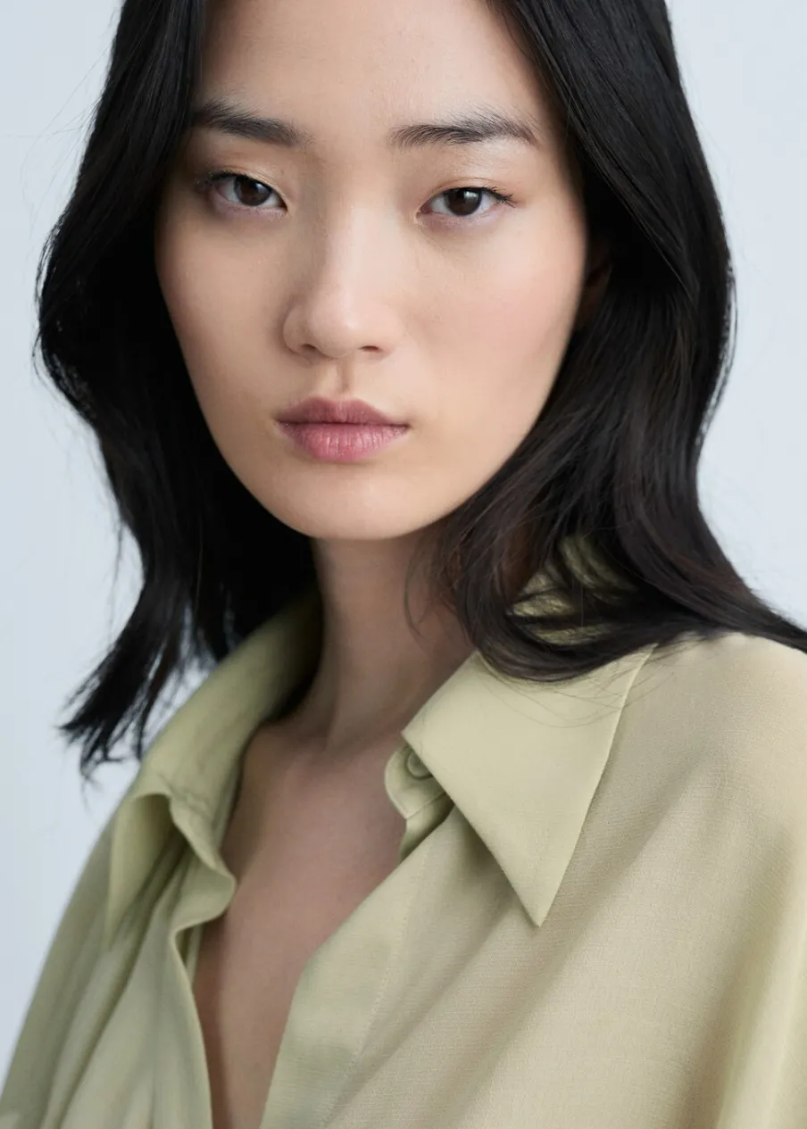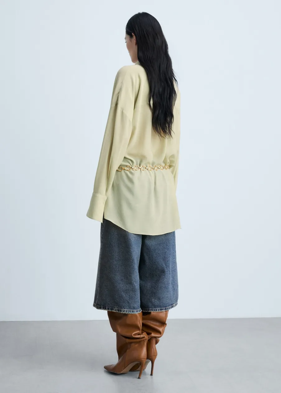 OpisSzyfonowa tkanina. Lejąca tkanina. Model oversize. Model długi. Model prosty. Koszulowy kołnierz. Długi rękaw z…