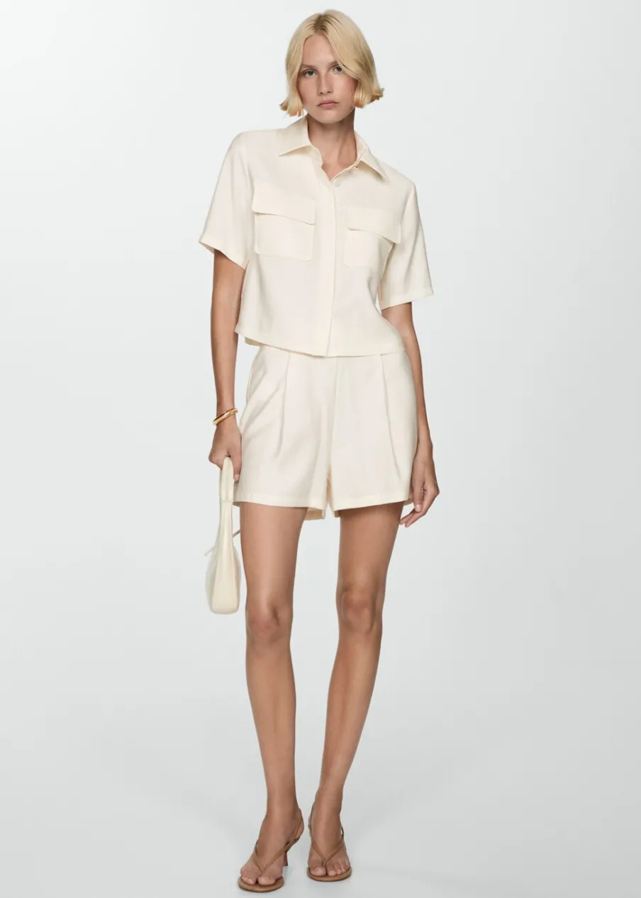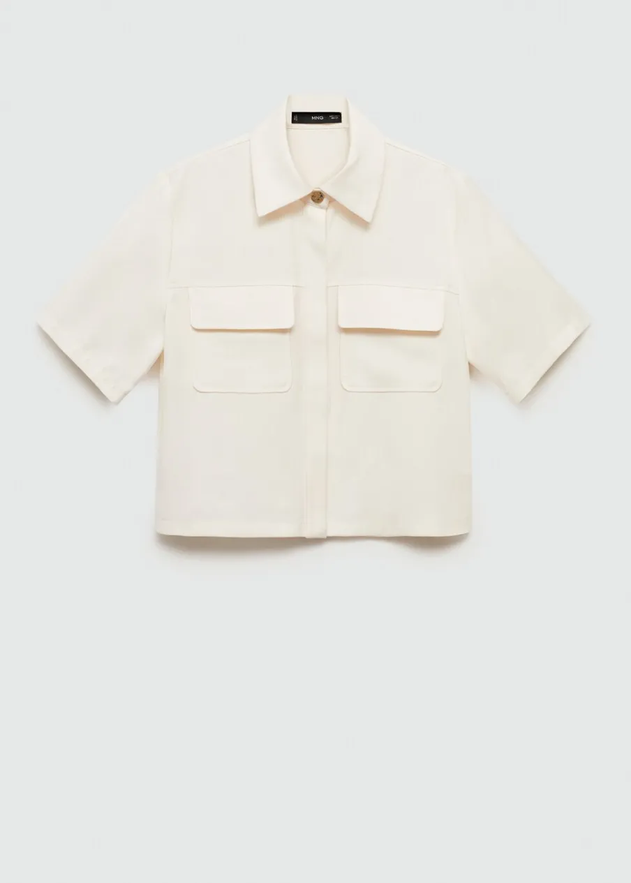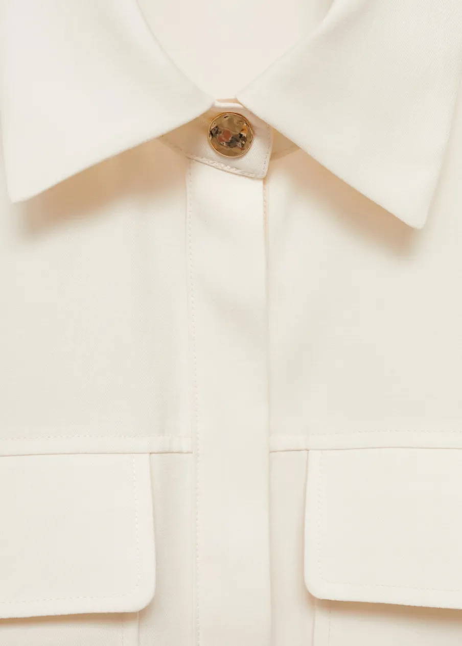 Lejąca tkanina. Model prosty. Koszulowy kołnierz. Krótki rękaw. Dwie kieszenie z patką na piersi. Total look. Kryte zapięcie na guziki z przodu.