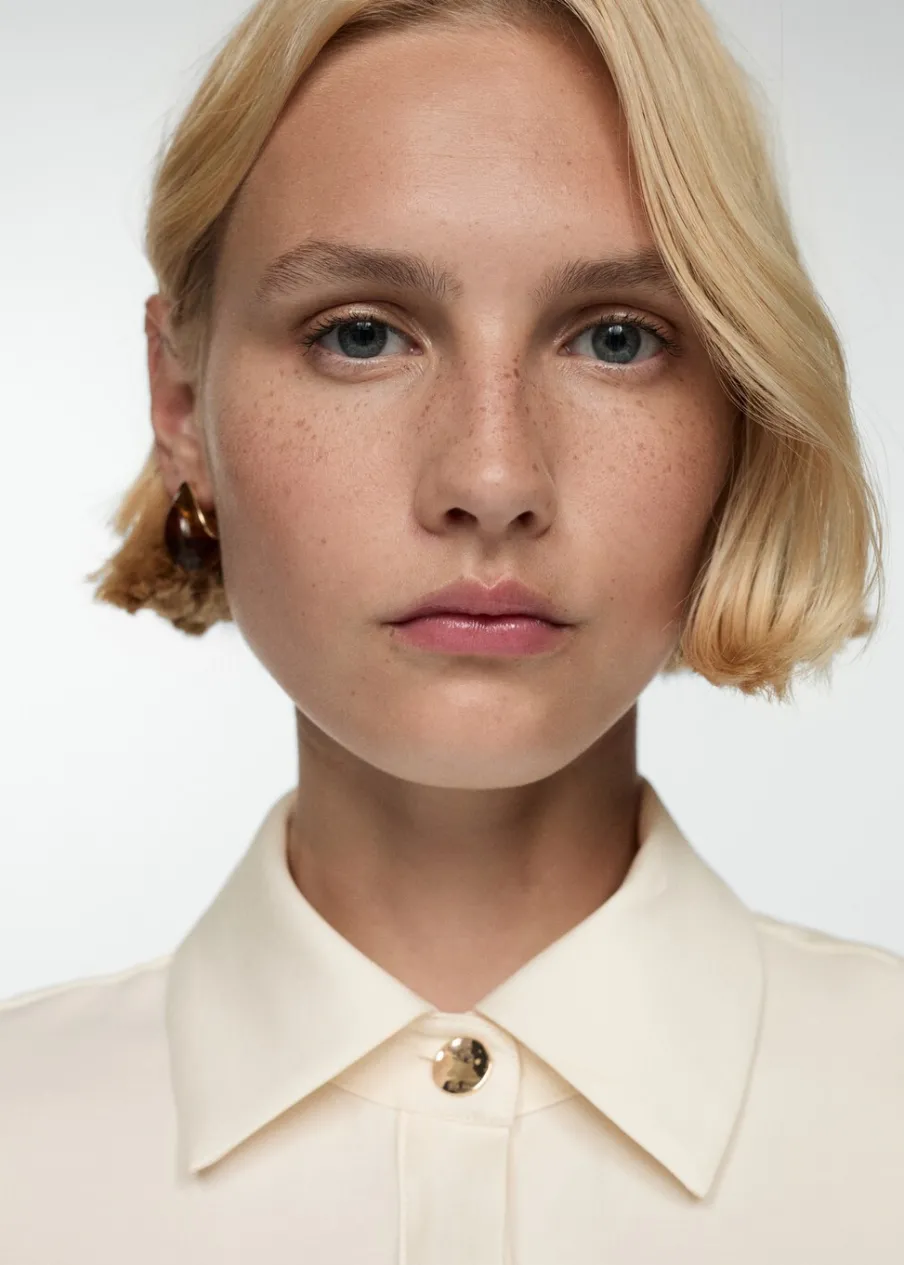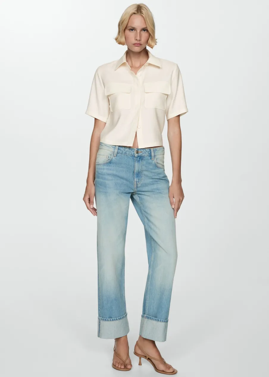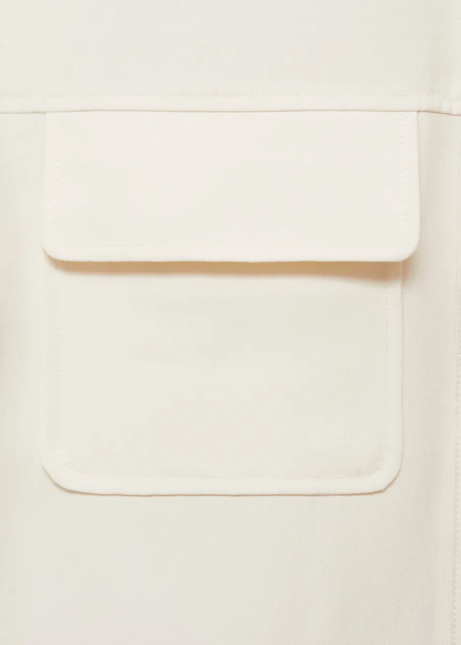 Lejąca tkanina. Model prosty. Koszulowy kołnierz. Krótki rękaw. Dwie kieszenie z patką na piersi. Total look. Kryte zapięcie na guziki z przodu.