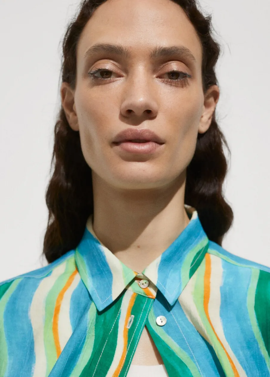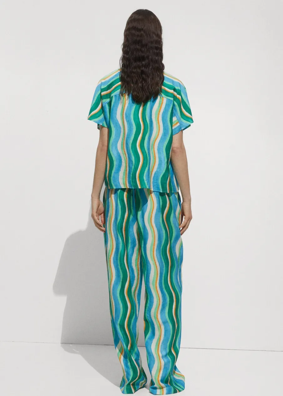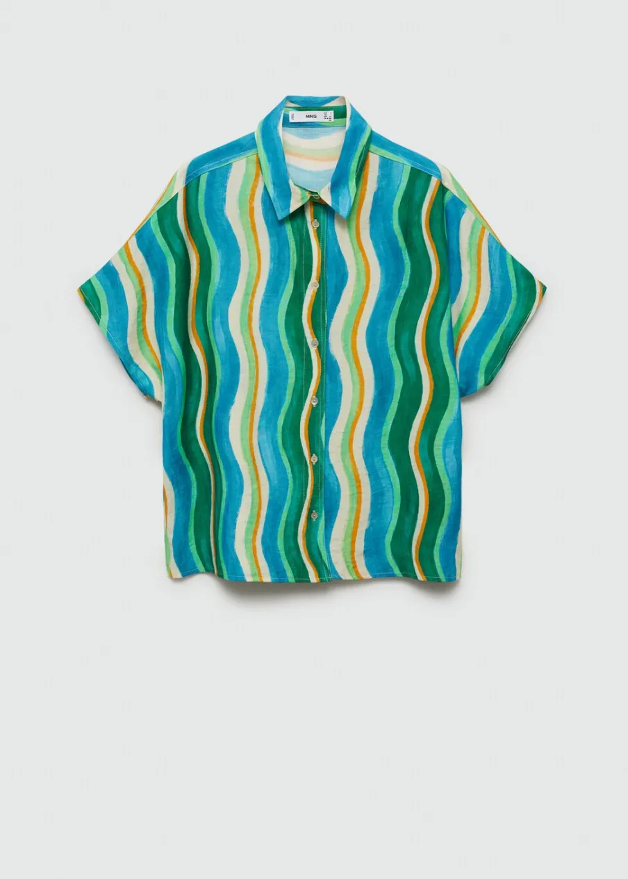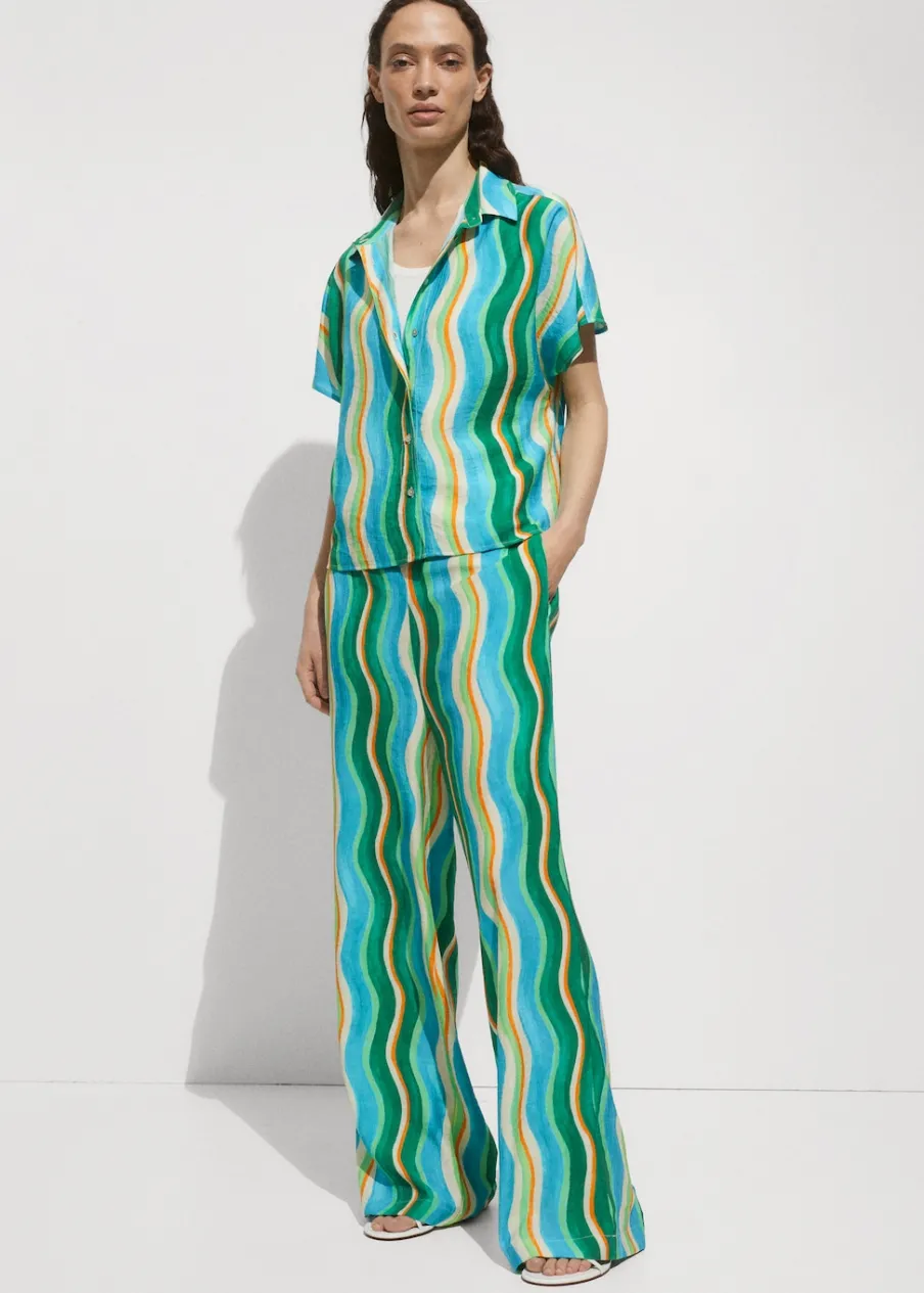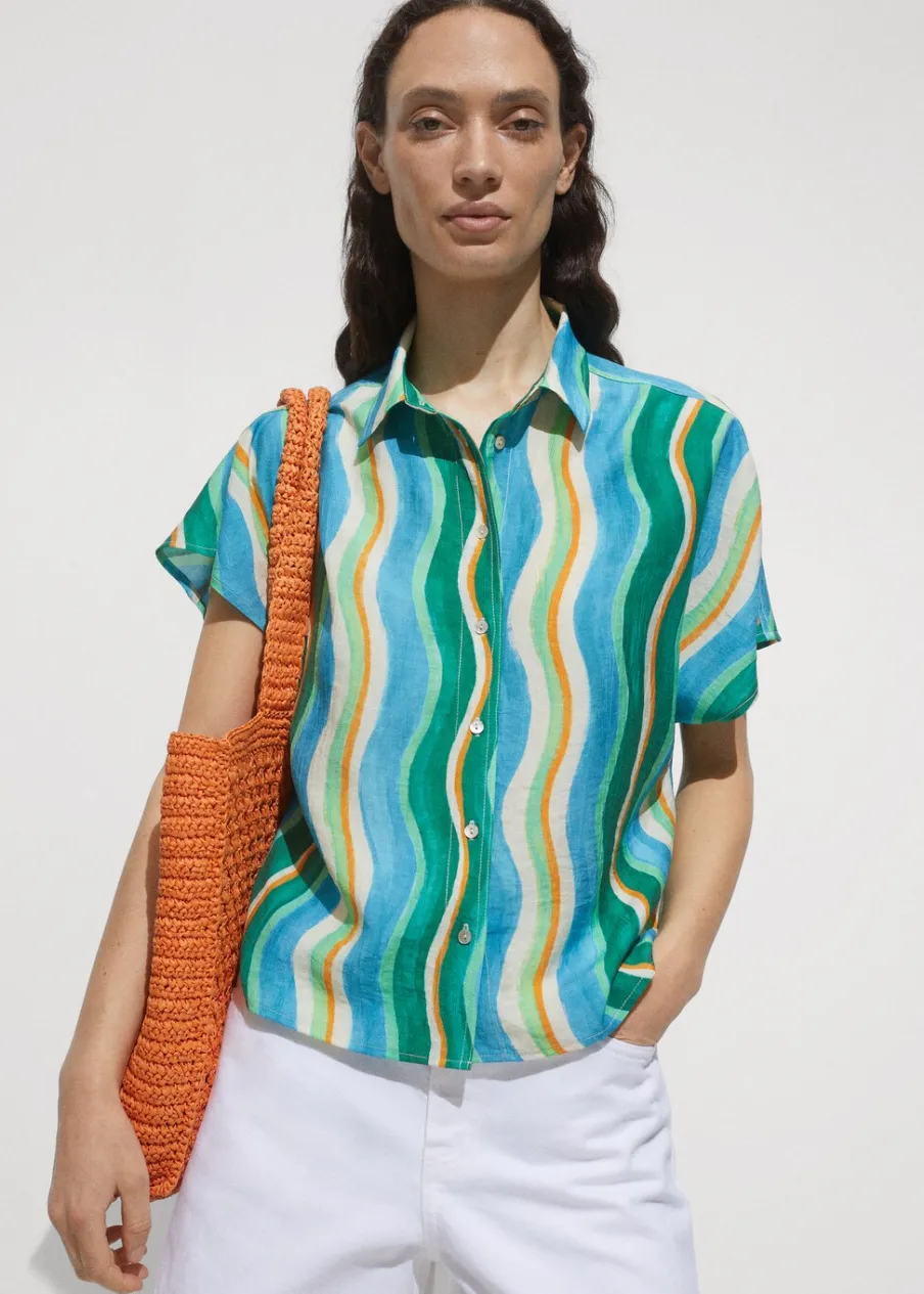 Lejąca tkanina. Model prosty. Koszulowy kołnierz. Krótki rękaw. Total look. Sezon festiwalowy. Zapięcie na guziki z przodu. Nadruk.