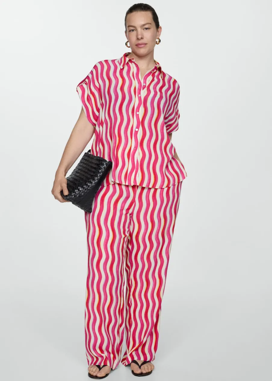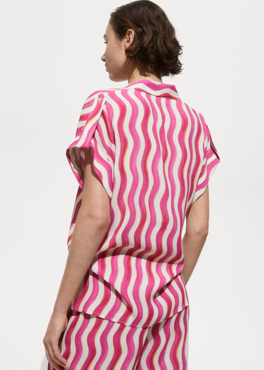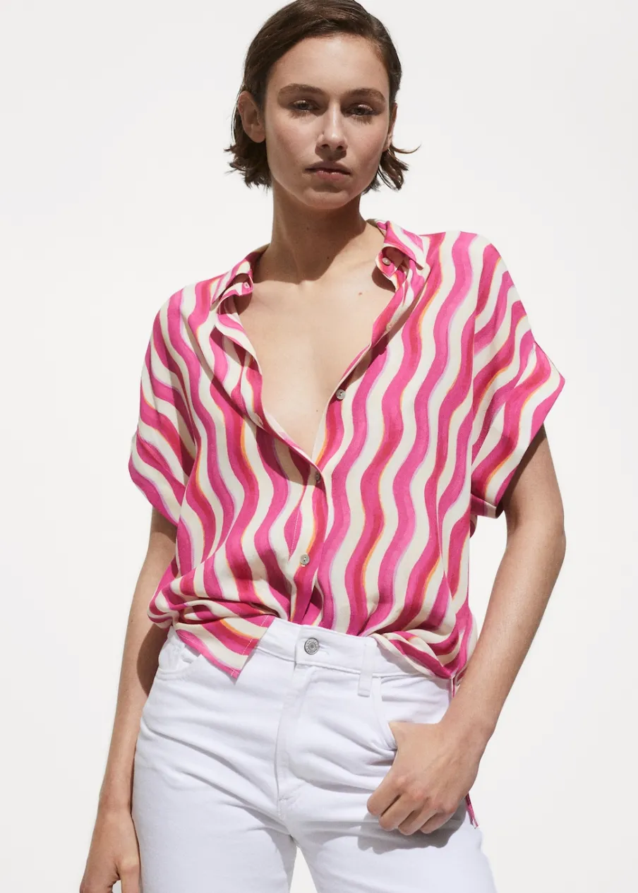 Lejąca tkanina. Model prosty. Koszulowy kołnierz. Krótki rękaw. Ozdobne guziki na rękawach. Dostępne w Plus Size. Total look. Sezon festiwalowy. Nadruk. Zapięcie na guziki z przodu.
